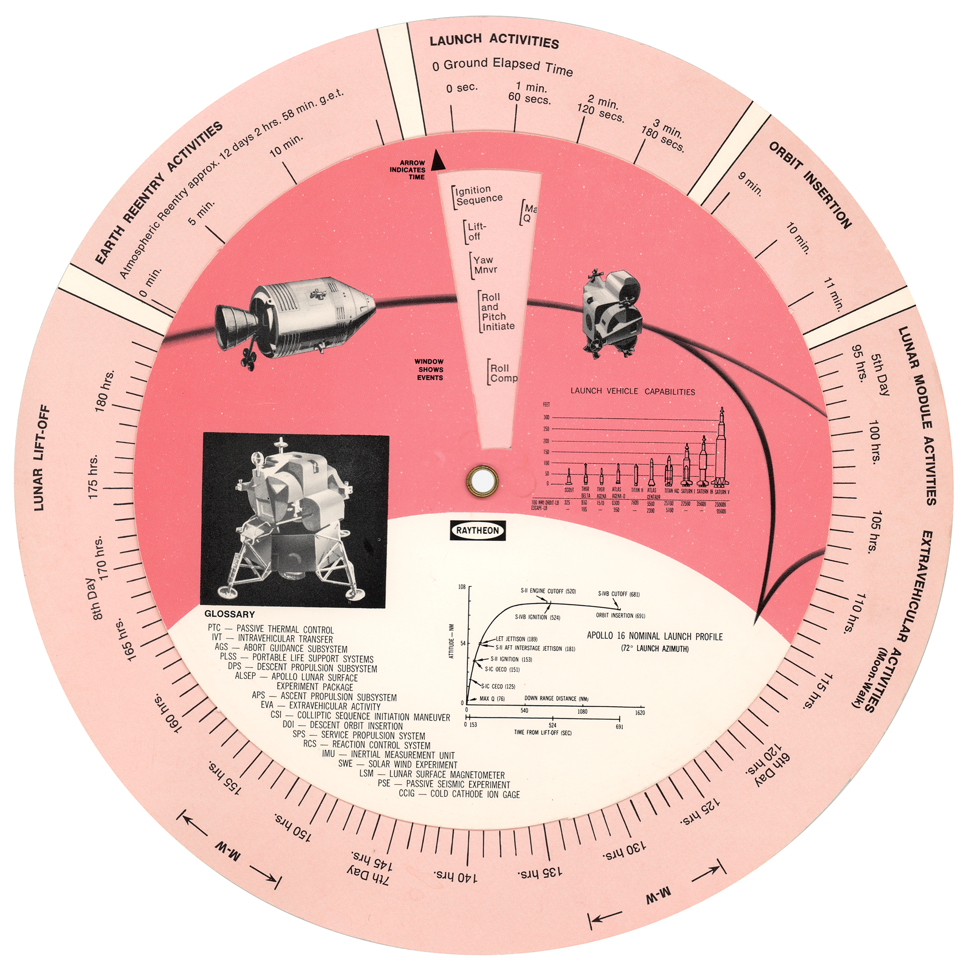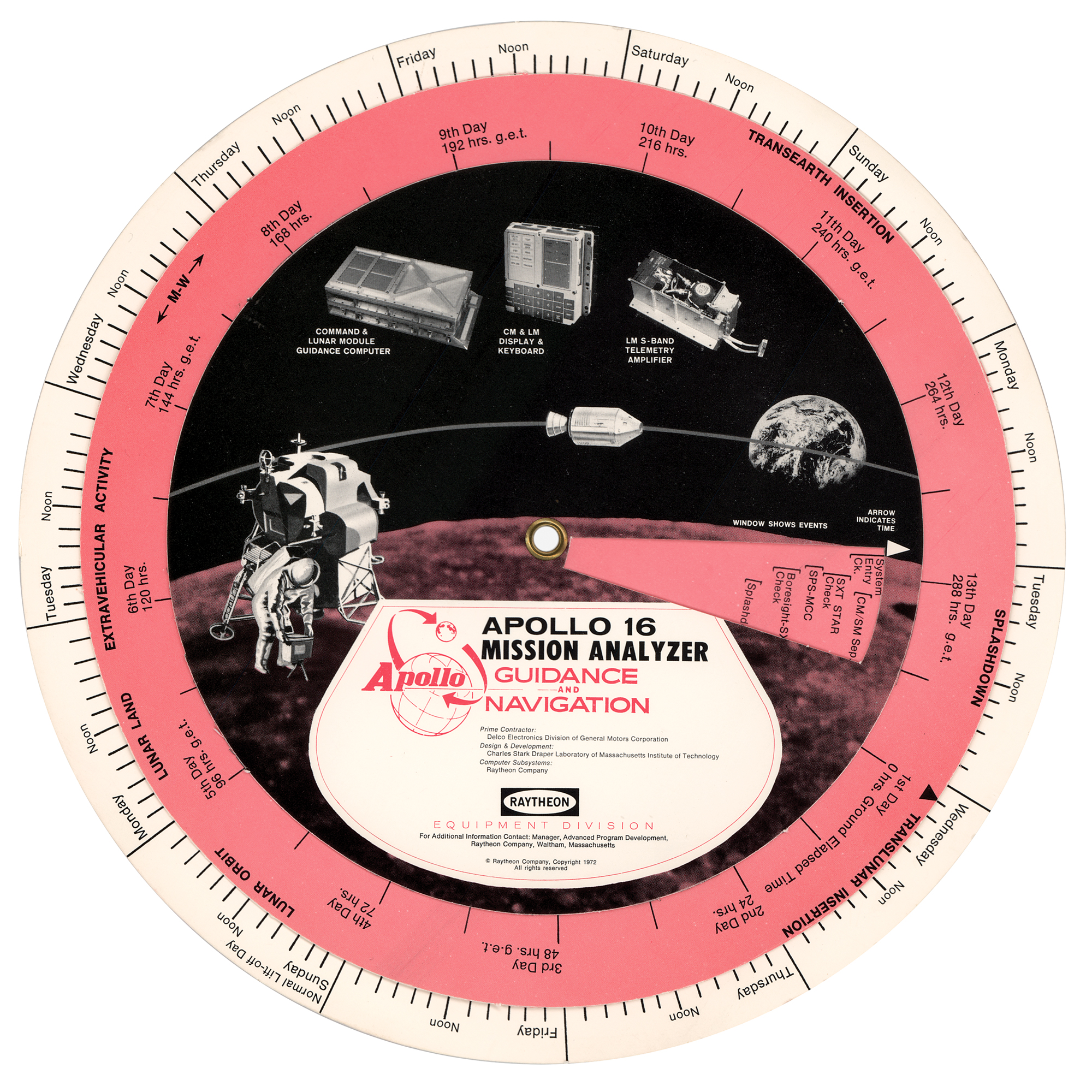 A circular cardstock "Apollo 16 Mission Analyzer" rotating chart made by Raytheon in 1972, measuring 9.5″ in diameter, providing a guide for the mission's timeline and activities. In fine condition, with faint scattered impressions.