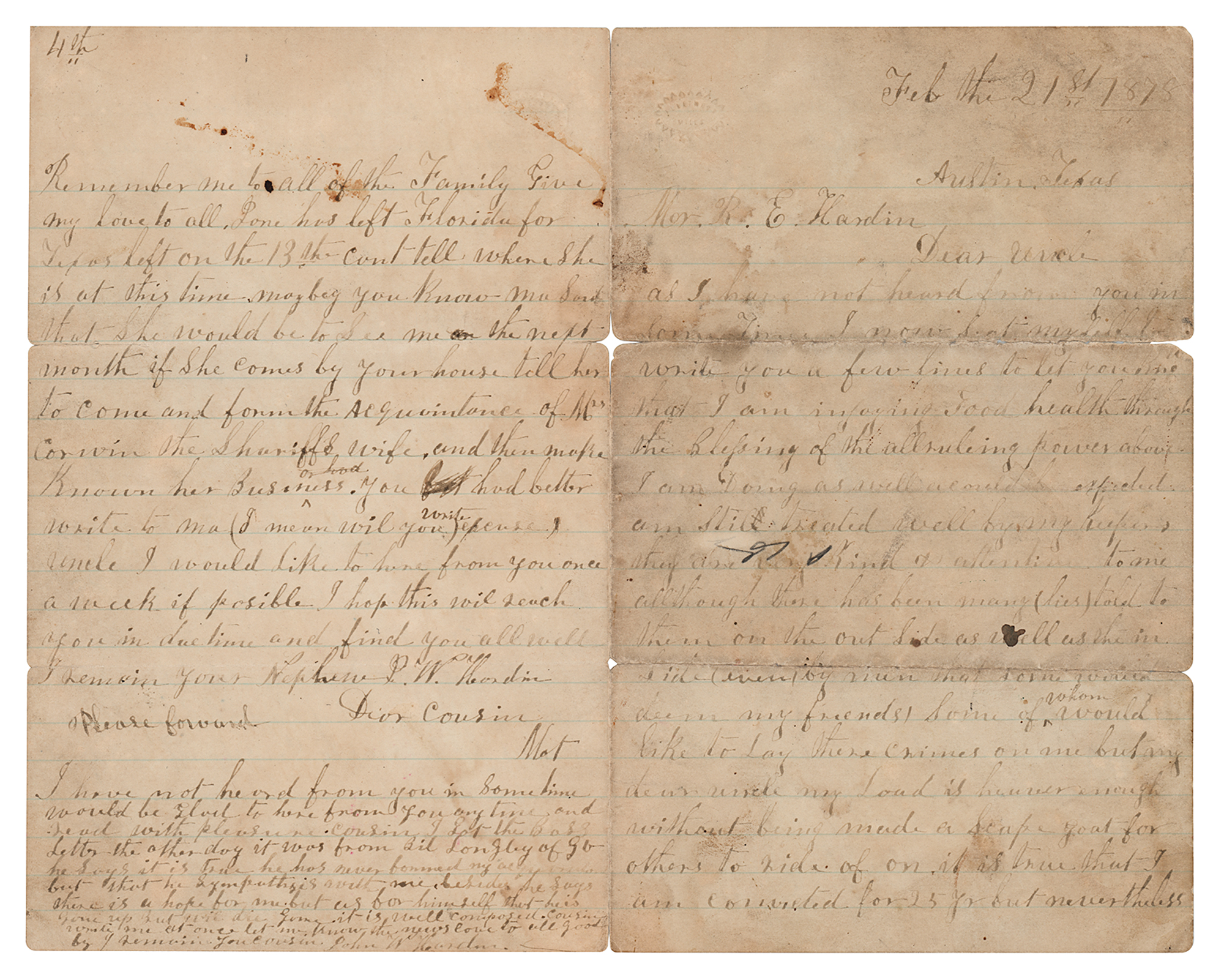Legendary Old West outlaw and folk icon (1853–1895) who claimed to have killed 42 men, well known for exaggerating and fabricating stories about his life. ALS signed “J. W. Hardin" and "John W. Hardin,” four pages on two adjoining sheets, 5 x 8, February 21, 1878. Handwritten letter from jail in Austin, Texas, to his uncle, R. E. Hardin, and his cousin Mat. At this time, Hardin was twenty-two years old and awaiting a hearing to appeal his conviction in the murder of Deputy Sheriff Charles Webb. In part (spelling and grammar retained): "I now Seat myself to write you a few lines to let you know that I am injoying Good health through the Blessing of the all ruling power above. I am Doing as well as could be expected. Am Still being treated well by my Keepers. They are very kind & and attentive to me although there has been many (lies) told to them on the out-Side as well as the in Side (even, by men that some would deem my friends) Some of whom would like to Lay there crimes on me…my Load is heavier enough without being made a Scape goat for others to ride of on. It is true that I am convicted for 25 yr but nevertheless I have never took that which I could not Give without first being in emminent danger. but you Bet I have always tried to protect my life and person when imposed on. Alltho the chances have often times being against me which I hope you are well aware; but uncle it's every hit on its own bottom…I have sent you 4 or 5 of Scot's & S.H.R. letters. I have never heard whether you got them or not…Scot Says that he Has wrote to my uncle Thomas Hardin at Brenham…Scot & Rennick think that they will reverse my case as for Hil C. the Shariff has been to see me he says the evidence is Good that there is no evidence there…as for my South west Troubles I will have plenty of assistance there no not Dread them in the Least. But if possible deliver me from commanchie if possible…I believe I will yet be free…I do hope that you will see that my case is properly attended to in the apelit court if posible. Joe C. says he will be here and will assist in any legal way…M[anny]. Clements tries for bond today in Gonzales. I think he will be allowed Bond he will be able to give bond. he staid here with me 6 wk [waiting?] to go to Gonzales on charge of murder in '72…they have got no case against him in the end…he says he has yet got some friends there besides Joe, Jim & Gip….he says…he will be by to see me…and help me in the apelit court…Remember me to all the family…Jane has left Florida…for Texas…Ma said that she would be here."