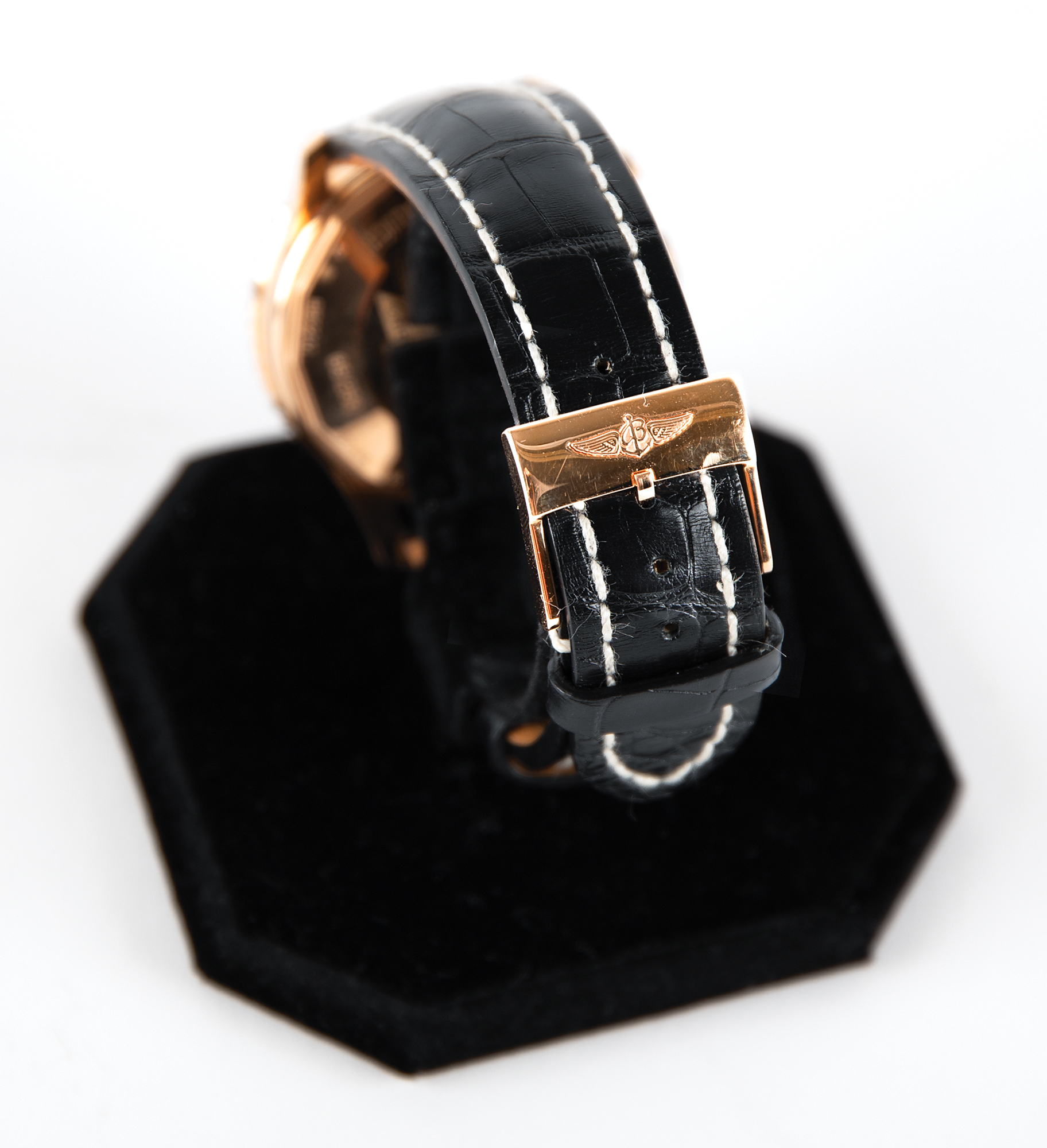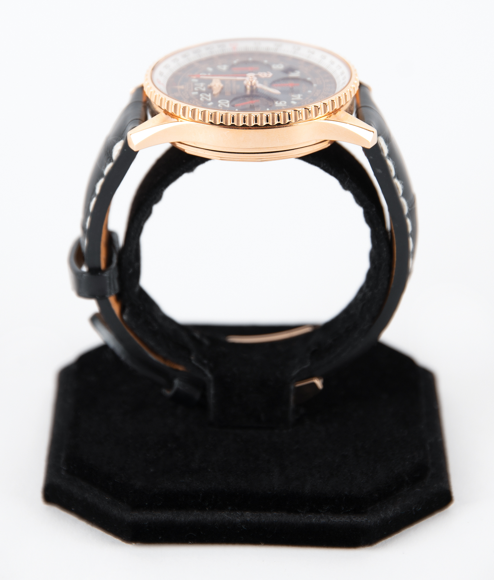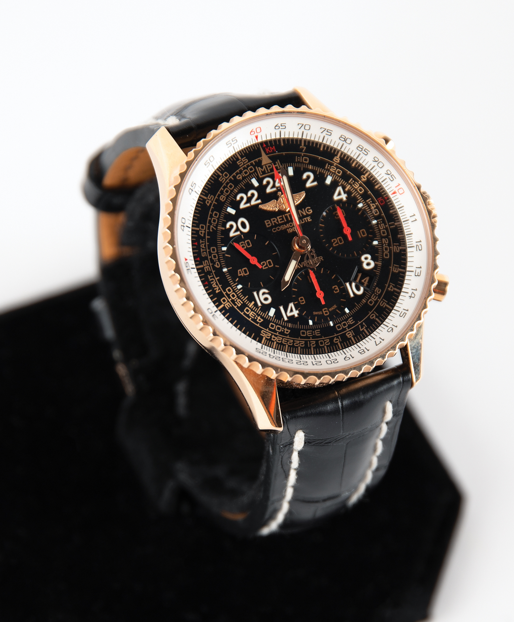 Gorgeous 2019 limited edition Breitling Navitimer Cosmonaute wristwatch, numbered 65/250, with 18K rose gold case with matching bi-directional inner rotating bezel, hands, and index hour markers and numerals against a black dial with three sub-dials. The watch features a hand-wound in-house movement Caliber Breitling B02 with a 70-hour power reserve, a scratch-resistant sapphire crystal, and a solid 18K gold case back, which is engraved with the edition number and an image commemorating Mercury astronaut Scott Carpenter and the flight of his Aurora 7 spacecraft. The watch includes its original Breitling black Alligator strap with off-white hand-stitched contrast stitching and the original Breitling 18K rose gold tang buckle. Accompanied by its original Breitling presentation box with an inner Bakelite case, which contains the owner’s manual (Breitling Skyracer), certificate of authenticity (No. 2274184), and warranty booklet. In overall fine condition, with deterioration to the inner watch holder, which has caused some darkened rubbing to the strap underside, and some light wear to the box.