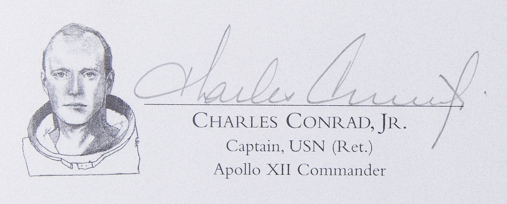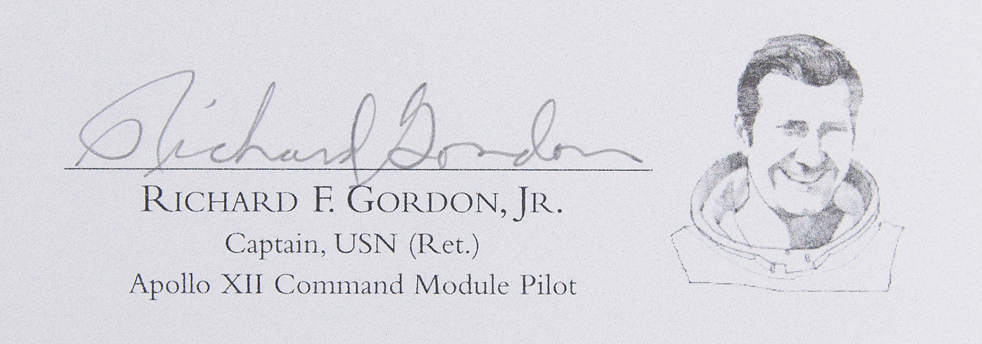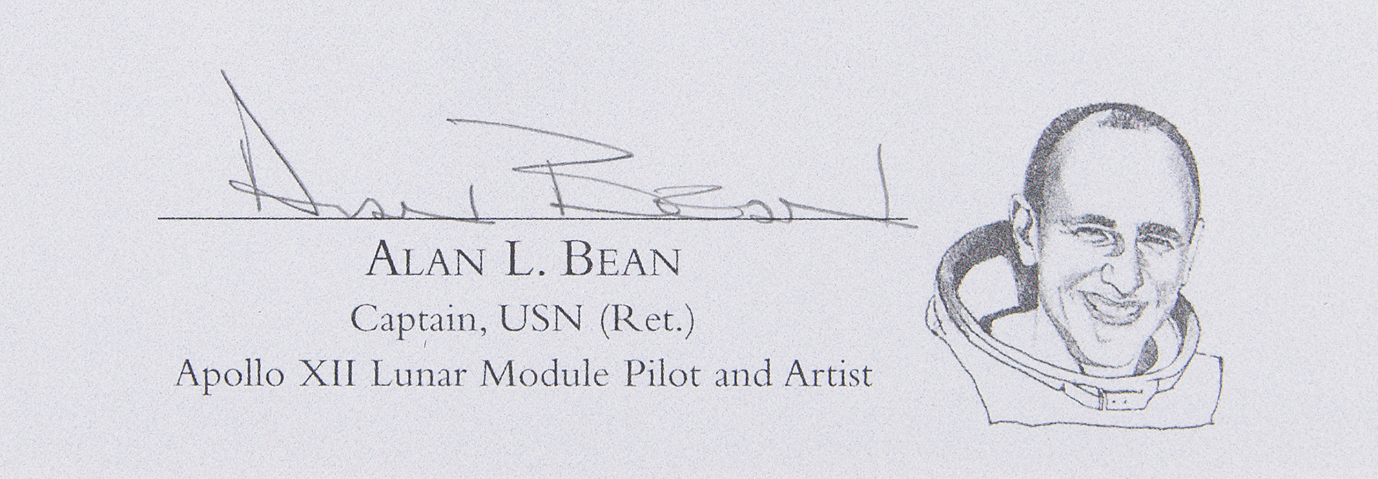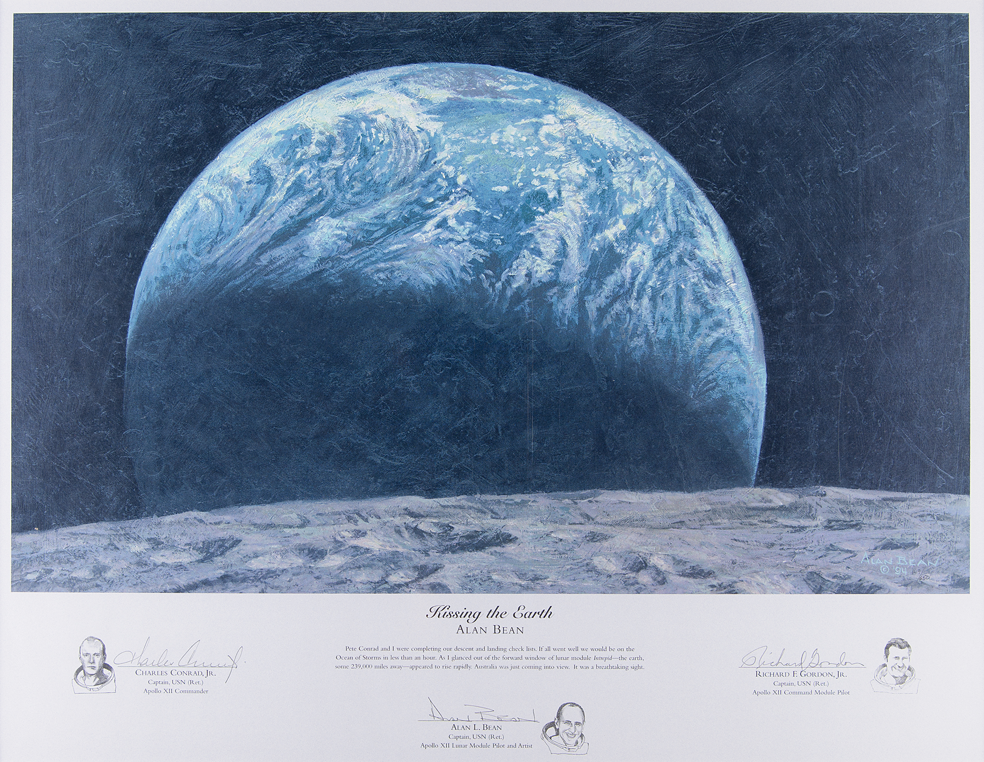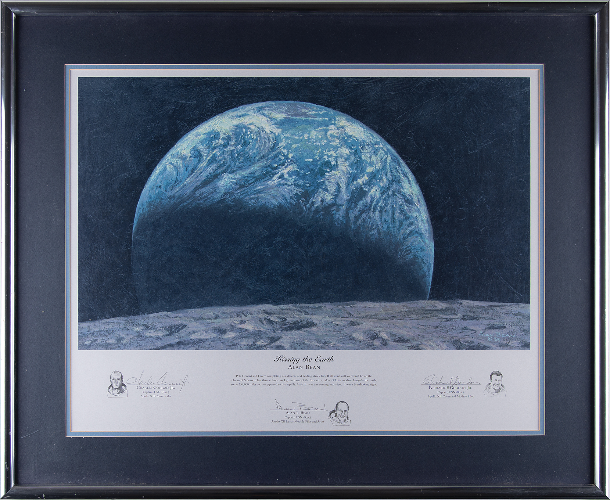 Color limited edition 25 x 19 lithograph entitled 'Kissing the Earth,' numbered 149/650, signed in the lower border in pencil by Alan Bean, Charles Conrad, and Richard Gordon. Double-matted and framed to an overall size of 32 x 27. In very fine condition. Accompanied by a certificate of authenticity from the publisher, The Greenwich Workshop.