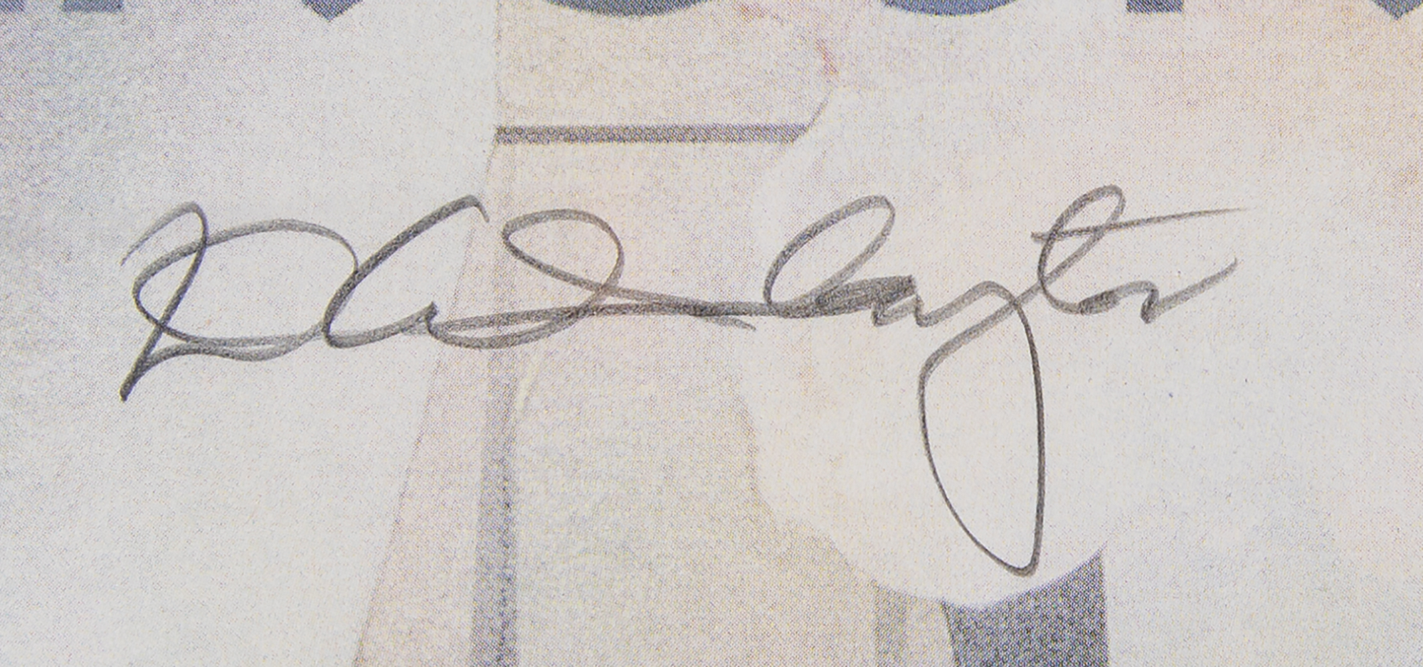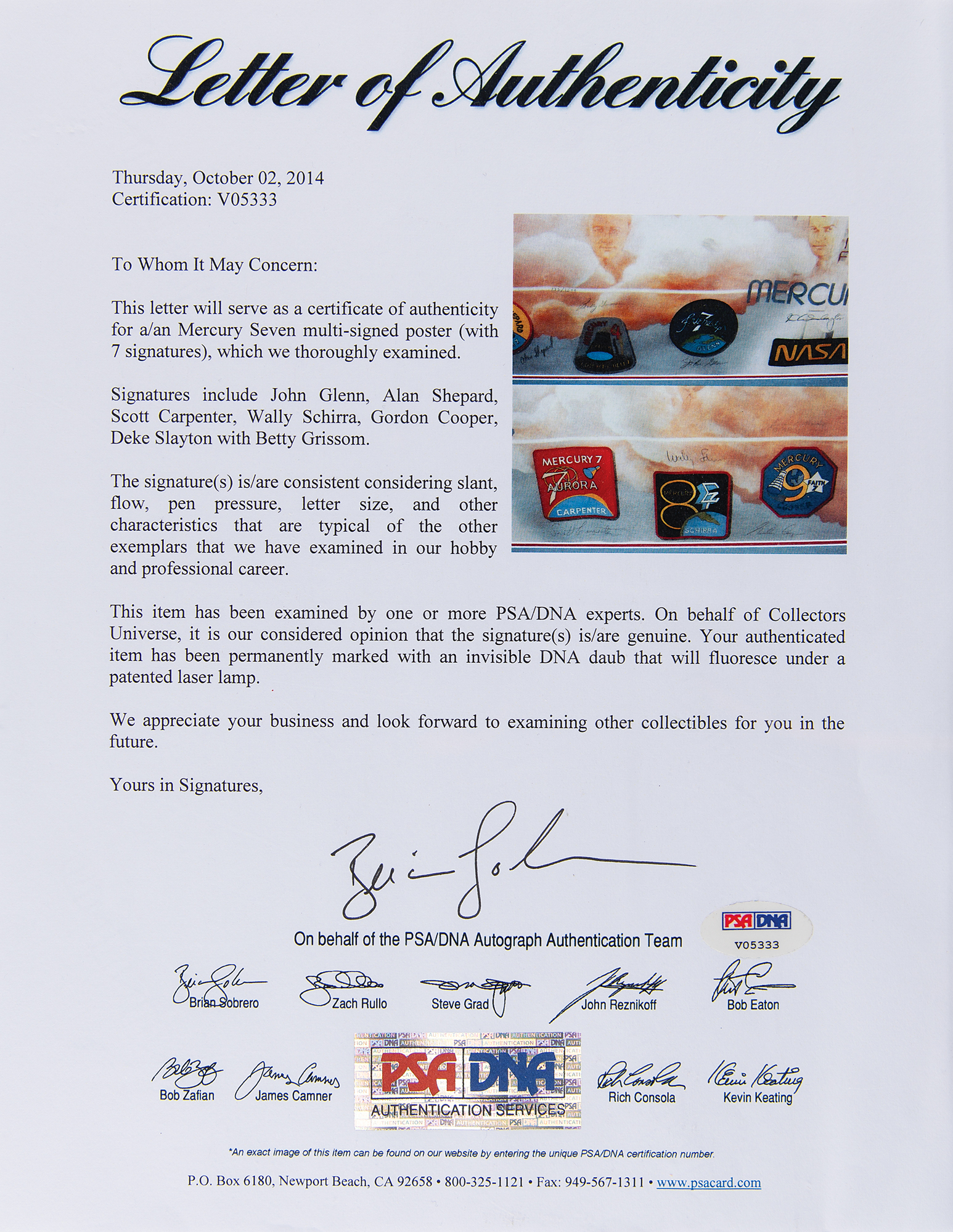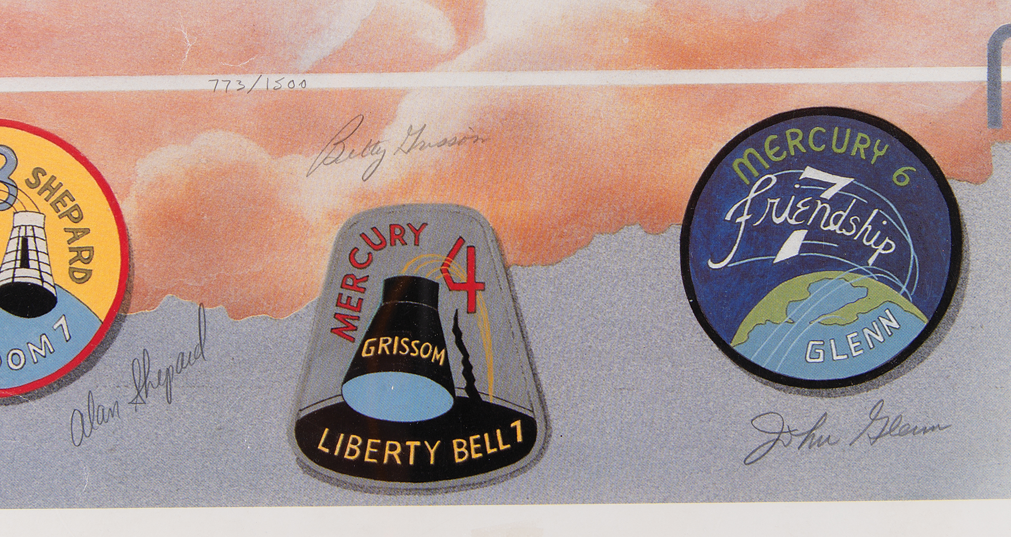 Color limited edition 35 x 25 print of a painting by artist George Bishop entitled ‘Mercury 7,’ showing the Mercury-Redstone rocket launching above images of the seven Mercury astronauts, a NASA logo, and the six mission insignias below each respective pilot, numbered 773/1500, signed along the bottom in pencil by Alan Shepard, Betty Grissom (wife of Gus Grissom), John Glenn, Deke Slayton, Scott Carpenter, Wally Schirra, and Gordon Cooper. Rolled and in fine condition, with light creasing and edgewear. Accompanied by a full letter of authenticity from PSA/DNA. This famous print was published to inaugurate and finance the Mercury Seven Foundation, a nonprofit national scholarship fund founded by the Mercury astronauts.