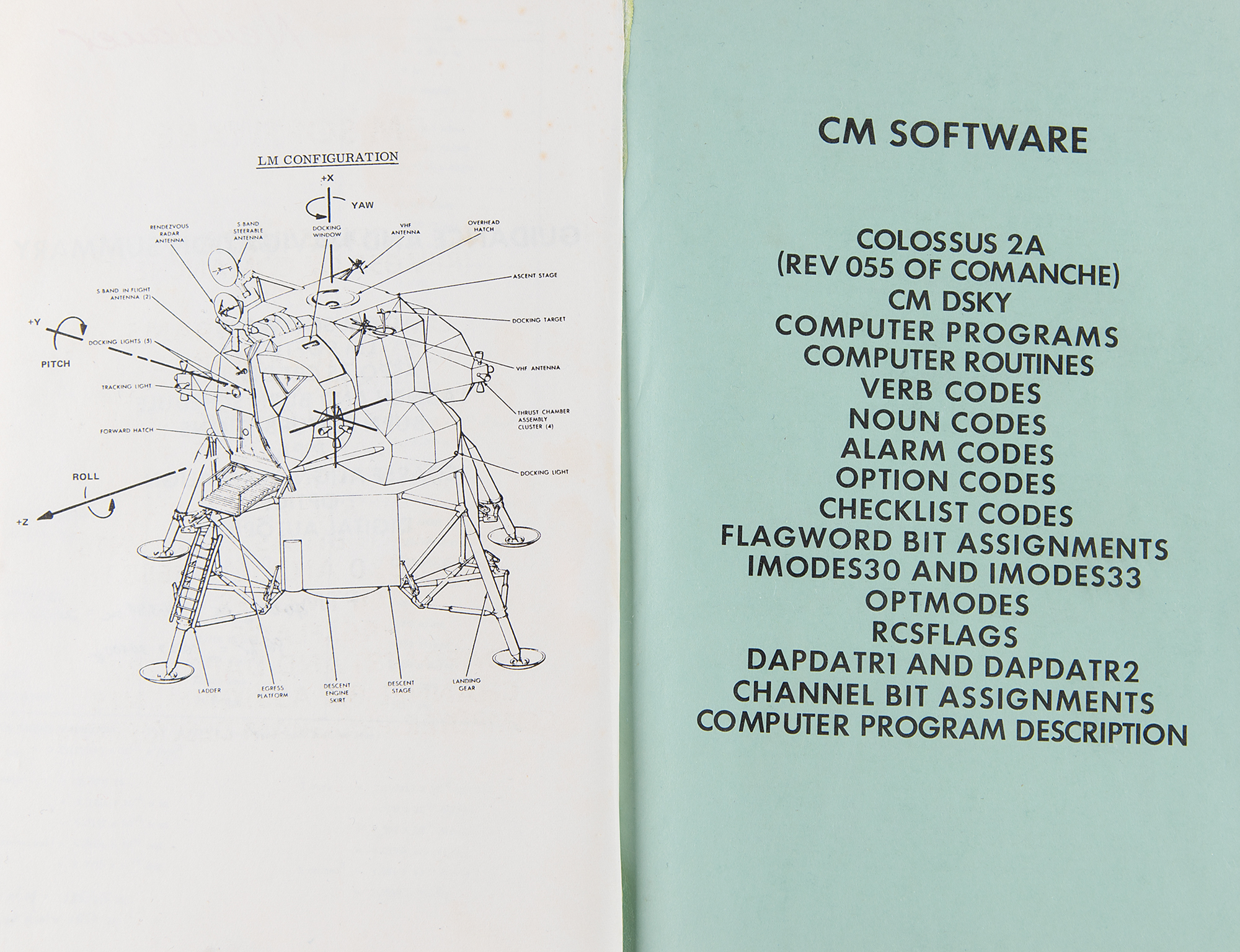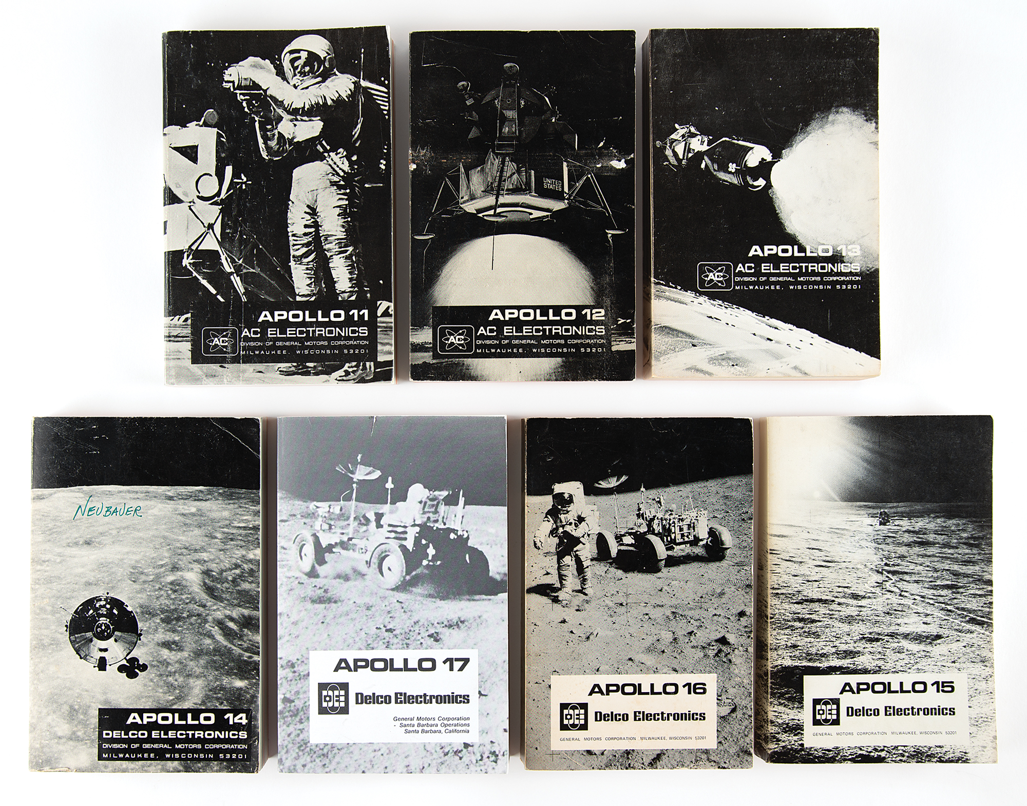Set of AC Electronics/Delco Electronics manuals for all seven Apollo moon landing missions: Apollo 11, Apollo 12, Apollo 13, Apollo 14, Apollo 15, Apollo 16, and Apollo 17. The manuals have sections on "CM Software," "LM Software," "ASPO 45 CRT Displays," "Launch and Burn Schedule," "Burn Perturbations," and other mission-specific aspects of the guidance and navigation systems used on the Apollo spacecraft. They contain numerous diagrams, instructions, lists, and code definitions related to the guidance and navigation system, including the Apollo Guidance Computer (AGC). In overall very good to fine condition, with some wear to spines and a few annotations throughout.