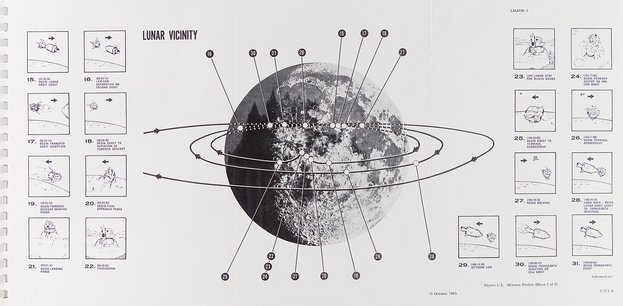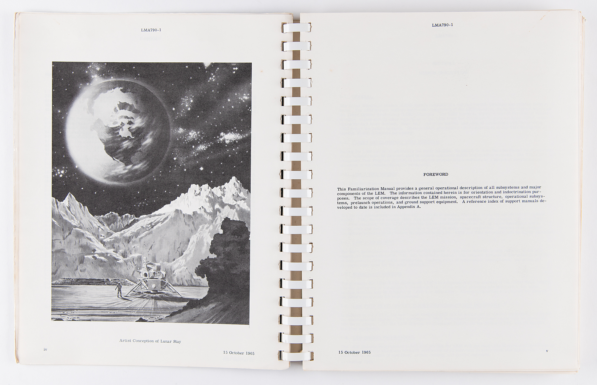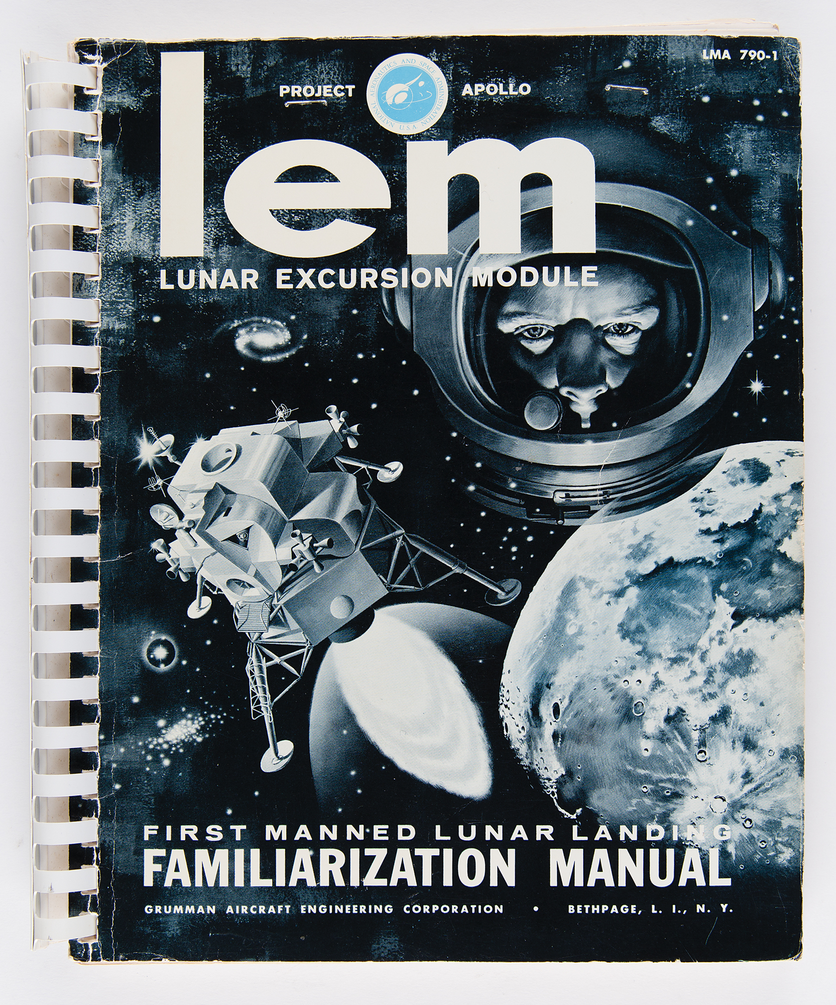 Official spiral-bound manual entitled "LEM: Lunar Excursion Module, First Manned Lunar Landing Familiarization Manual" by the Grumman Aircraft Engineering Corporation of Bethpage, New York, 136 pages, 9 x 11, October 15, 1965. The manual documents the mission description, LEM structure, operational subsystems, prelaunch operations, and ground support equipment. It is well illustrated with numerous fold-out charts, diagrams, and schematics that document the mission, spacecraft controls, thrusters, instruments, and more. In very good to fine condition, with a few small edge tears and losses, a felt tip notation to the title page, and general light wear. Accompanied by five stapled press releases documenting the NASA/Grumman Apollo Lunar Module's development, structure, systems, and manufacturing history.