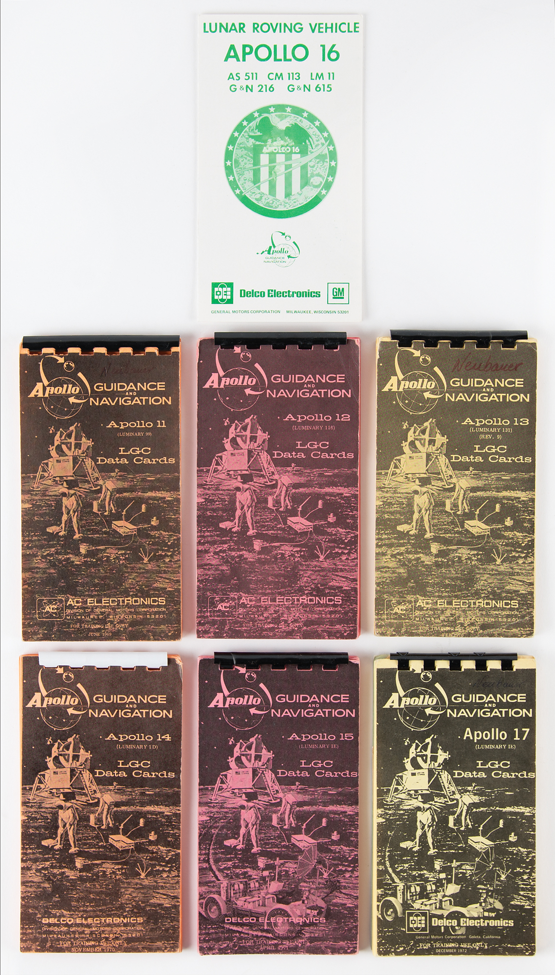 Collection of six spiral-bound pocket-sized reference booklets of LM Guidance Computer (LGC) Data Cards prepared for training use by AC/Declo Electronics, listing basic instructions for the Block II LM Guidance Computer, with listings of verb codes, noun codes, checklist codes, alarm codes, programs, routines, and flagwords. Includes booklets for Apollo 11 (Luminary 99), Apollo 12 (Luminary 116), Apollo 13 (Luminary 131), Apollo 14 (Luminary 1D), Apollo 15 (Luminary IE), and Apollo 17 (Luminary IE). Additionally includes a Delco Electronics mission description/event booklet for Apollo 16. In overall very good to fine condition, with light general wear from use, including various ink annotations.