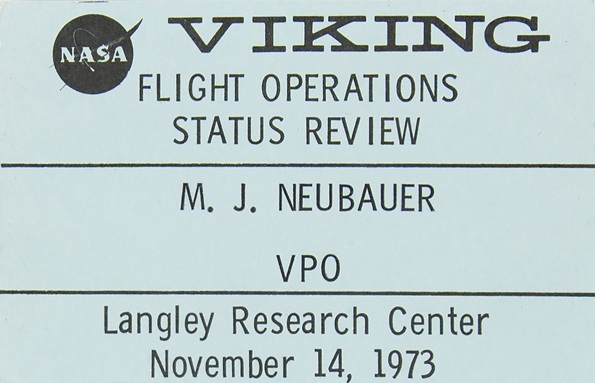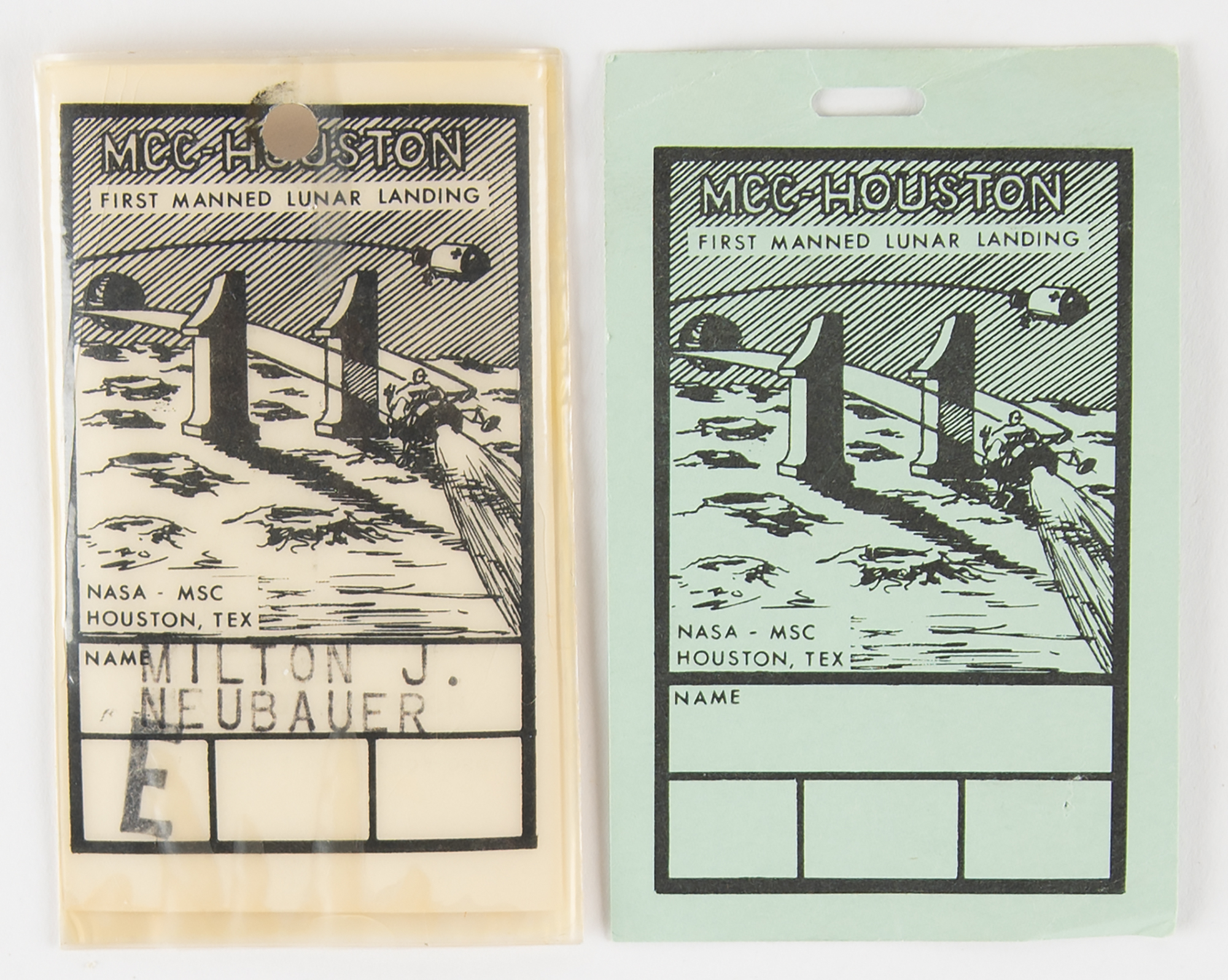 Collection of 14 Apollo and Gemini Program access badges for NASA’s Mission Control Center in Houston, Texas, each issued to NASA engineer Milton J. 'Jack' Neubauer, Jr. The laminated badges, each measuring 2.5 x 3.75, are marked for the following Apollo missions, which include both crewed and uncrewed flights: LM-1 (stamped D, with S label), 6 (D), 7 (BD), 8 (E), 9 (E), 10 (BDE), 11 (E), 12 (E), 14 (E), 15 (E), 16 (E), and 17 (A). Includes an unlaminated and unissued green access pass for the Apollo 11 mission, a laminated access badge for the Gemini 12 mission, which is stamped “D,” and a NASA pass for “Viking Flight Operations Status Review.” In overall fine condition.
