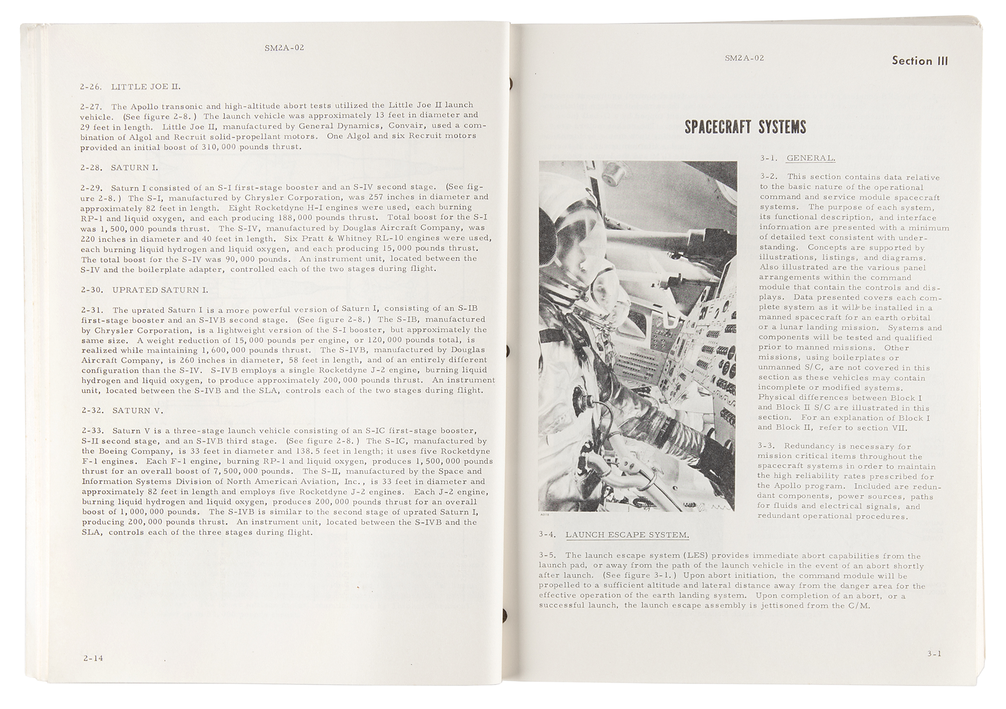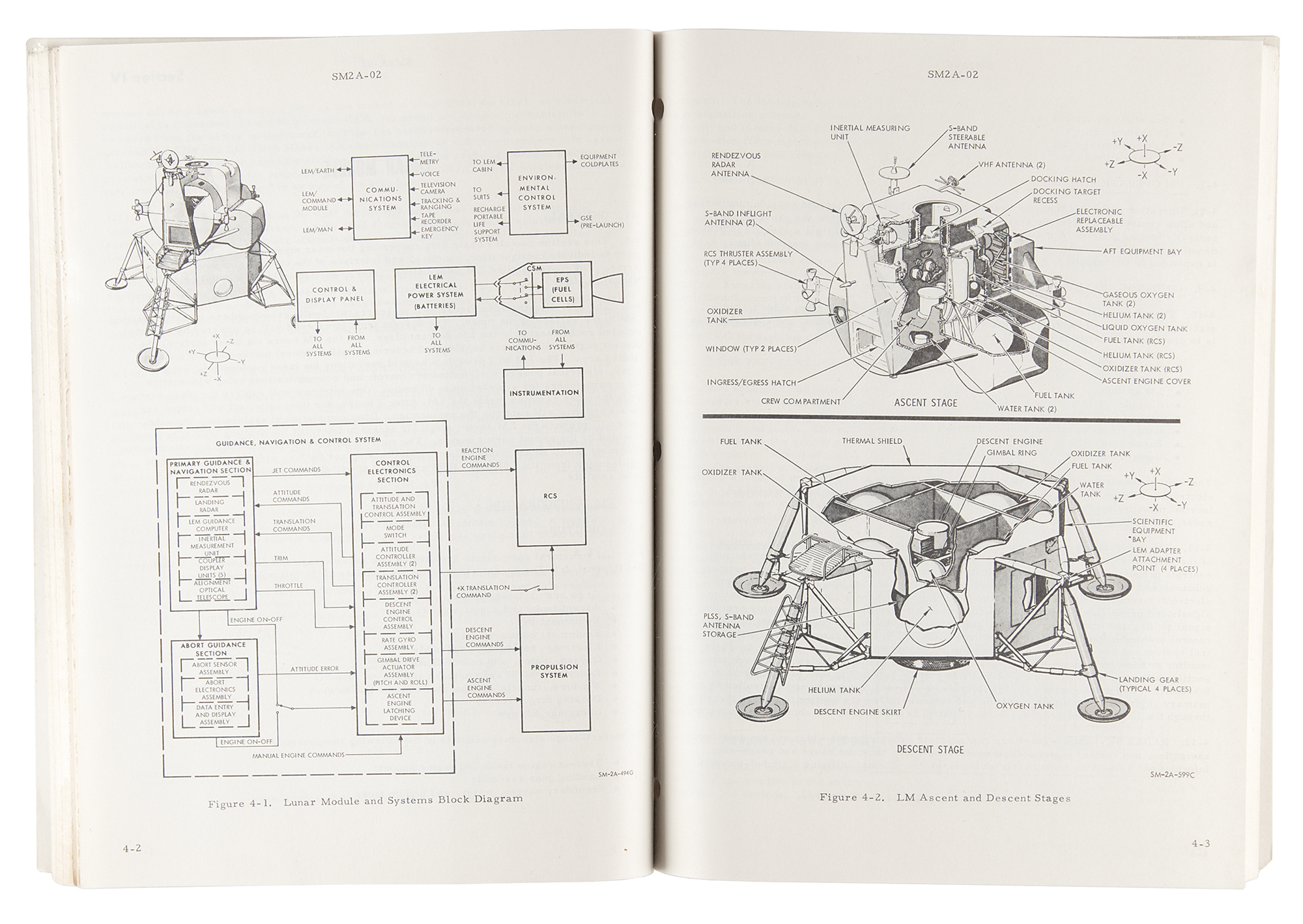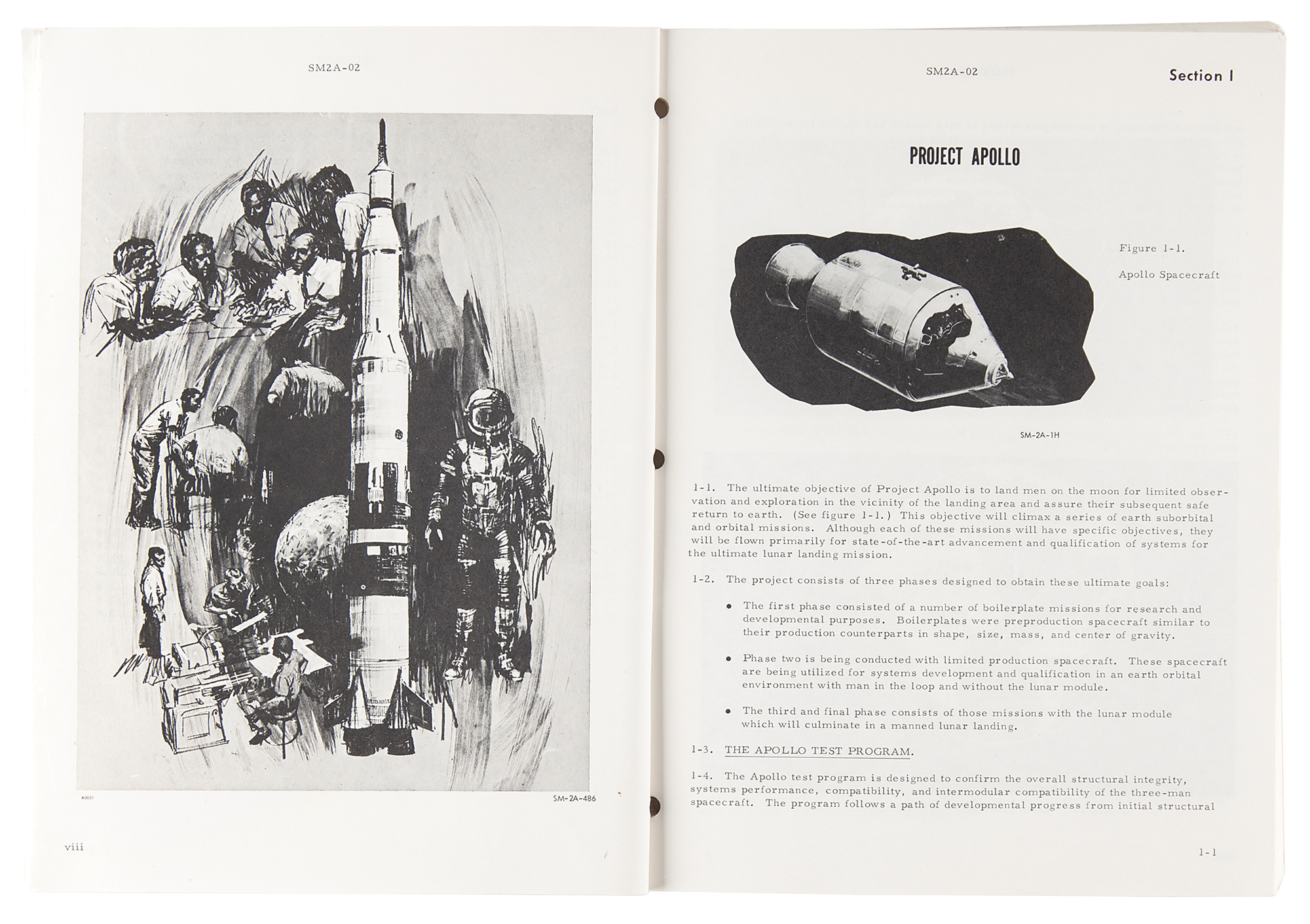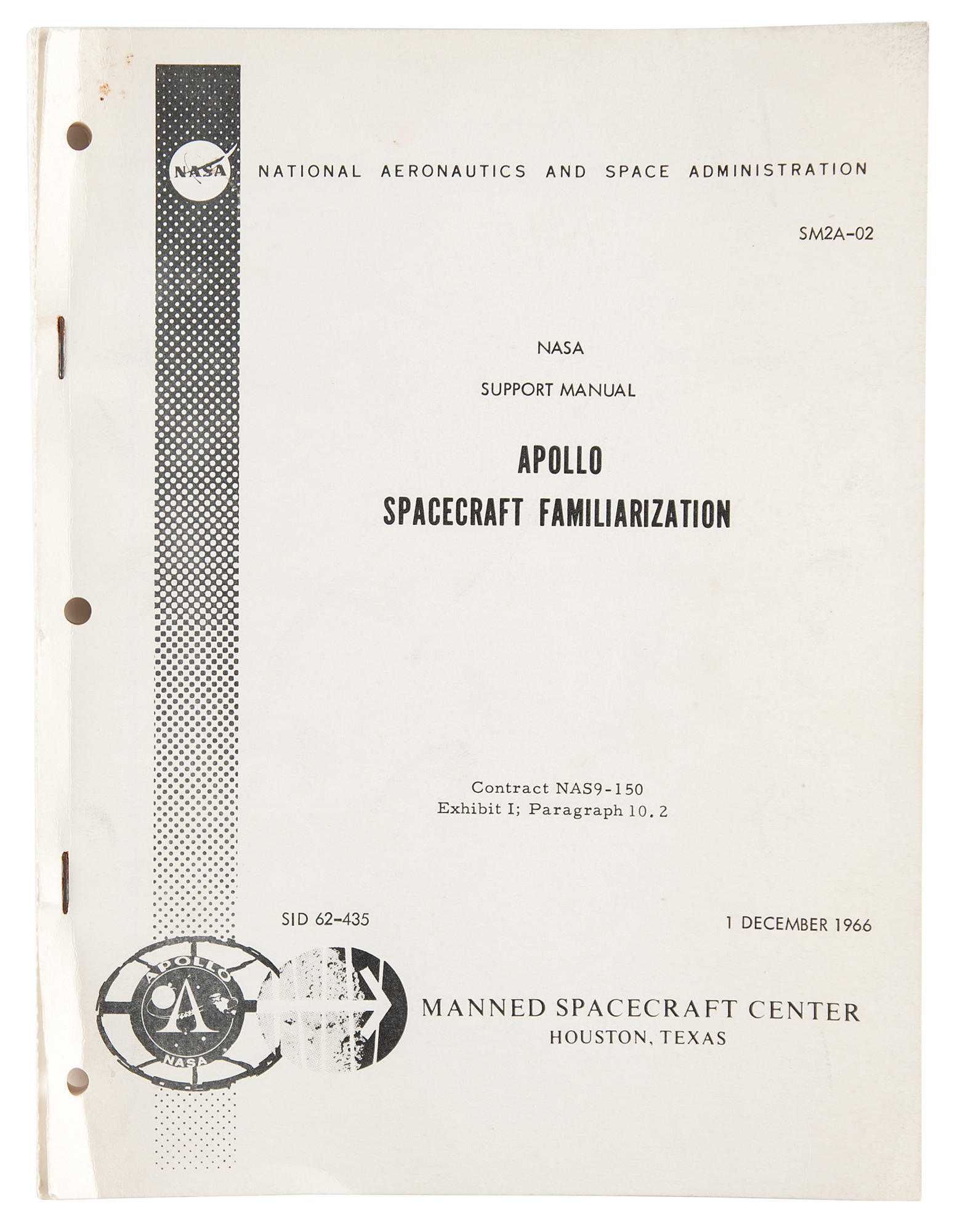 Staple-bound NASA support manual entitled "Apollo Spacecraft Familiarization," prepared by the Manned Spacecraft Center, 8 x 10.5, 188 pages, December 1, 1966. The well-illustrated document outlines Project Apollo, the Apollo Space Vehicle, spacecraft systems, the Lunar Module, Apollo training equipment, Apollo test program, and the lunar landing mission. In the first section, the manual defines the primary goal of the Apollo program: "The ultimate objective of Project Apollo is to land men on the moon for limited observation and exploration in the vicinity of the landing area and assure their subsequent safe return to earth." In fine condition, with a couple light stains to the covers.