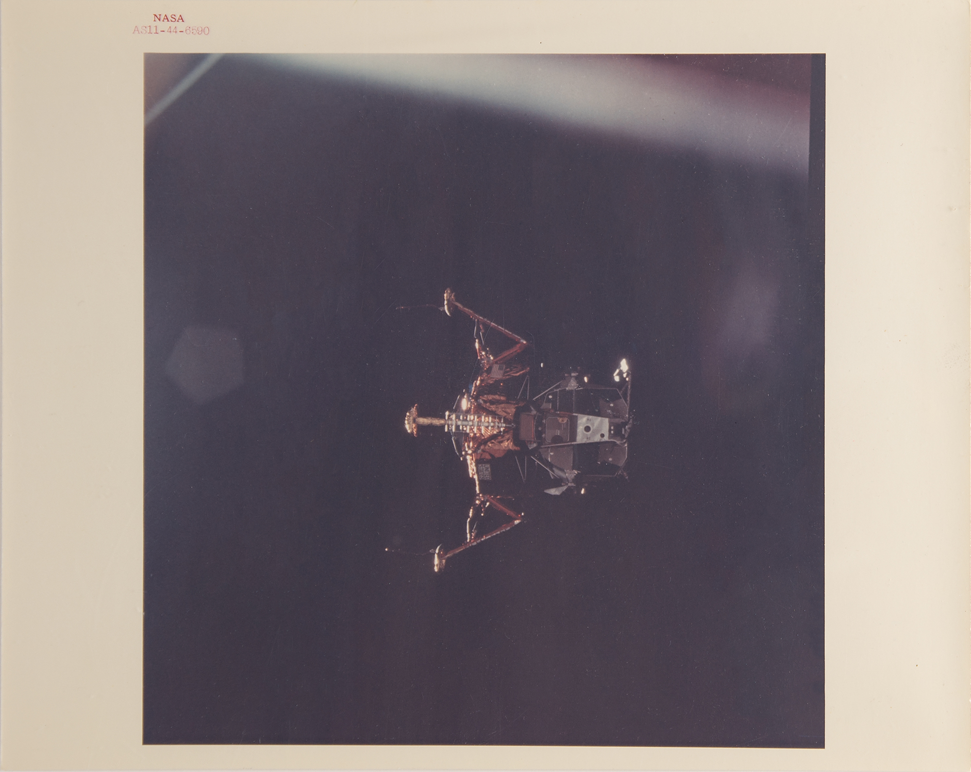Original vintage color glossy 10 x 8 red-numbered NASA photo (AS11-44-6590) showing the Apollo 11 Lunar Module 'Eagle' in space as it prepares for rendezvous with the CM 'Columbia.' Reverse bears “A Kodak Paper” watermarks. In fine condition, with a subtle abrasion to the wide white border and an insignificant area of surface loss to the reverse.
