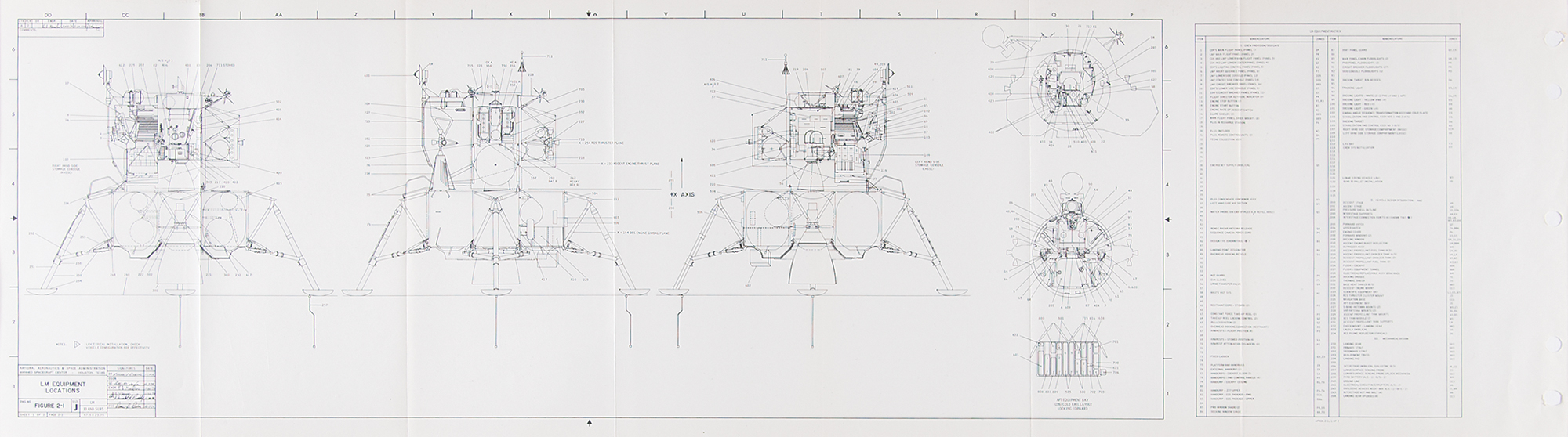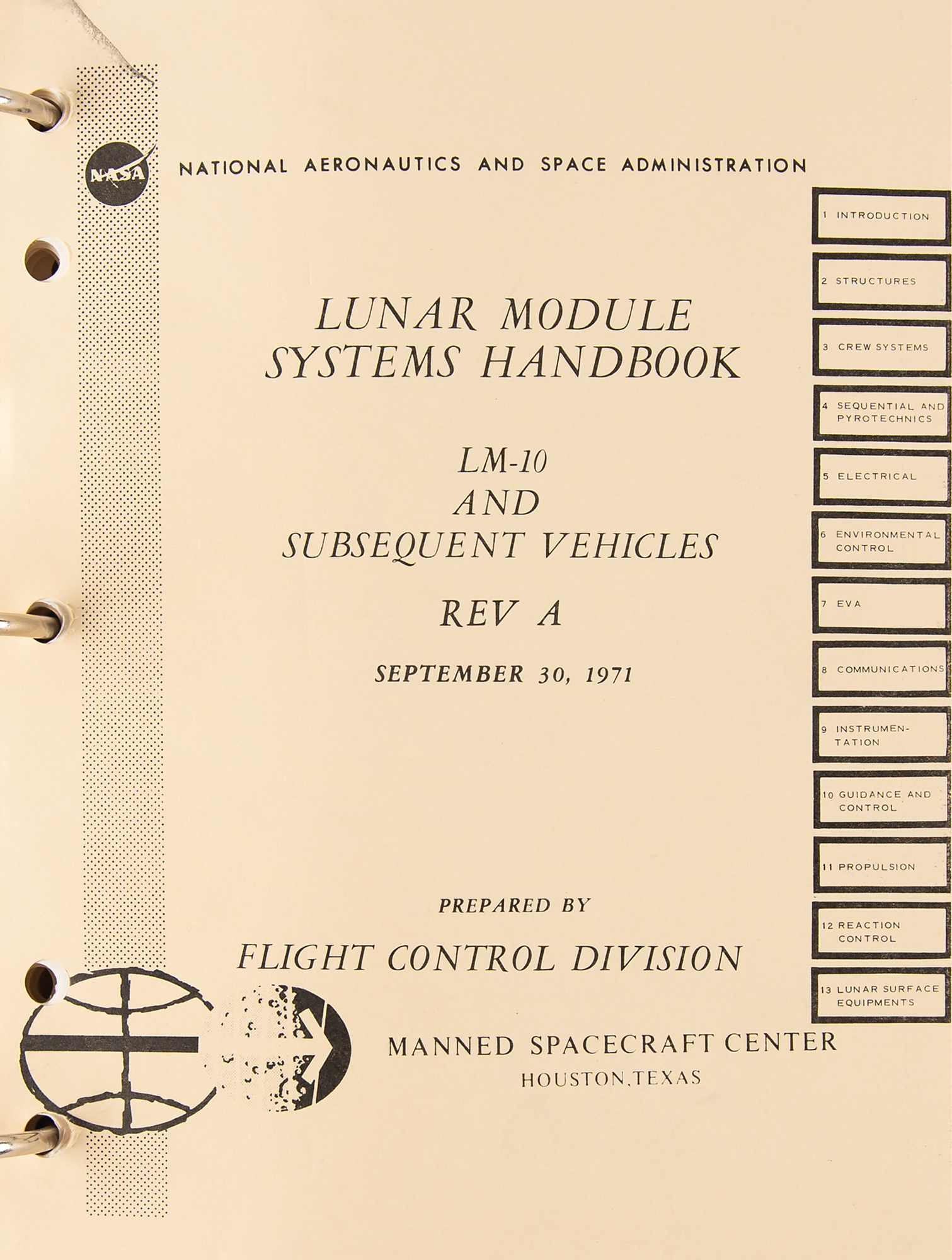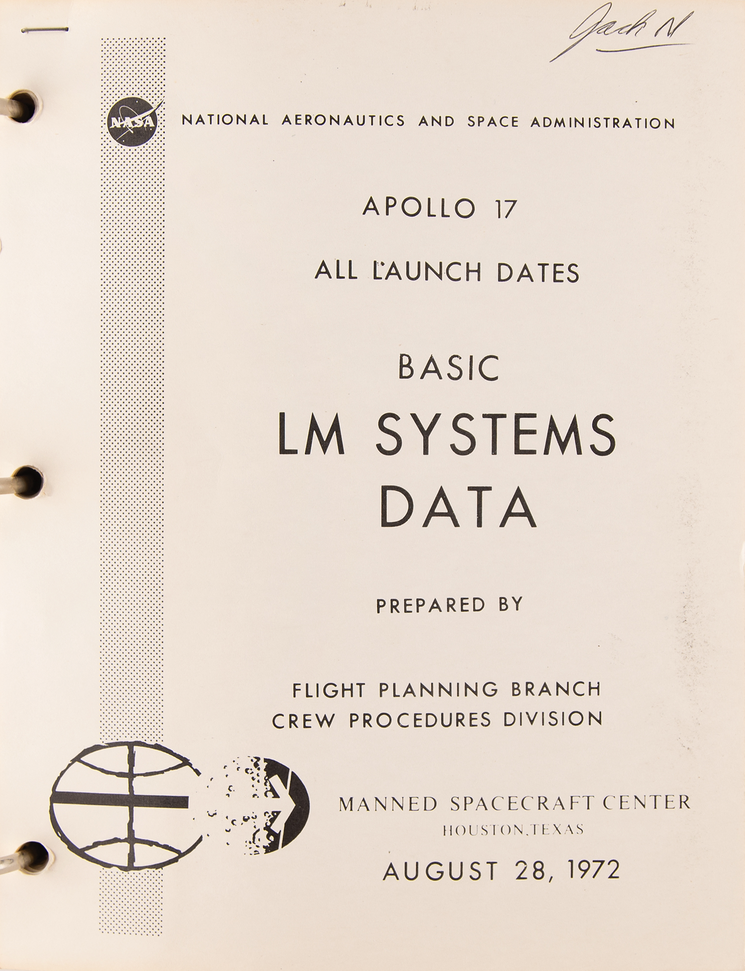 Exceptionally well-detailed, comprehensive NASA engineer's Lunar Module systems handbook, entitled on the spine, "Lunar Module Systems Handbook, LM-10 and Subsequent Vehicles, Rev. A, PCN-3, Apollo 17, September 30, 1971," prepared by the Manned Spacecraft Center's Flight Control Division, housed in its red 11.5 x 11.25 binder. The handbook consists almost entirely of highly detailed fold-out schematics and diagrams, containing hundreds of pages documenting the LM's structure and systems, including: crew, pyrotechnics, electrical, environmental control, EVA, communications, instrumentation, guidance and control, propulsion, reaction control, and lunar surface equipment. In fine condition, with wear and losses to the clear plastic on the exterior of the binder.