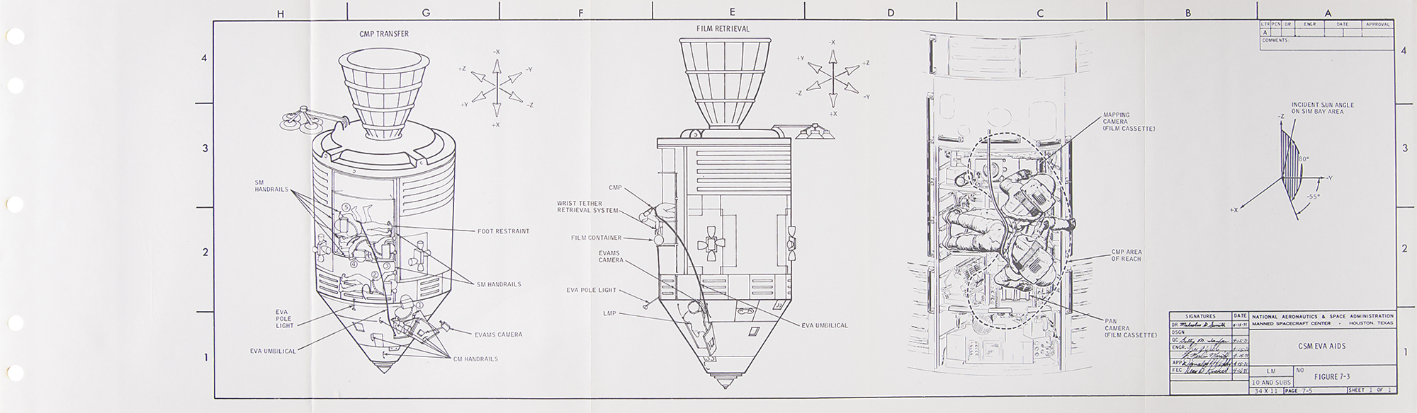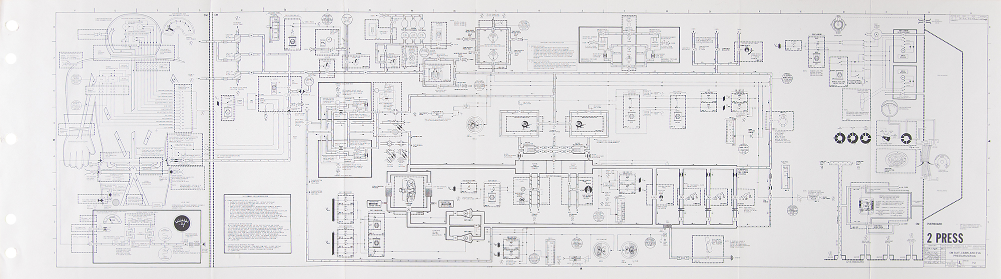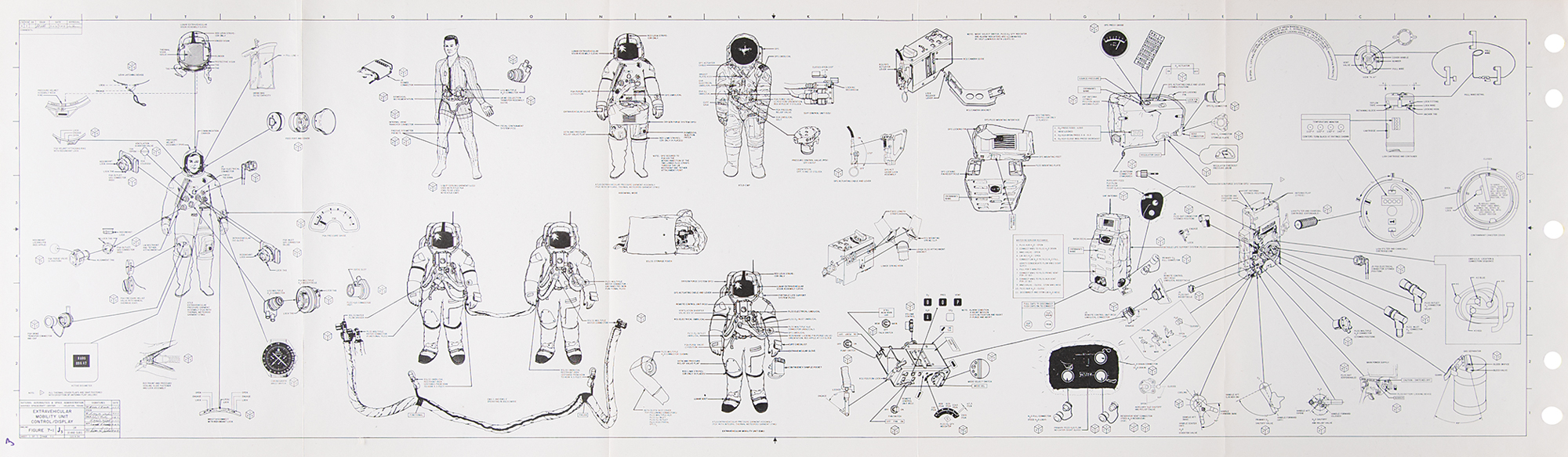 Exceptionally well-detailed, comprehensive NASA engineer's Lunar Module systems handbook, entitled on the spine, "Lunar Module Systems Handbook, LM-10 and Subsequent Vehicles, Rev. A, PCN-3, Apollo 17, September 30, 1971," prepared by the Manned Spacecraft Center's Flight Control Division, housed in its red 11.5 x 11.25 binder. The handbook consists almost entirely of highly detailed fold-out schematics and diagrams, containing hundreds of pages documenting the LM's structure and systems, including: crew, pyrotechnics, electrical, environmental control, EVA, communications, instrumentation, guidance and control, propulsion, reaction control, and lunar surface equipment. In fine condition, with wear and losses to the clear plastic on the exterior of the binder.