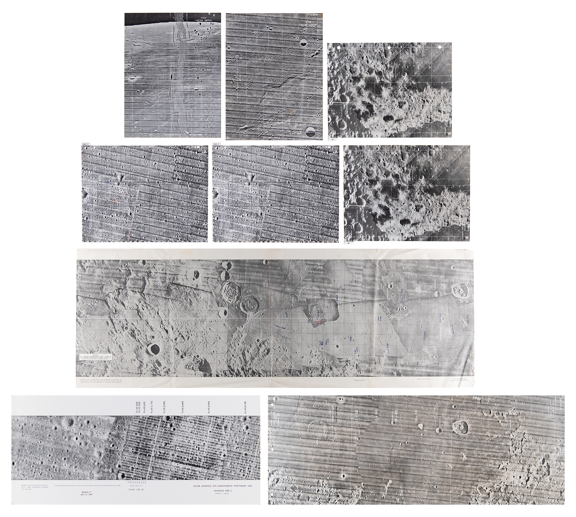 - a 28 x 10.5 chronopaque chart labeled "Landing Site 2, 16 July 1969," featuring a 1:630,000 scale image of the 'Sea of Tranquility' landing site.