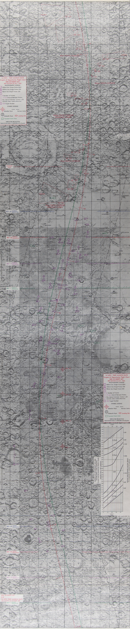 - two third editions of the Apollo 12 "Targets of Opportunity Flight Chart, SKB 32100097-301," 58 x 12, issued for launch dates of November 14 and 16, 1969, providing detailed data concerning the mission's lunar photography targets.