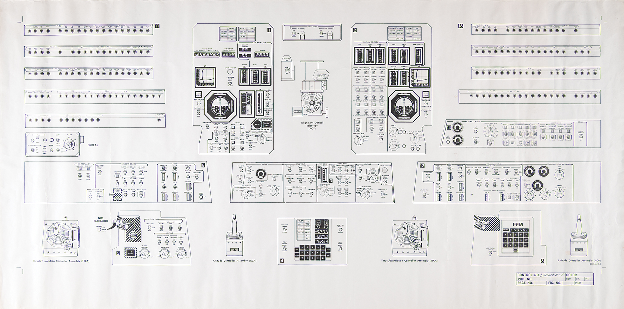 Scarce original 47 x 23 schematic for the control panel of the Apollo 15 Lunar Module Falcon (LM-10), with the legend to the lower right listing the control number as “300LM10-1.” This attractive poster-sized diagram details the multitude of instruments on the control panel, which includes two Thrust/Translation Control Assemblies (TTCA), two Attitude Controller Assemblies (ACA), the Alignment Optical Telescope (AOT), in addition to sections related to range indication, the Abort Guidance System (AGS), communication, and environmental controls. Rolled and in fine condition, with some light stains and vertical creases.