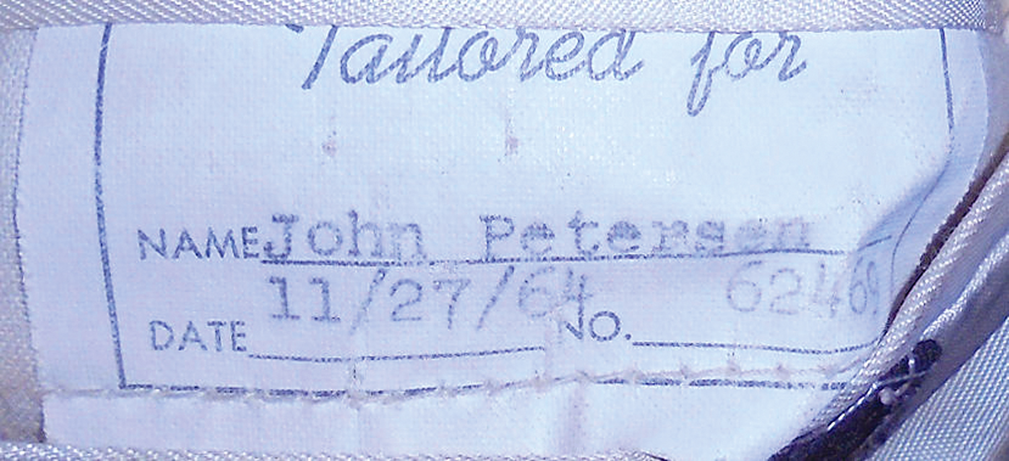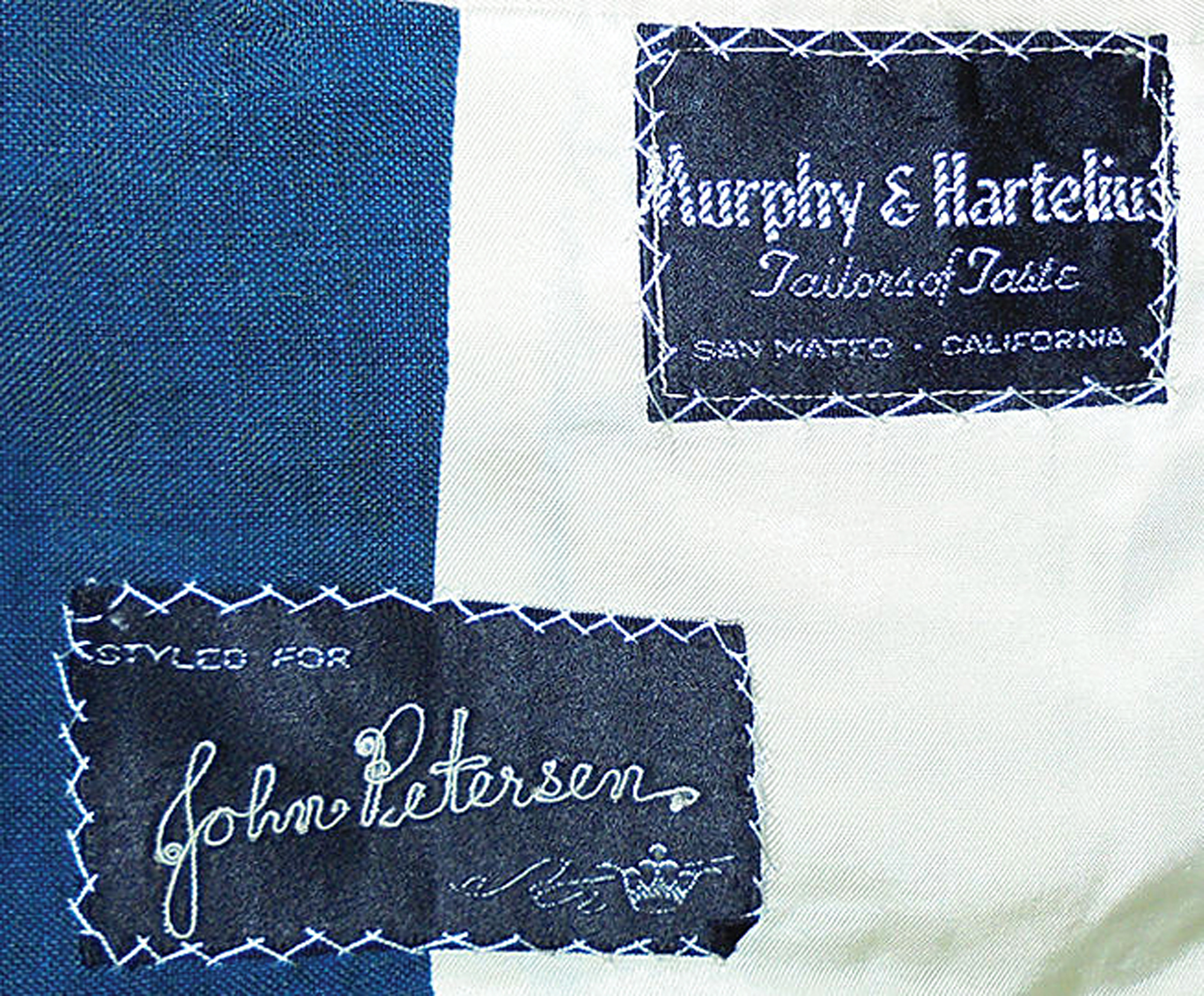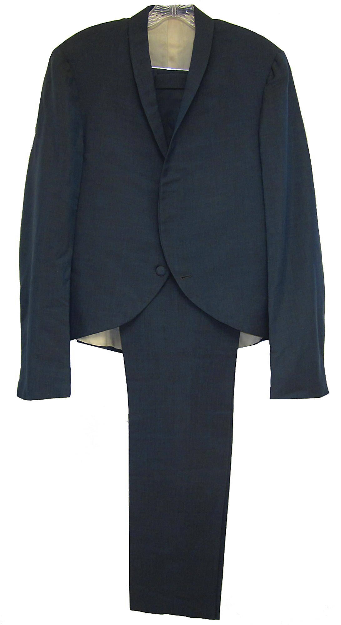 Custom-tailored suit made for John Petersen, drummer of the San Francisco?based rock group The Beau Brummels (1964) and worn on the television shows Shindig and Hullabaloo, among others. Both appearances can be seen on YouTube where they are performing their hit song 'Laugh, Laugh.' It is also seen on the album cover for 'The Very Best Of The Beau Brummels: The Complete Singles.' For a short while, they were well known, produced by Sly Stone, and responsible for bringing an original sound to combat the British invasion. The band also appeared in two motion pictures as well as an episode of The Flintstones. Tailor's tags inside the suit read, "Murphy & Hartelius, Tailors of Taste, San Mateo California," and "Styled for John Peterson," with another reading: "Tailored for: Name: John Petersen, Date: 11/27/64, No. 62469." The costume exhibits some very small moth holes. Accompanied by a large color 12 x 12 album cover slick plus a black-and-white 8 x 10 of Petersen at his drums, dressed in the suit.