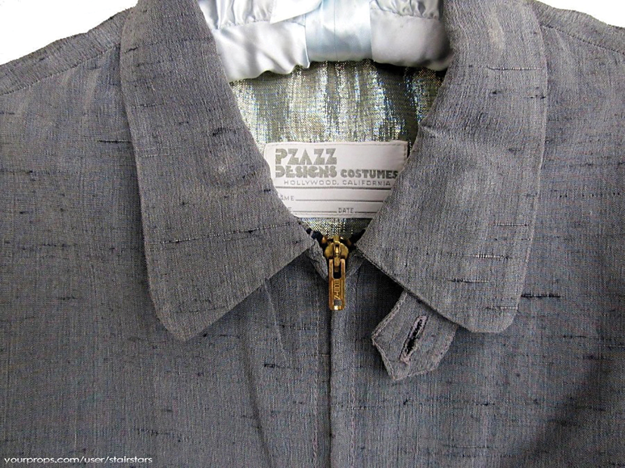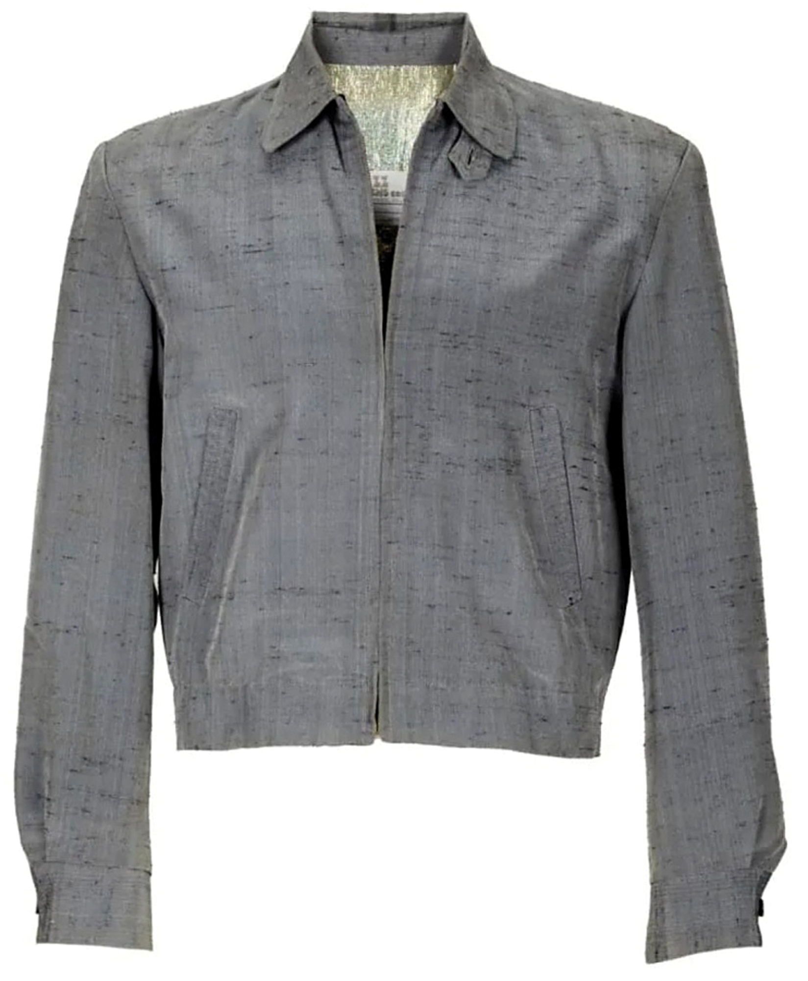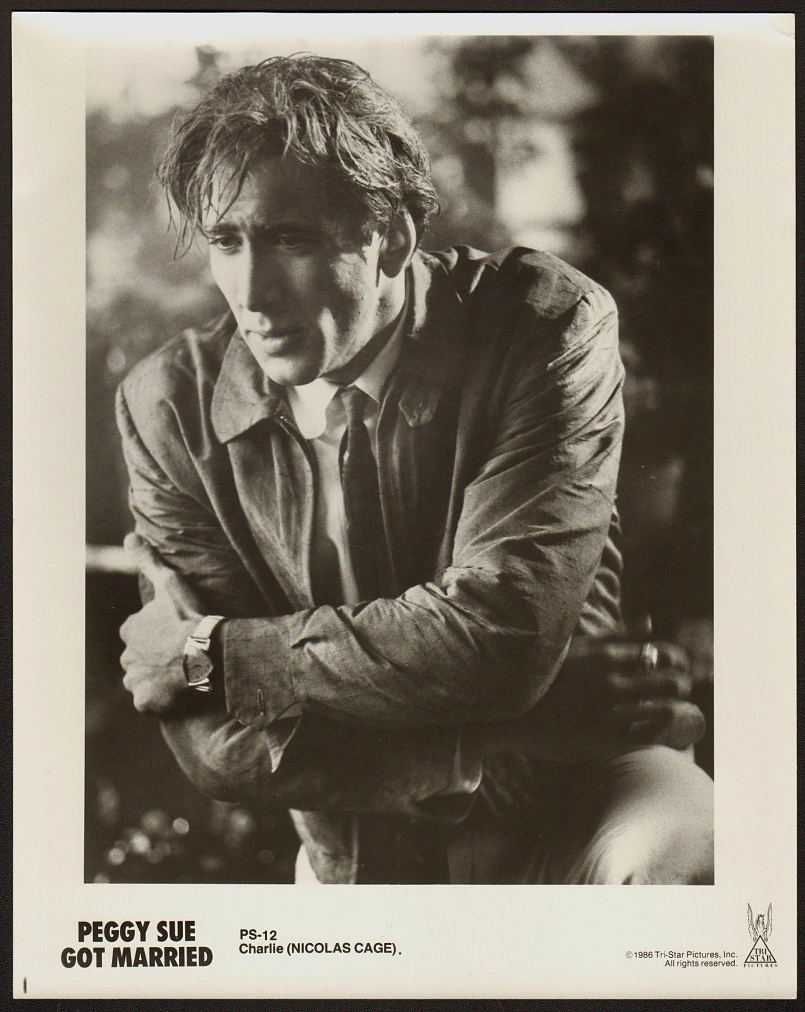 Screen-worn shantung silk jacket, custom-made for Nicholas Cage for his role as 'Crazy Charlie' Bodell in Francis Ford Coppola's 1986 fantasy comedy-drama Peggy Sue Got Married. The jacket was made by Nicholas Sherlock, whose company, Pzazz, made jumpsuits for Elvis when he employed Bill Belew. Later, he became the head of Universal's costume department. The film is noted for the color palette of its time traveling scenes, and was nominated for the Academy Award for Best Costume Design. The film's costume designer, Theodora Van Runkle, said she was seeking 'novelty fabrics' when designing the color palette of the past. Accompanied by a black-and-white 8 x 10 still of Cage wearing the jacket.
