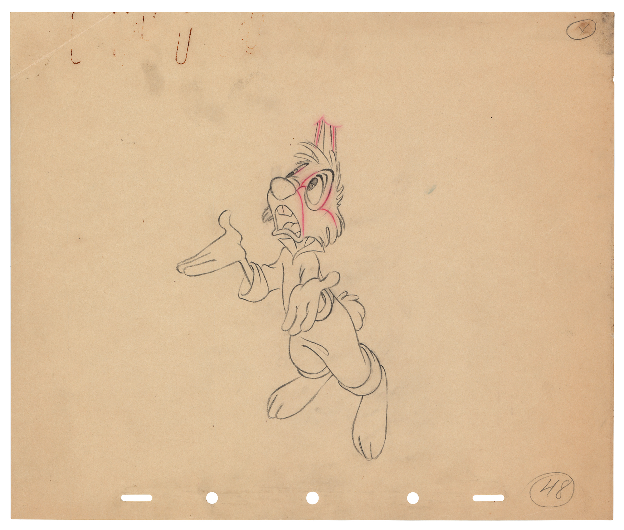 (Walt Disney Studios, 1946) Original production drawing featuring Br’er Rabbit from Song of the South, showing the rabbit pleading his case in a nearly full-length pose. Accomplished in graphite and colored pencil on untrimmed 12 x 10 animation paper marked “48” in the lower right corner. Image measures 4.25 x 6.5. Rusty paperclip marks and a crease to the upper left, otherwise fine condition.