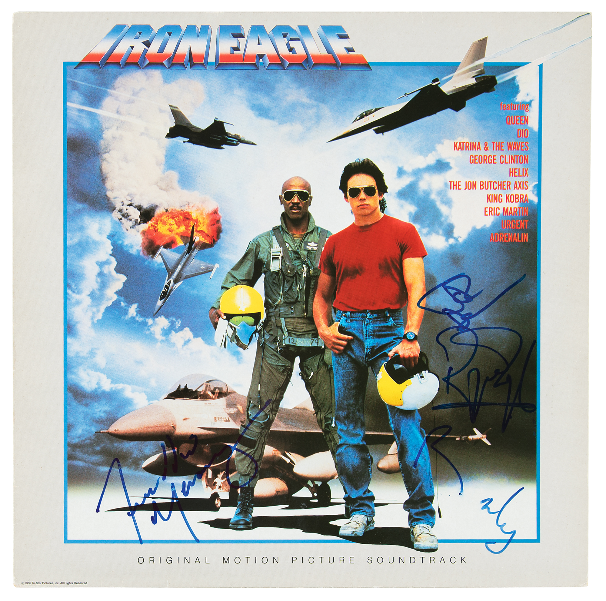 Iron Eagle soundtrack album signed on the front cover in blue felt tip by Freddie Mercury, Brian May, John Deacon, and Roger Taylor. In fine condition. The record is included. Accompanied by a full letter of authenticity from JSA. The album's first track is Queen's 'One Vision,' which is used multiple times during the training and battle scenes of the film, where the young hero, Doug Masters, plays the song on his cassette player and headphones.