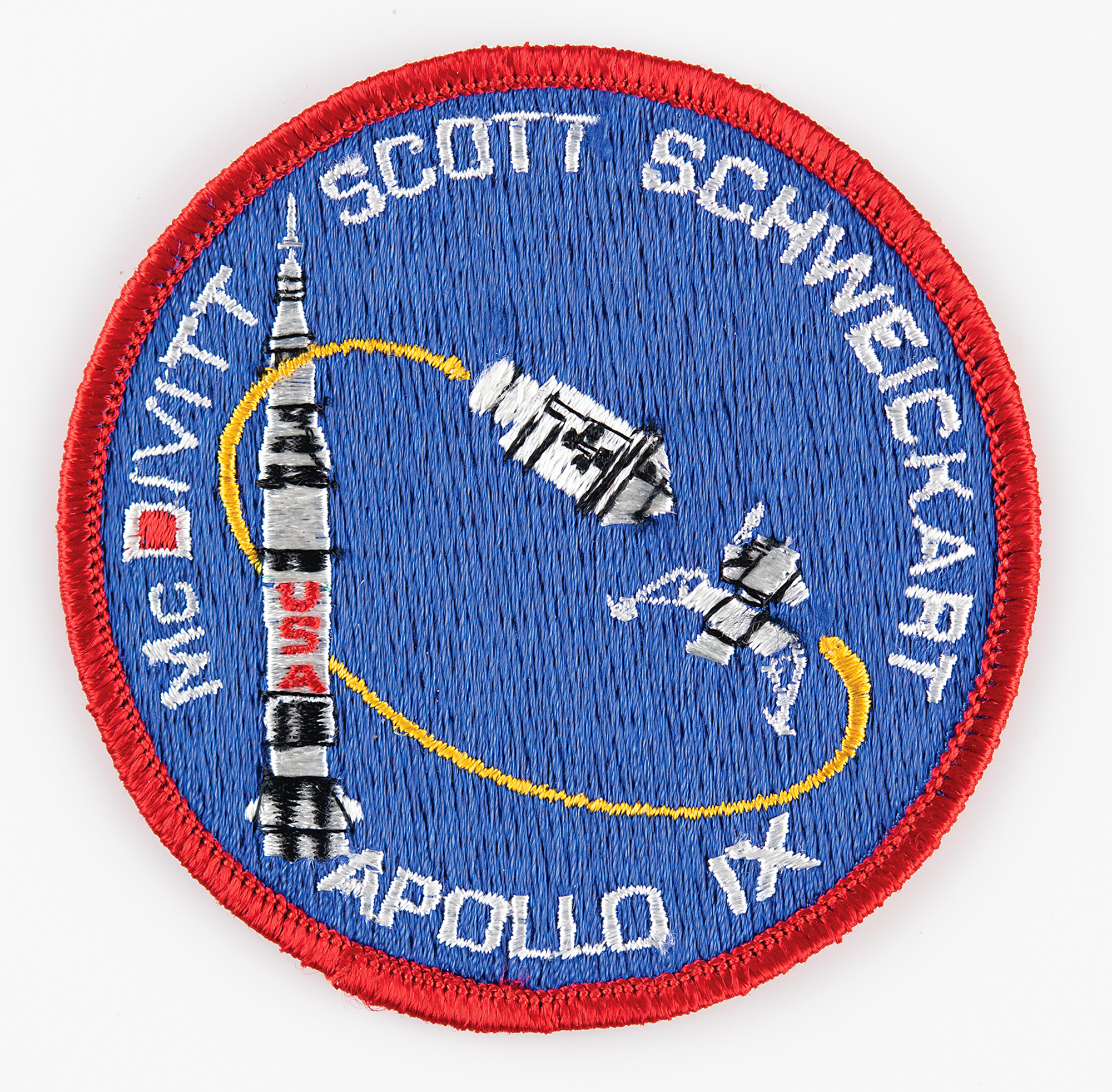Flown embroidered Apollo 9 mission patch, 3.5˝ in diameter, signed and flight-certified on the reverse in green felt tip, "Flown aboard Apollo 9, Jim McDivitt." In fine condition. Accompanied by a signed certificate of authenticity from McDivitt, in full: "I certify that this crew patch was flown on Apollo 9 on her flight in March, 1969.”