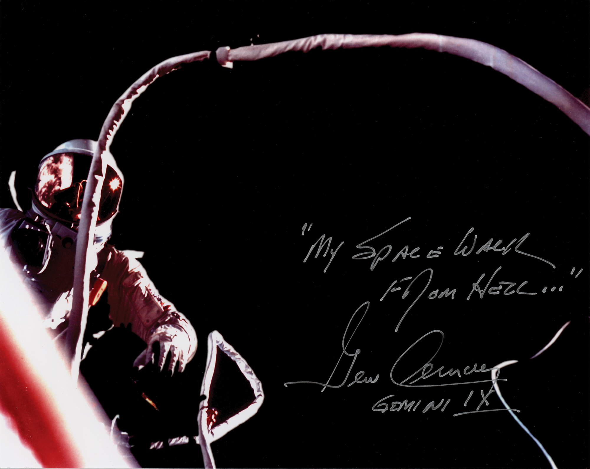 Color satin-finish 10 x 8 photo of Cernan’s memorable Gemini spacewalk, signed in silver ink “‘My Space Walk from Hell…,’ Gene Cernan, Gemini IX.” In fine condition.