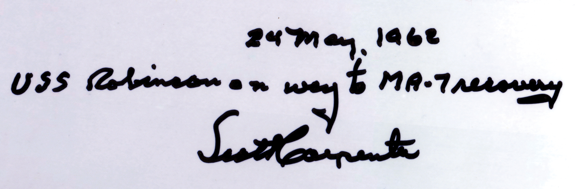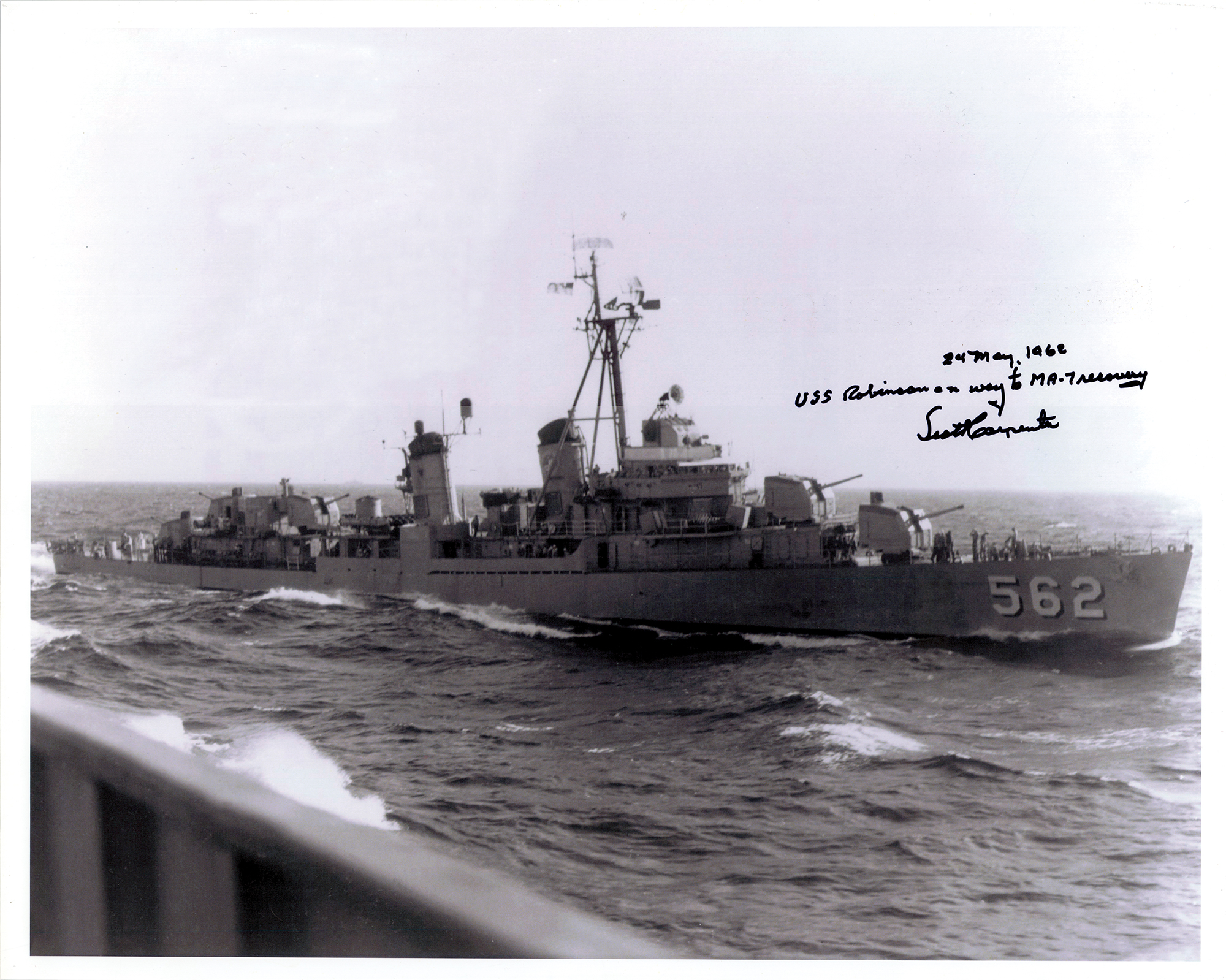 Satin-finish 20 x 16 photo of the USS Robinson, one of the intended recovery ships for Mercury-Atlas 7, signed in black felt tip by the Aurora 7 pilot, "24 May, 1962, USS Robinson on way to MA-7 recovery, Scott Carpenter." In very good to fine condition, with scattered surface creasing.