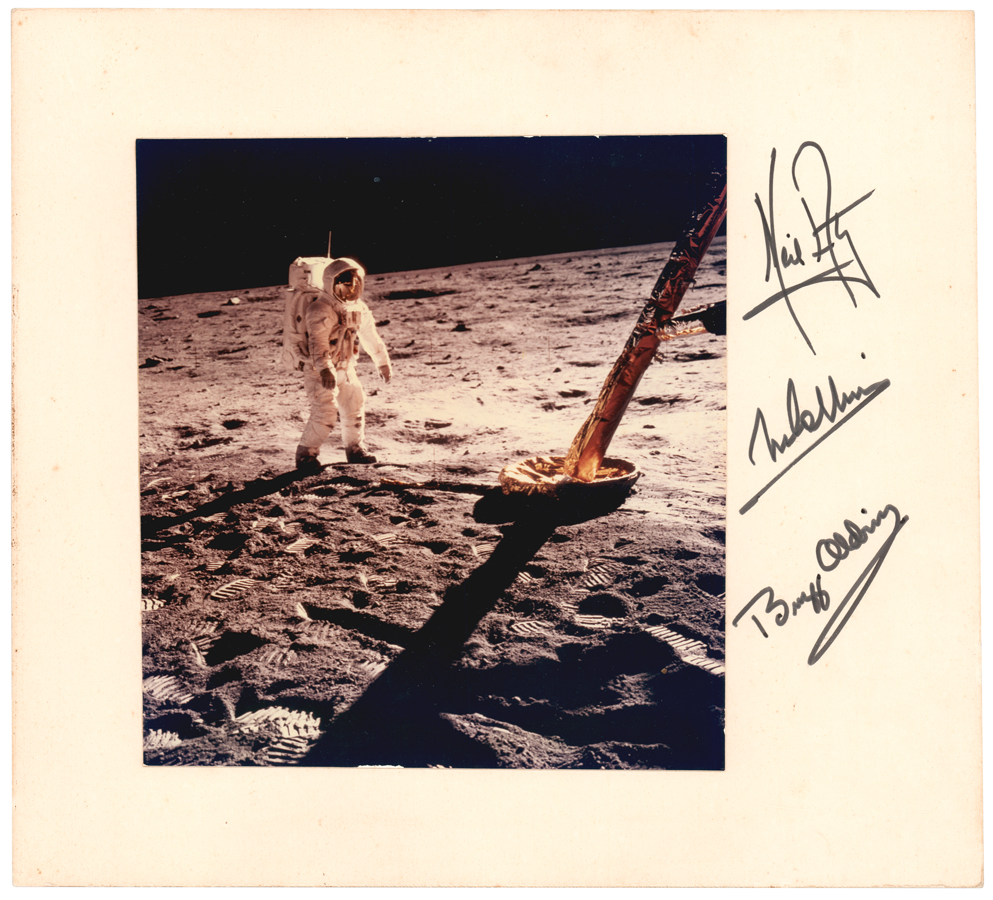 Official color glossy 6.5 x 7.25 NASA photo of LMP Buzz Aldrin standing near one of the large landing legs of the Lunar Module Eagle during the historic EVA of the Apollo 11 mission, affixed to its original 11 x 10 cardstock mount, which is signed in black felt tip by the full crew: “Neil Armstrong,” “M. Collins,” and “Buzz Aldrin.” In fine to very fine condition, with a trivial ding to the center of the top edge. A wonderful fully signed Apollo 11 display piece featuring bold, well-spaced signatures and an excellent lunar surface image.