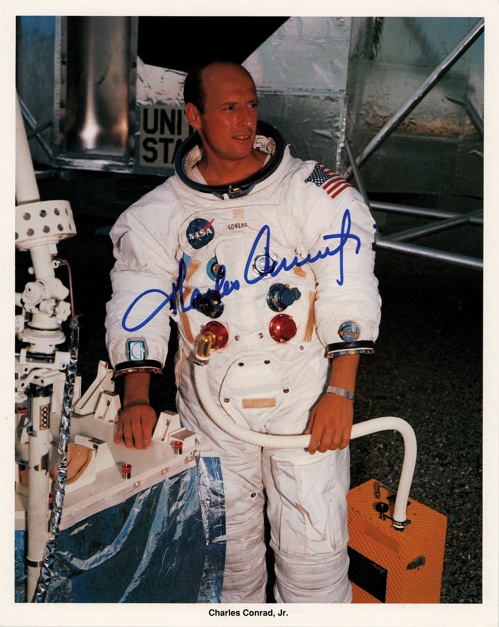Official color 8 x 10 NASA lithograph of Charles Conrad posing in his white space suit, signed in blue felt tip. In very fine condition.