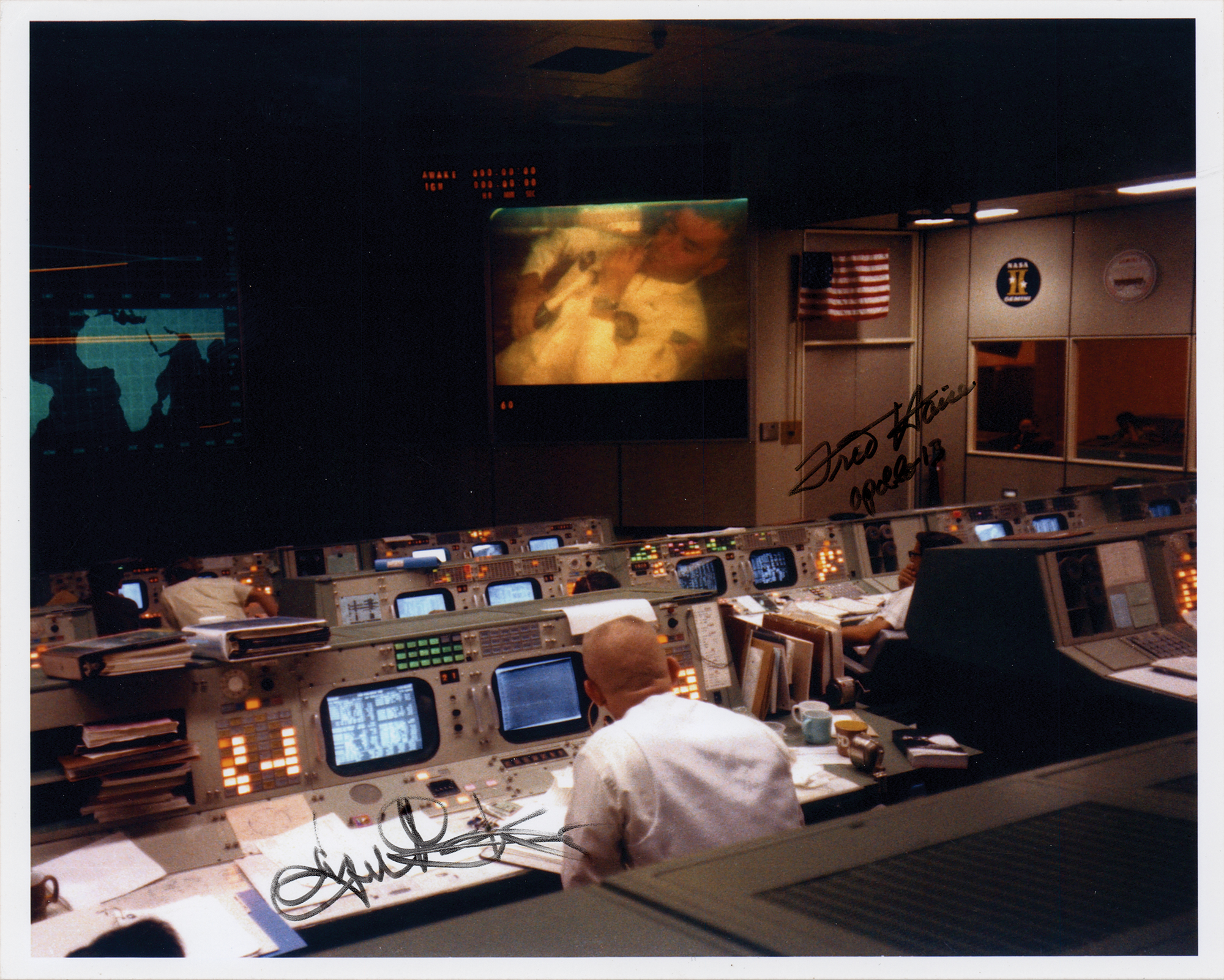 Color satin-finish 10 x 8 photo of Gene Kranz watching an image of Fred Haise on a large screen at mission control during the harrowing Apollo 13 mission, signed in black felt tip, "Fred Haise, Apollo 13" and "Eugene F. Kranz." In fine condition.
