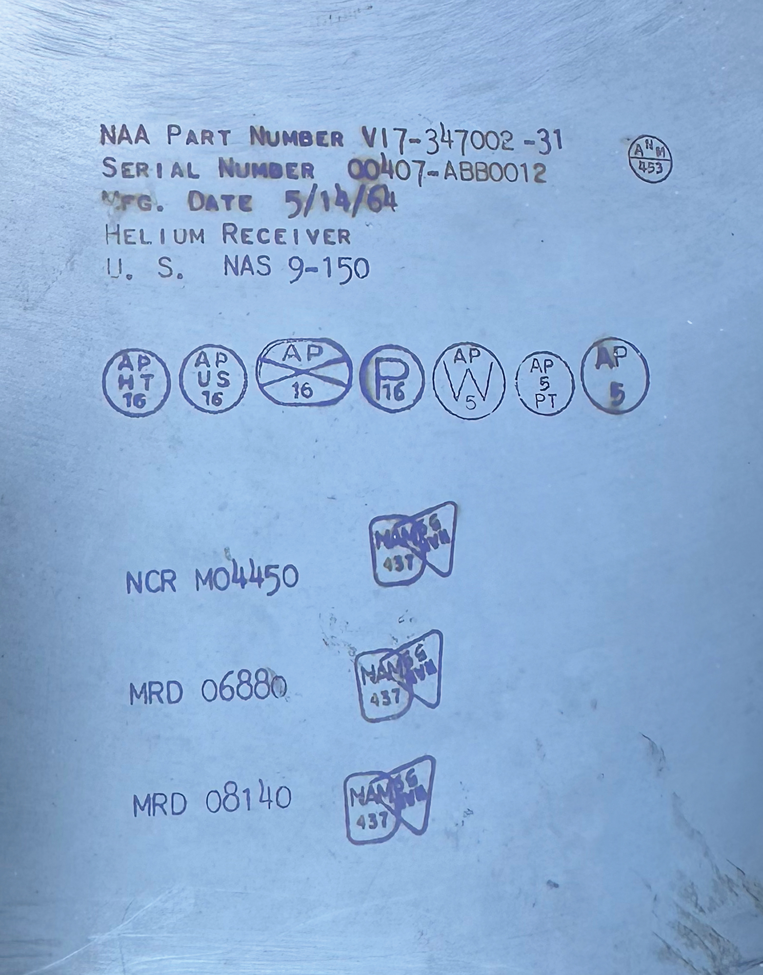Huge spherical titanium Apollo CSM helium tank, measuring approximately 40˝ in diameter, used to pressurize the propellants for the Apollo Service Module Propulsion System (SPS) engine. The tank is marked on the top, "NAA Part Number V17-347002-31, Serial Number 00407-ABB0012, Mfg. Date 5/14/64, Helium Receiver, U.S. NAS 9-150," and bears several inspection labels. The tank is built to carry 19.6 cubic feet of helium gas, pressurized at 3600 psi. Centrally located within the CSM, two tanks were used to 'pump' fuel and oxygen for the SPS engine by injecting inert helium gas.