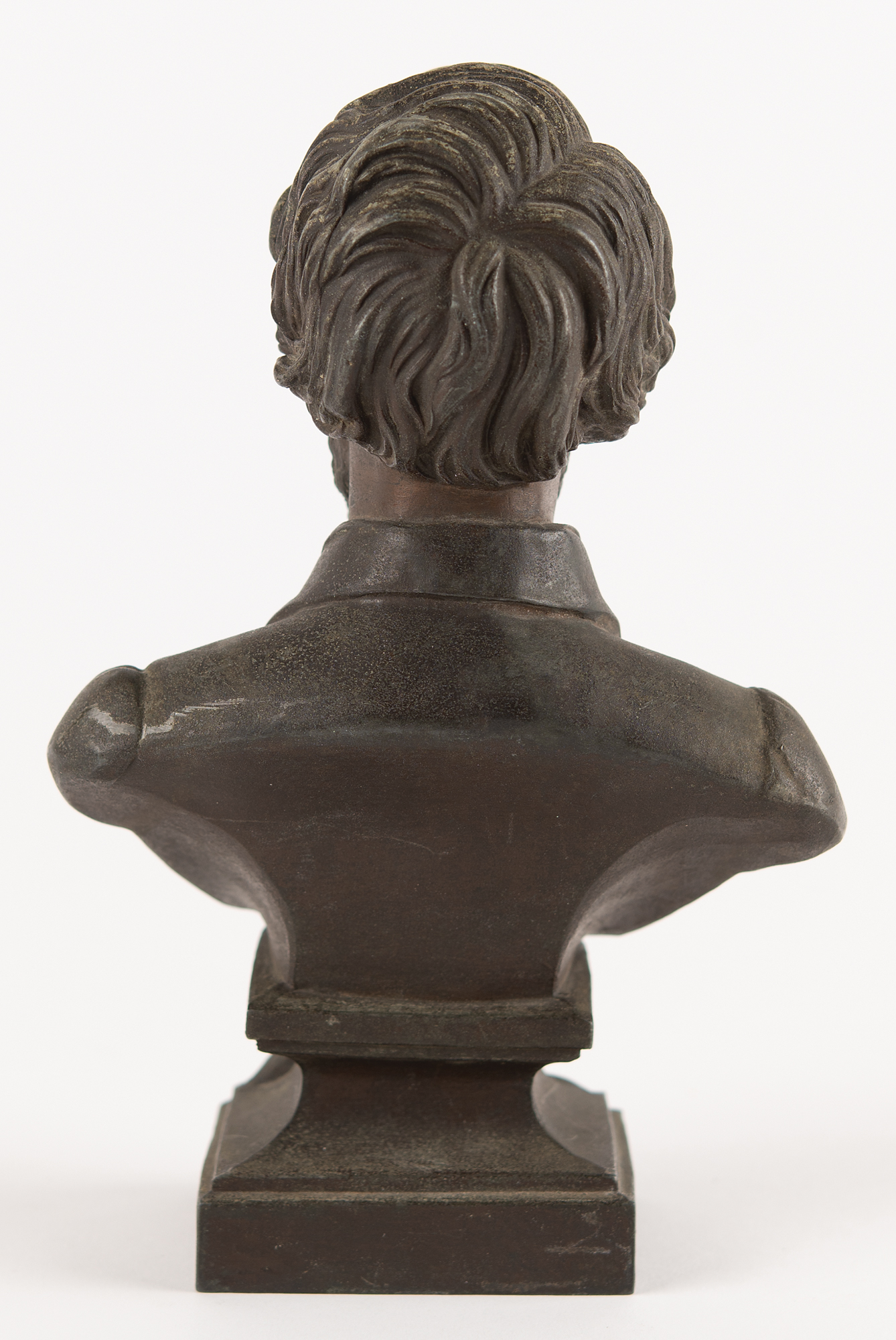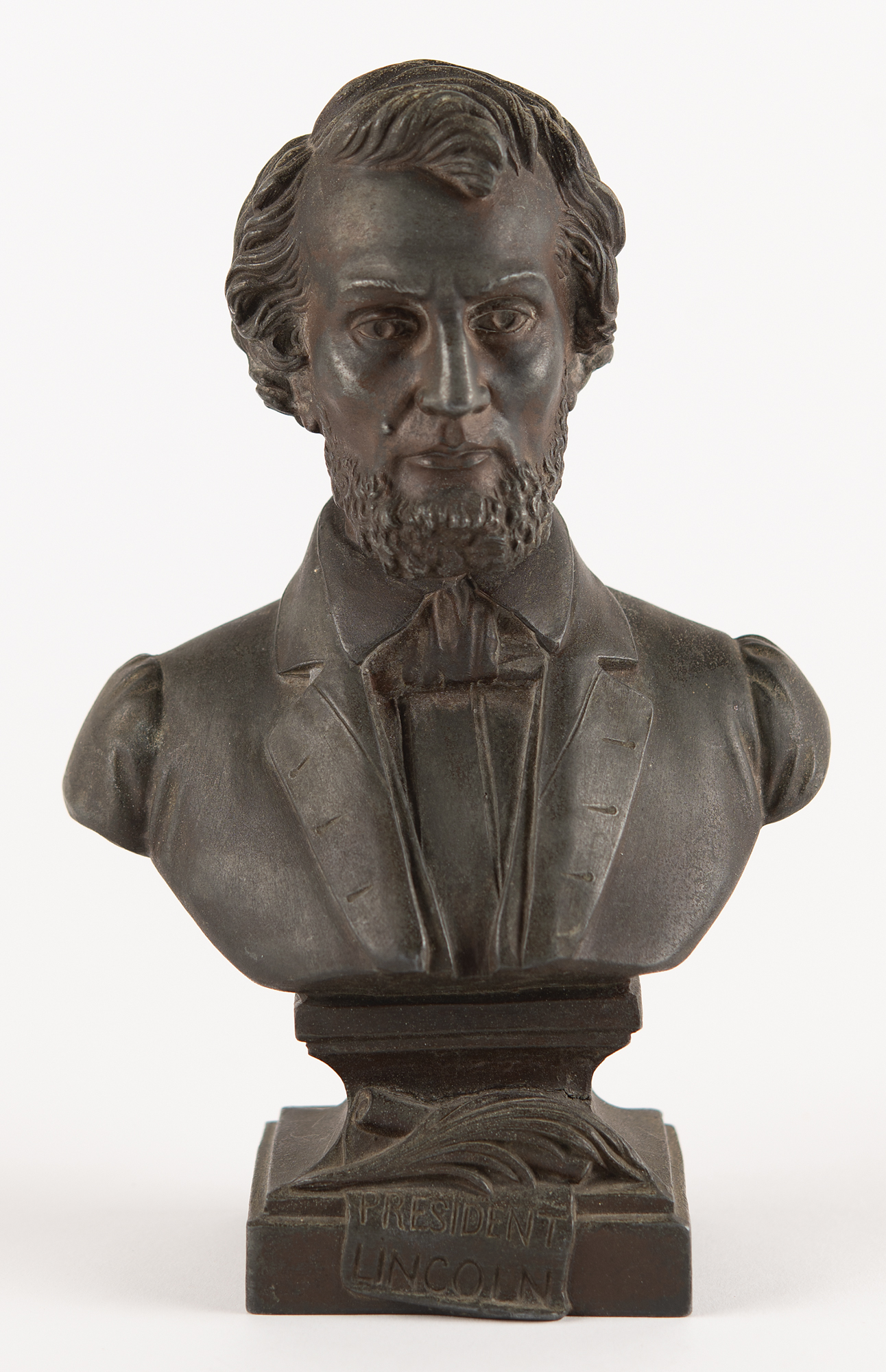Hollow cast-metal bust of President Abraham Lincoln, measuring approximately 5.5˝ x 8.5˝ x 3˝, with a scroll-style name tablet on the base: "President Lincoln." In fine condition.