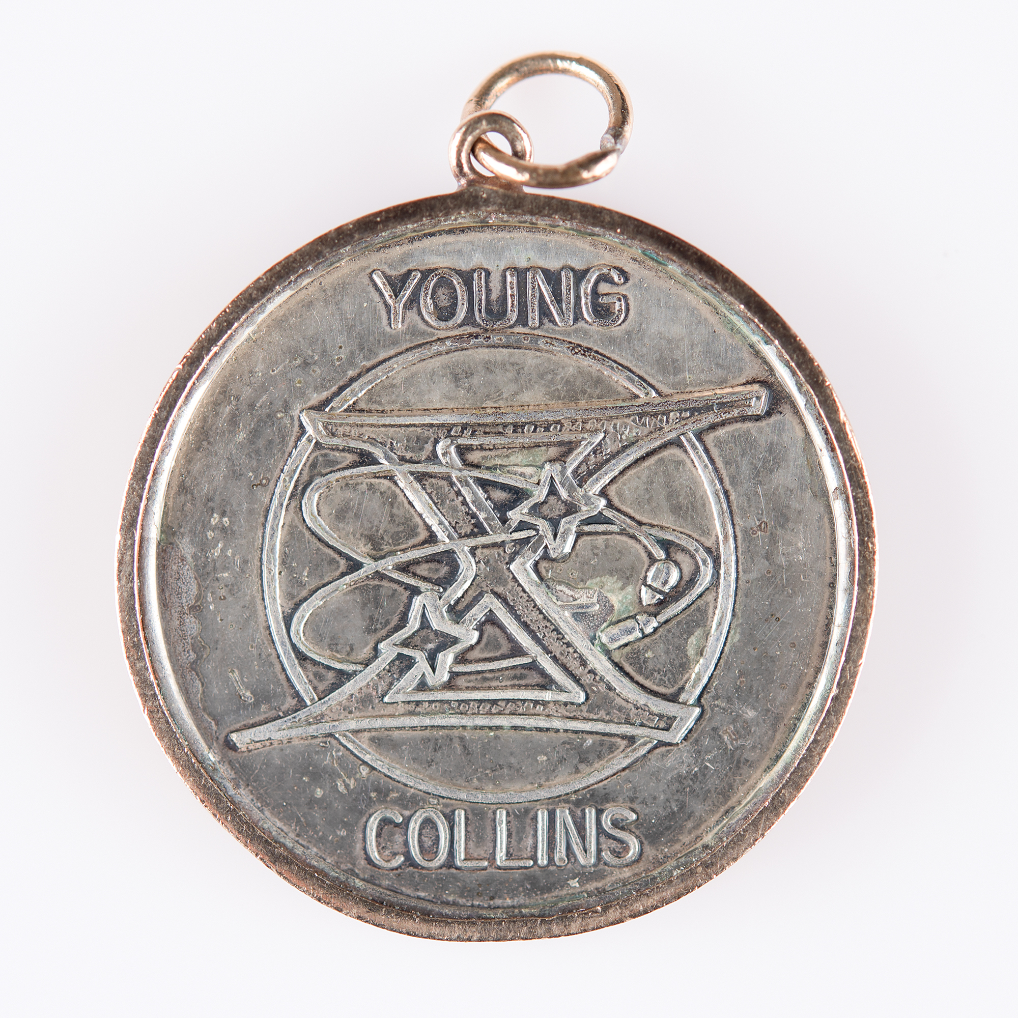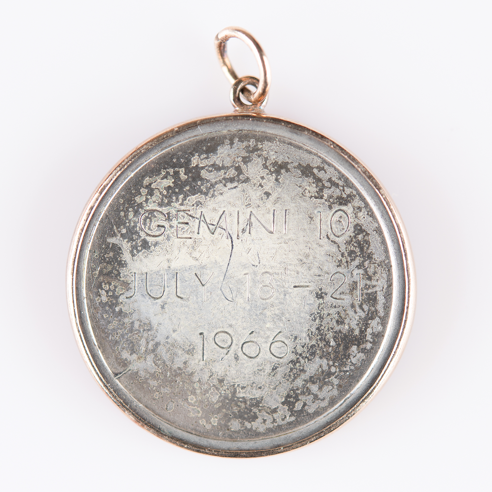 Flown silver-tone Gemini 10 Fliteline medallion, 1" in diameter, with the front featuring a raised design of the mission insignia with astronaut surnames ("Young / Collins"), and the reverse engraved with the mission name and date, "Gemini 10, July 18-21, 1966." Displayed in a 24K gold bezel. In very good to fine condition, with some light tarnishing. Consignor notes that this originates from the collection of Jim Rathmann, the owner of a Chevrolet-Cadillac dealership in Melbourne, Florida, who famously procured the Corvettes favored by the astronauts.