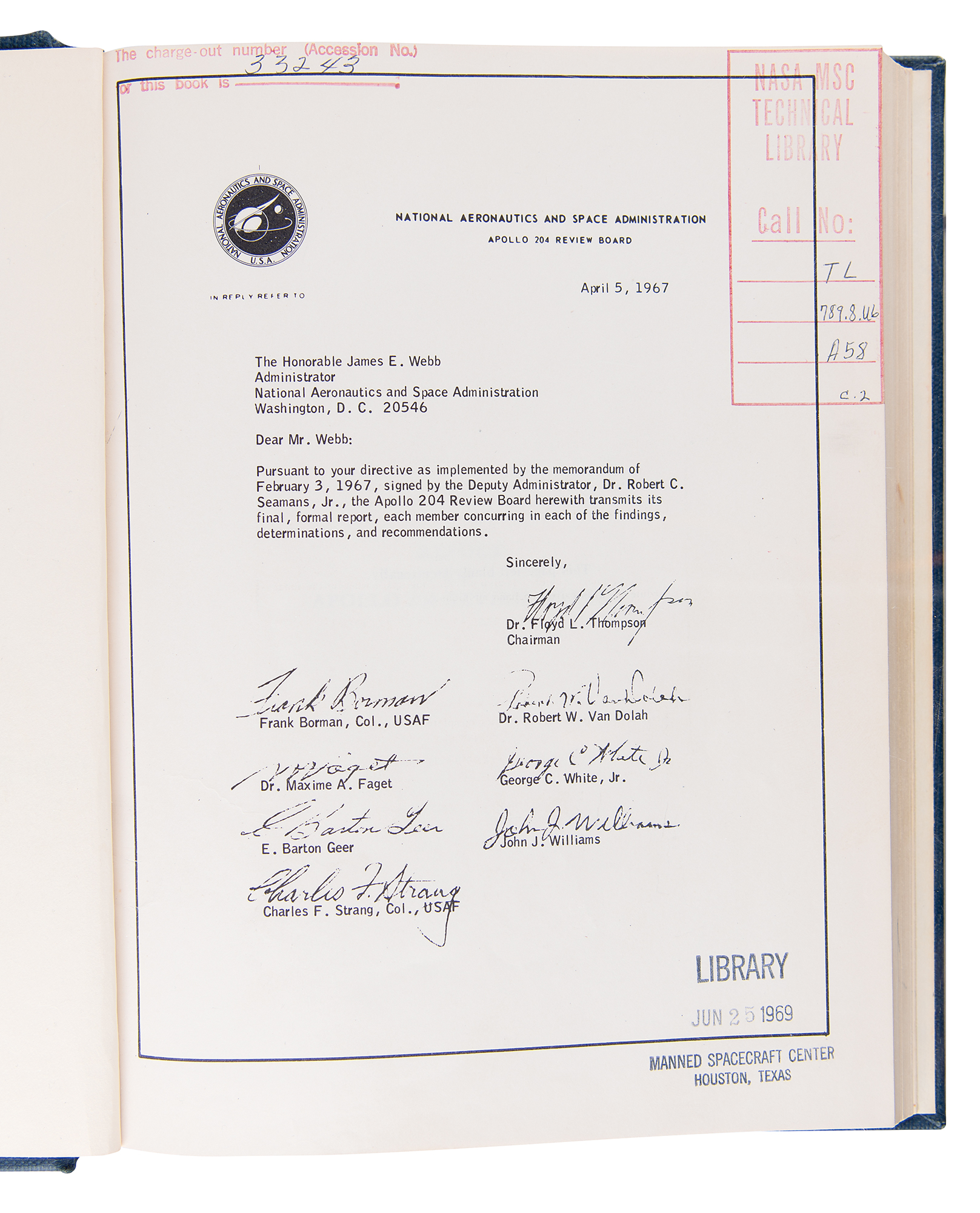Scarce NASA-printed manual for the “Report of Apollo 204 Review Board to the Administrator National Aeronautics and Space Administration,” 8 x 10.5, totaling approximately 168 pages (including plates and fold-out diagrams related to the Apollo 1 accident and capsule), April 5, 1967. Bound in a navy blue cloth library binding, with gilt-stamped title and accession numbers on the spine, and NASA Manned Spacecraft Center Technical Library stamps throughout.