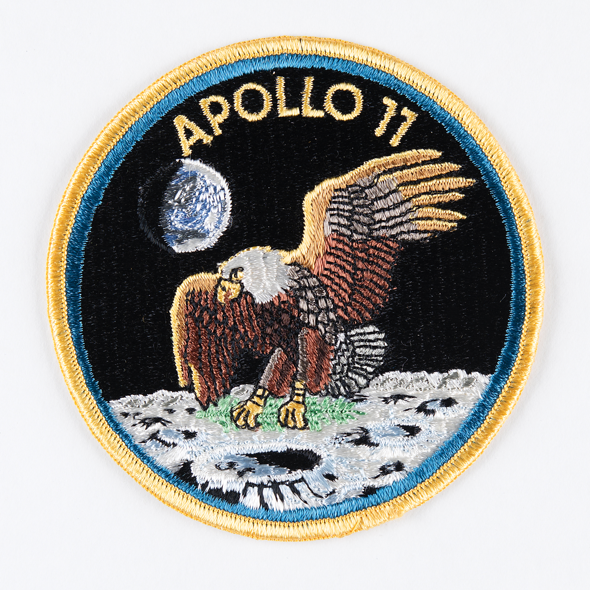 Rare Apollo 11 crew patch manufactured by Texas Art Embroidery, measuring 4˝ in diameter, featuring a very accurate embroidered rendition of the mission insignia. In very fine condition. This patch design was worn by the crew on their Biological Isolation Garments at recovery time and then later on their blue post-flight jump suits. The Texas Art Embroidery Apollo 11 'Bio-Garment' patch was released in very limited quantity and only made available to the crew and NASA employees.
