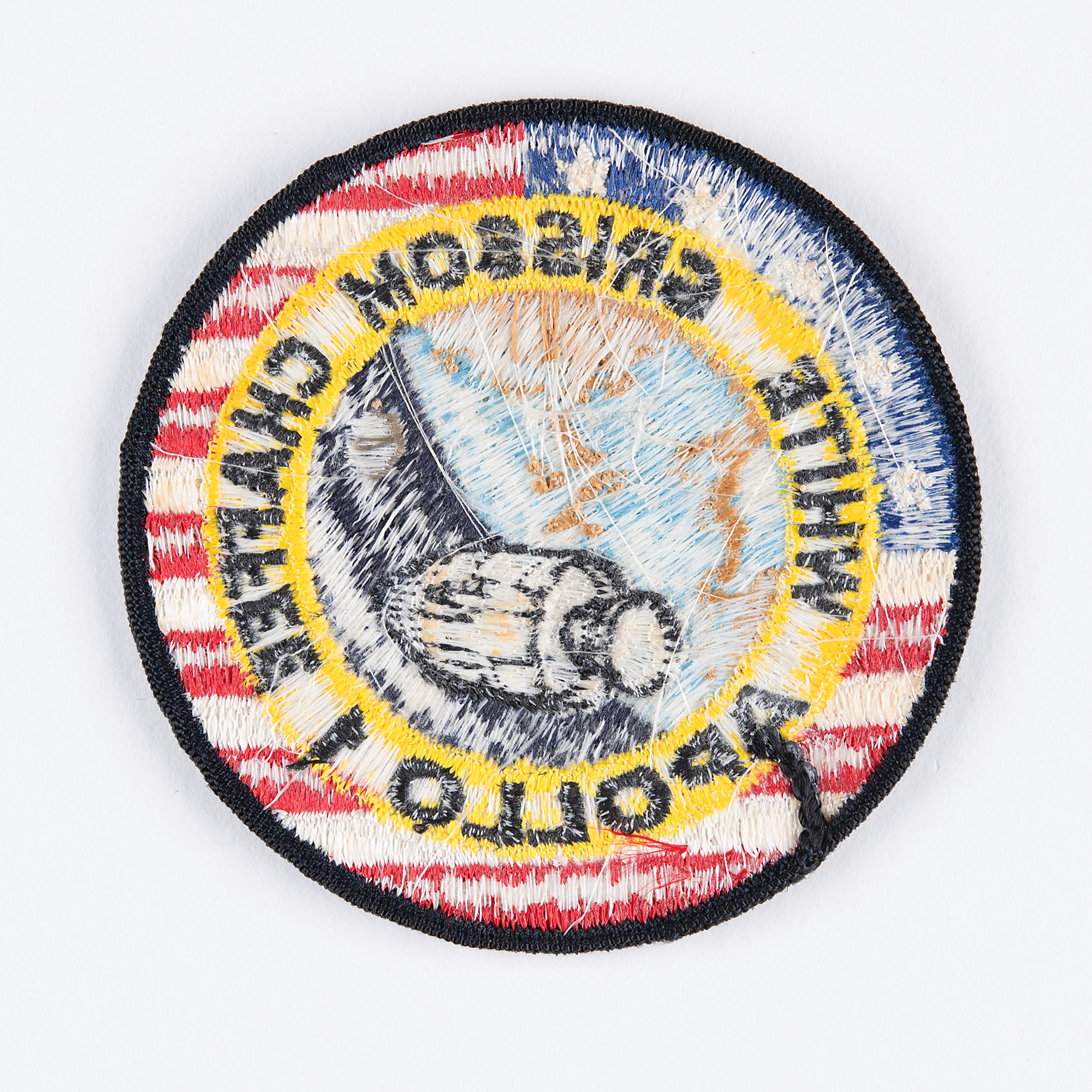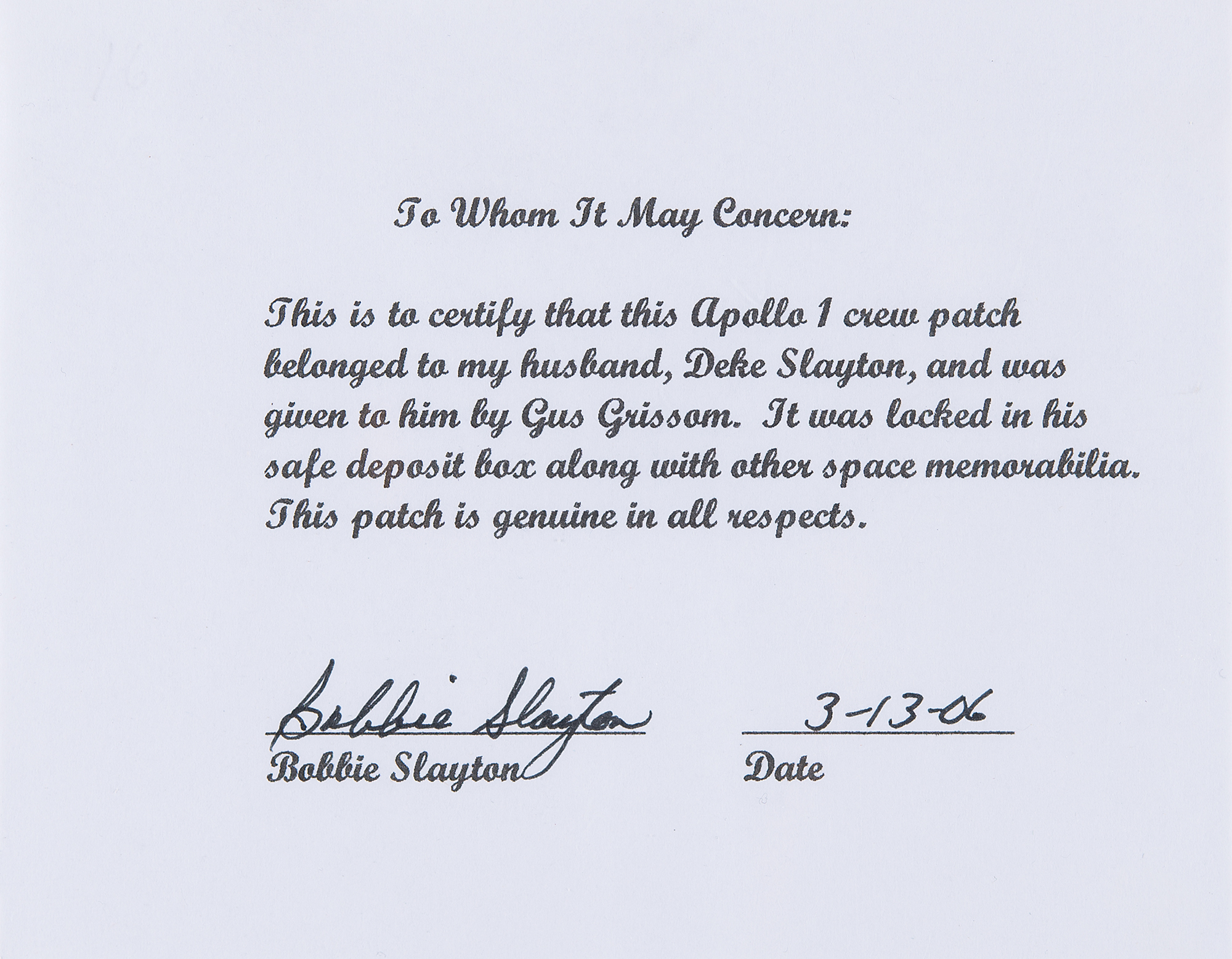 Rare embroidered Apollo 1 mission patch deriving from the personal collection of original Mercury astronaut Deke Slayton. The patch measures 3.5″ in diameter and was manufactured by the Stylized Emblem Co., though their label is absent. Includes a signed letter of provenance from Bobbie Slayton, dated March 13, 2006, in full: "This is to certify that this Apollo 1 crew patch belonged to my husband, Deke Slayton, and was given to him by Gus Grissom. It was locked in his safe deposit box along with other space memorabilia. This patch is genuine in all respects." In fine condition. From one Mercury astronaut to another, this is a highly coveted original Apollo 1 mission patch—examples of such were only distributed to the crew and a few NASA workers.