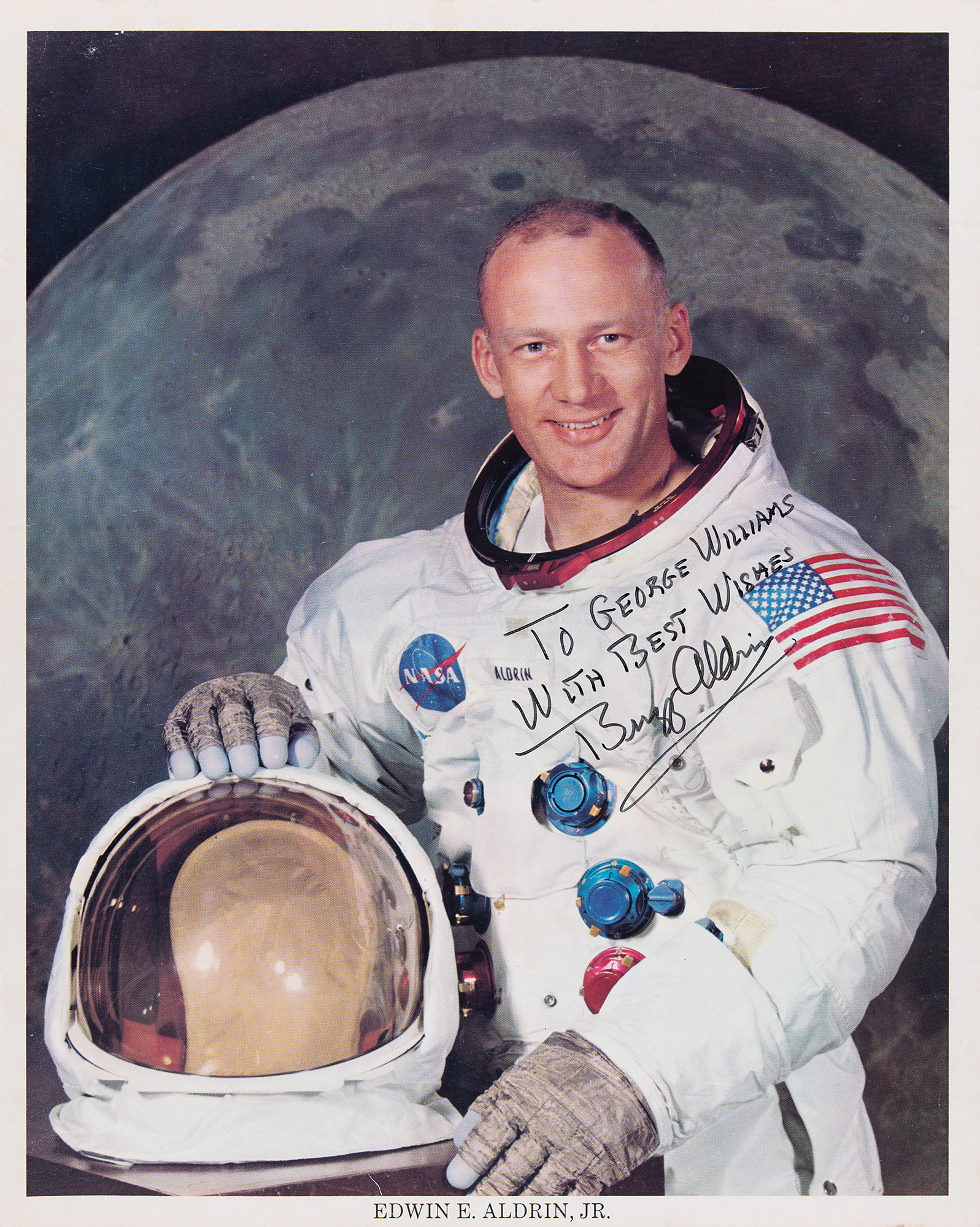 Official color 8 x 10 NASA lithograph of Aldrin posing in his white space suit against a lunar background, signed and inscribed in black felt tip, "To George Williams, With Best Wishes, Buzz Aldrin.” In fine condition.