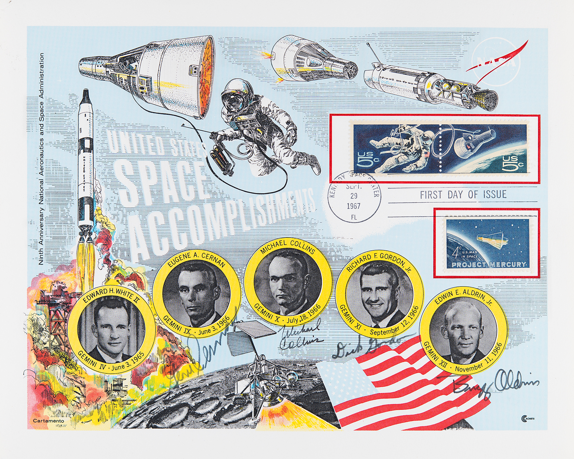 Uncommon and attractive color 10 x 8 print honoring "United States Space Accomplishments," featuring affixed stamps honoring Project Mercury and Project Gemini (with first-day cancelation), signed in black felt tip by Gene Cernan, Michael Collins, Richard Gordon, and Buzz Aldrin. In very fine condition.