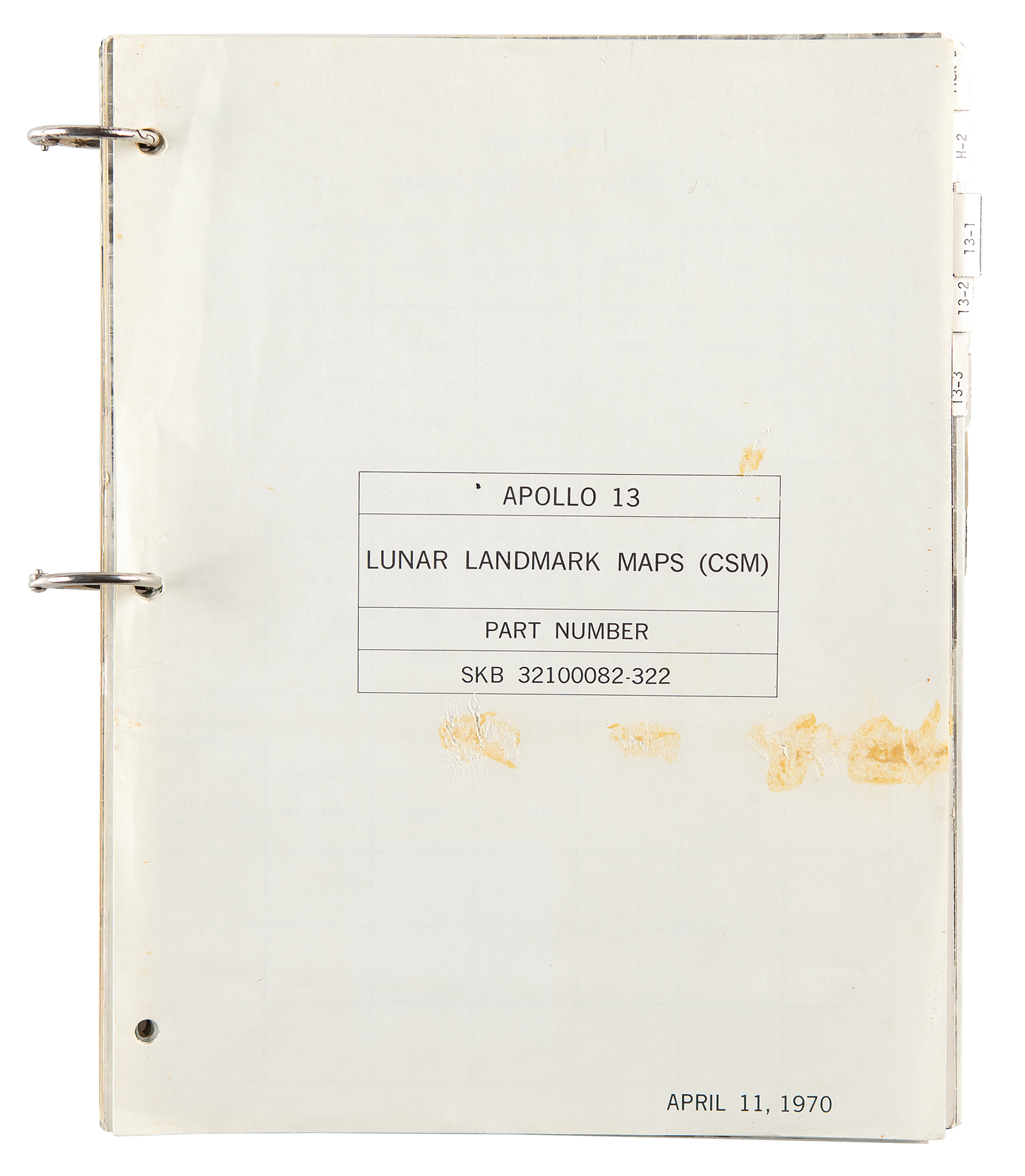 Ring-bound set of "Apollo 13 Lunar Landmark Maps (CSM), Part Number SKB 32100082-322," April 11, 1970, 8.25 x 10.5, containing mapping images of various lunar landmarks and fold-out ascent charts, separated by tabbed pages with descriptions of the landmarks and viewing angles. In fine condition, with stains to the front cover.