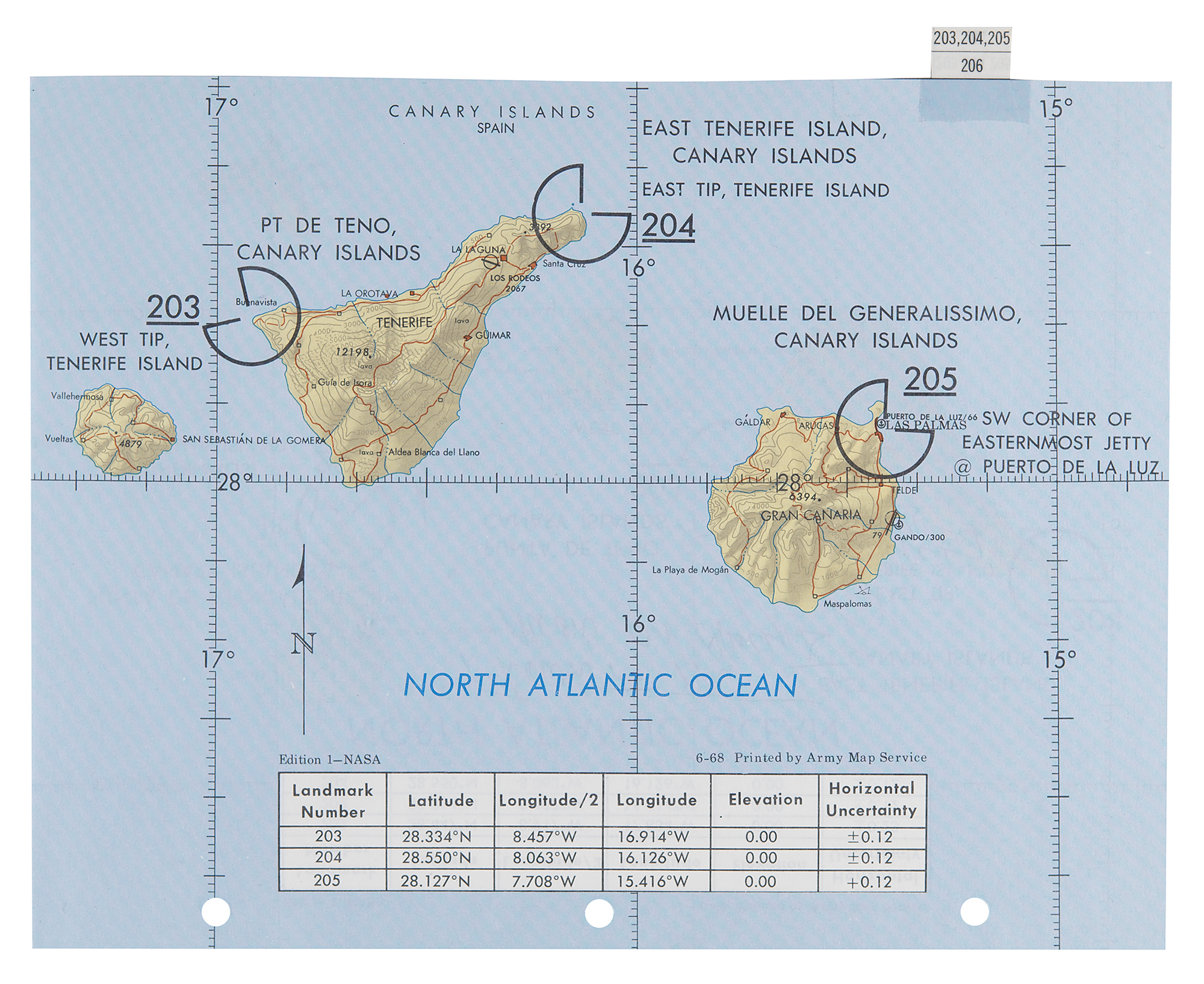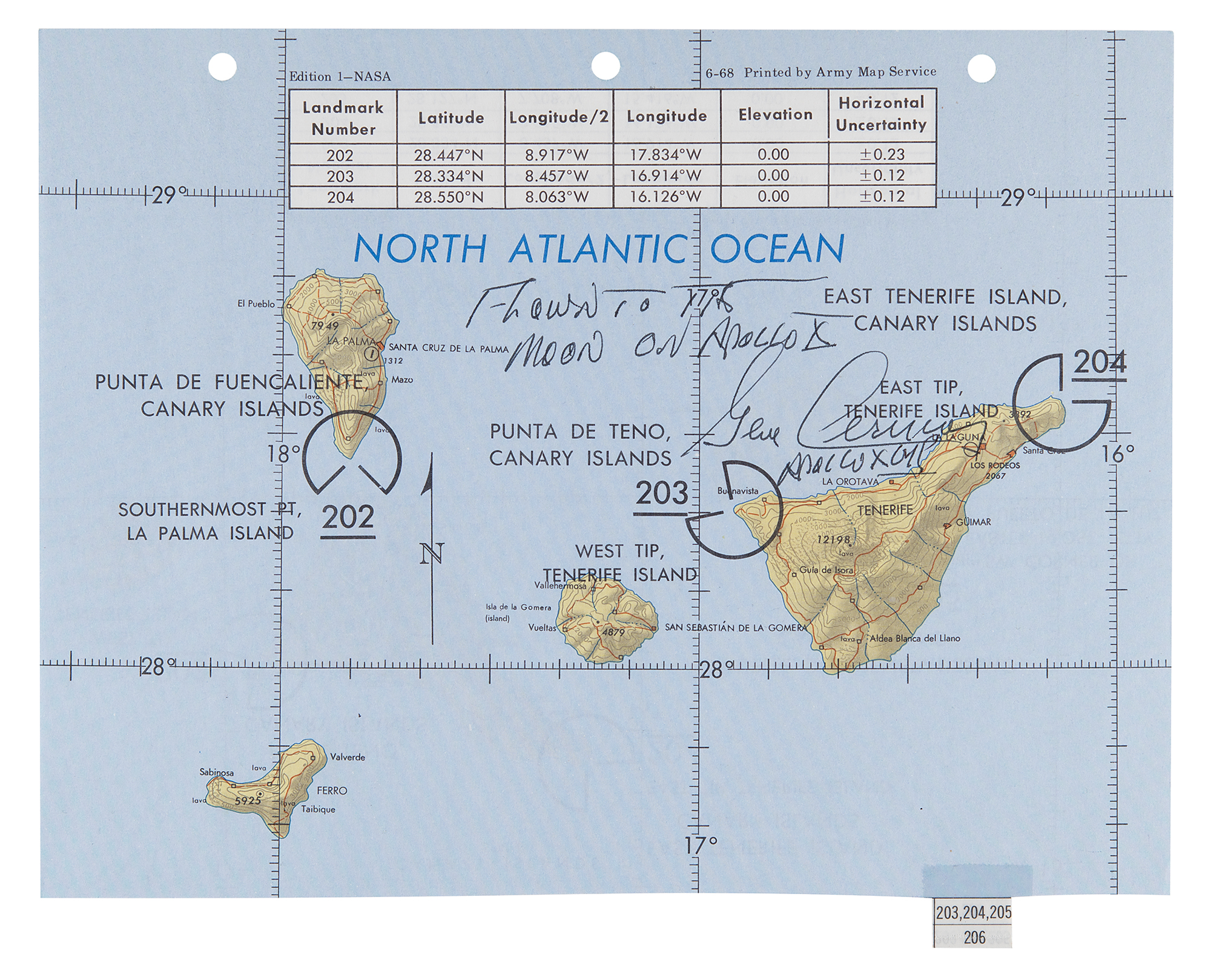 Scarce flown double-sided 10.5 x 8.5 first edition NASA Earth landmark map carried into lunar orbit during the Apollo 10 mission, signed and flight-certified in black ink, "Flown to the moon on Apollo X, Gene Cernan, Apollo XVII." Printed by the Army Map Service, the map shows the North Atlantic Ocean with a focus on the Canary Islands, with a tab identifying the page as "203,204,205/206." In very fine condition.