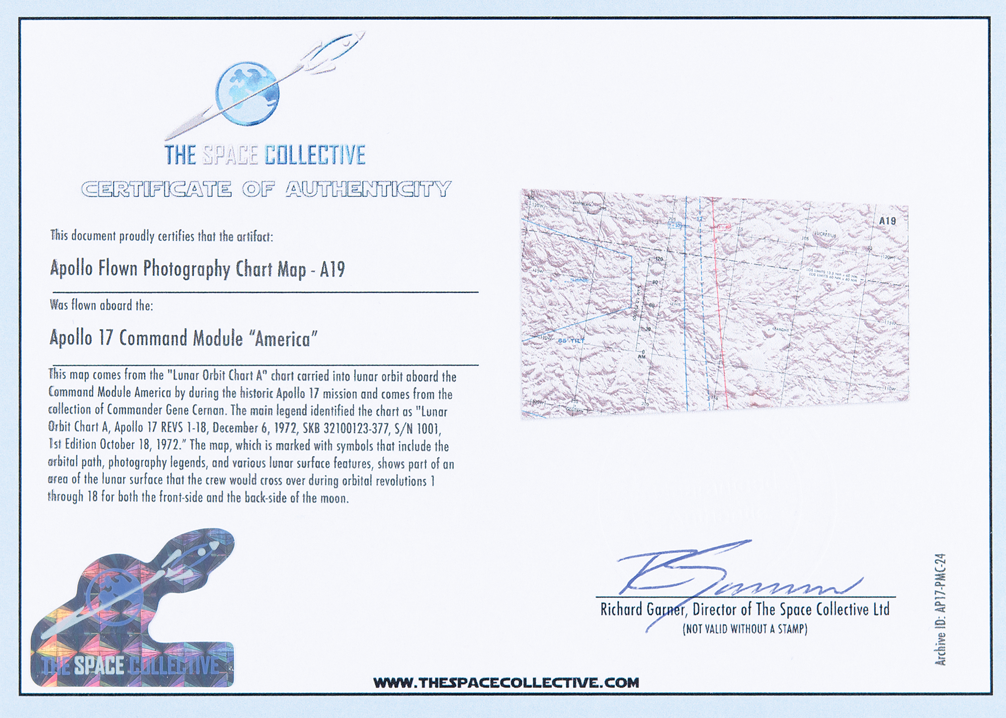 Map plate attested as deriving from Gene Cernan’s flown “Lunar Orbit Chart A” map that was carried into lunar orbit aboard the Command Module America during the historic Apollo 17 mission. The map, 13 x 7.75, is identified as “A19” and is marked with symbols that include the orbital path and various lunar surface features. Primarily used for photography, the map shows a portion of the lunar surface area that the crew would cross over during orbital revolutions 1 through 18 for both the front side and the back side of the moon. The legend from this map’s original chart identified it as “Lunar Orbit Chart A, Apollo 17 REVS 1-18, December 6, 1972, SKB 32100123-377, S/N 1001, 1st Edition October 18, 1972.” In fine condition. Accompanied by a copy of a page from the Apollo 17 stowage list, which highlights the inclusion of ‘Lunar Orbit Chart A,’ and by a certificate of authenticity from The Space Collective.
