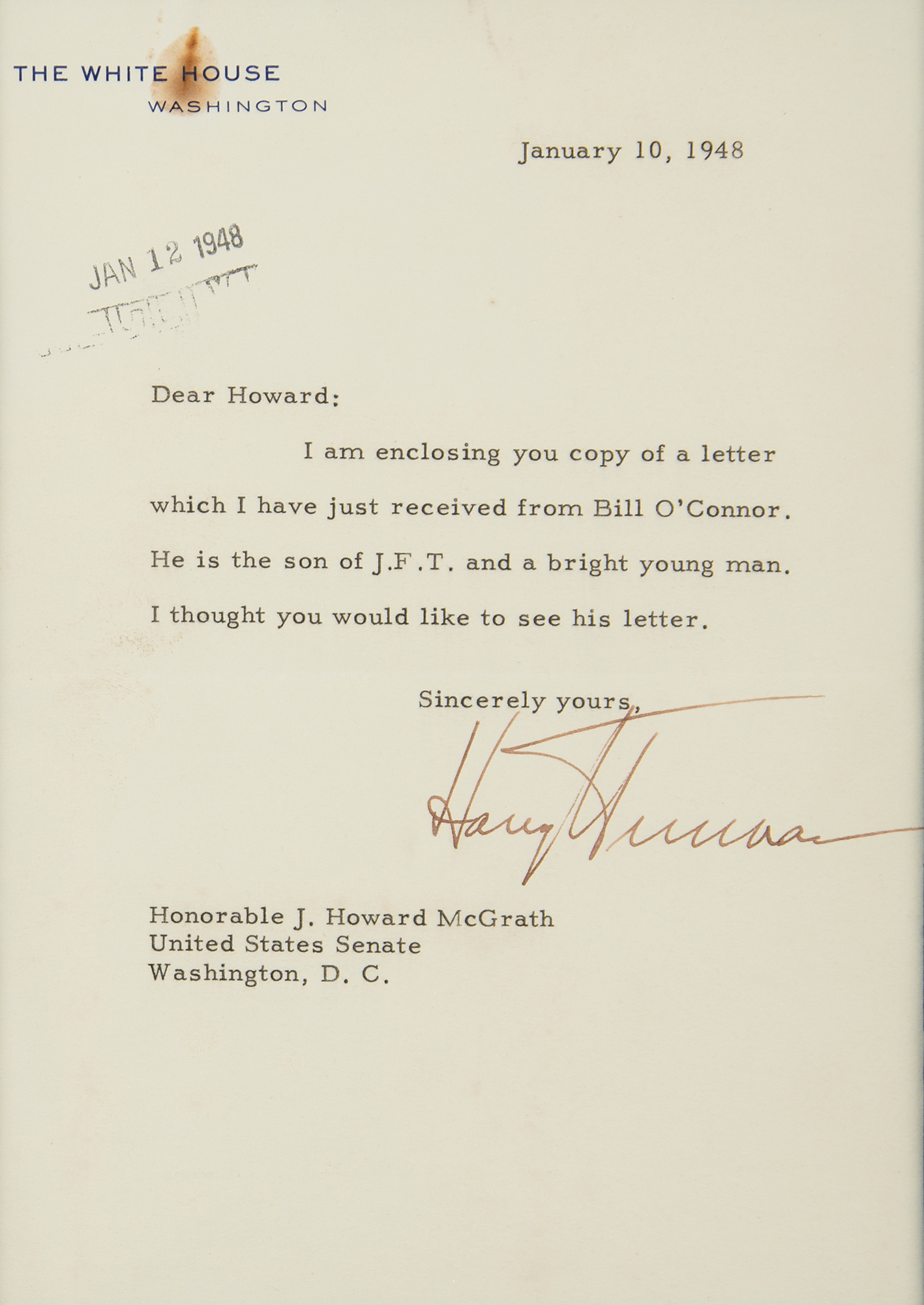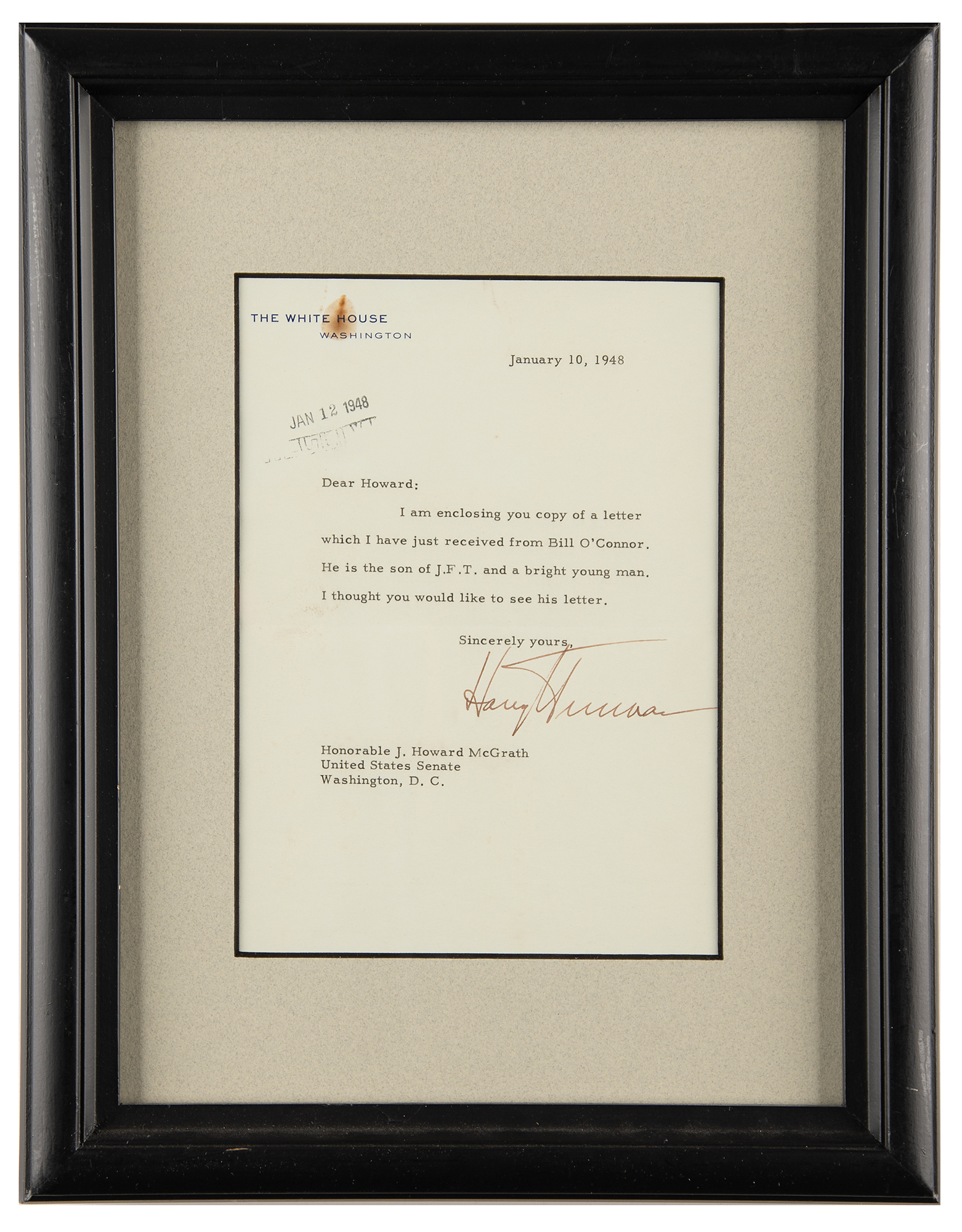TLS as president, one page, 5.75 x 8, White House letterhead, January 10, 1948. Letter to Rhode Island Senator J. Howard McGrath, in full: “I am enclosing you a copy of a letter which I have just received from Bill O’Connor. He is the son of J. F. T. and a bright young man. I thought you would like to see his letter.” Matted and framed to an overall size of 11 x 14. In fine condition, with a rusty paperclip stain to the letterhead.