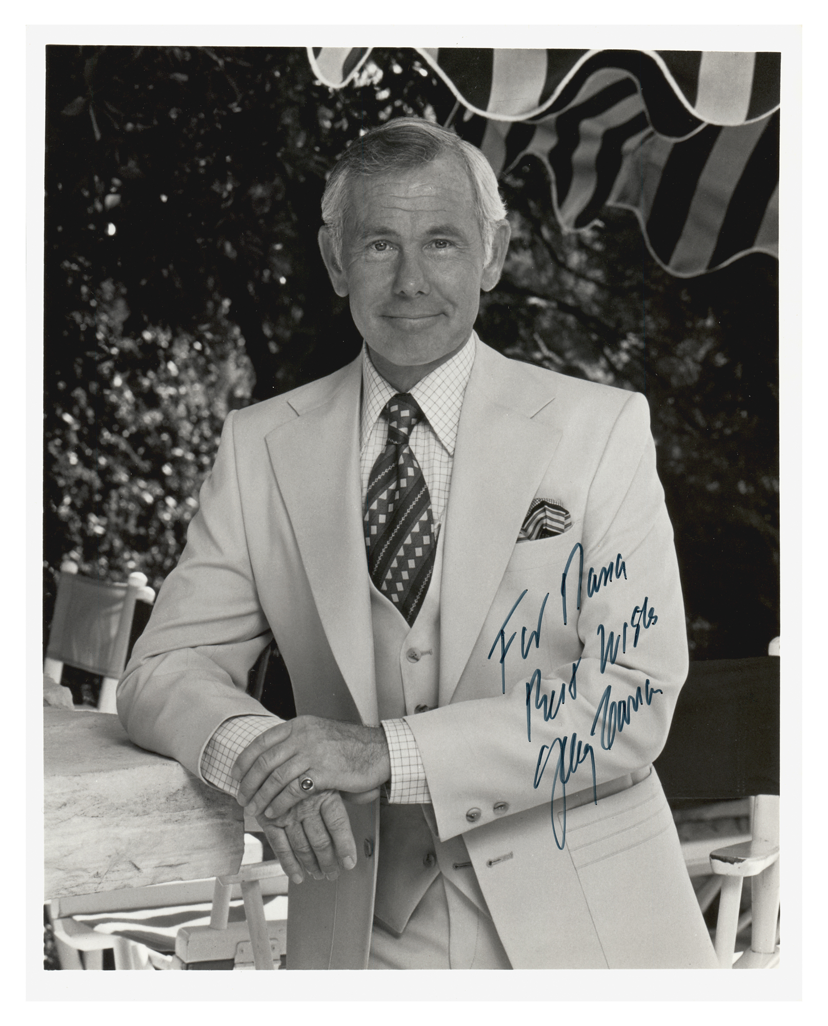 Glossy 8 x 10 half-length photo of the Tonight Show icon, signed and inscribed in black felt tip, "For Dana, Best wishes, Johnny Carson.” In fine condition.