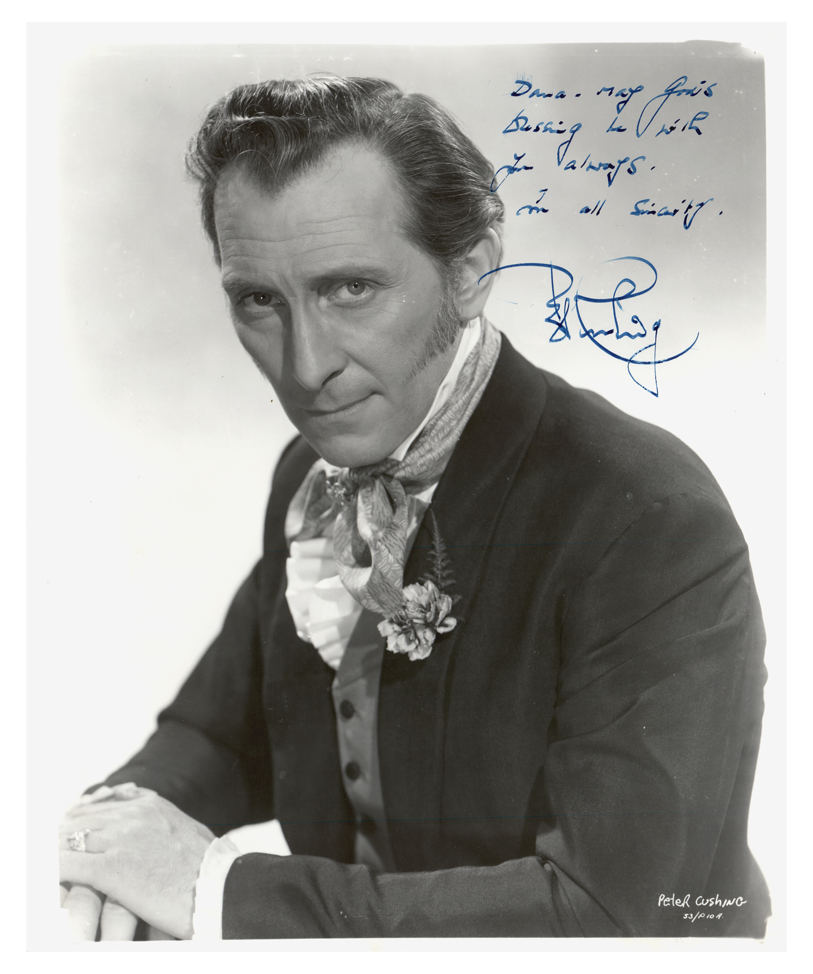Glossy 8 x 10 photo of Cushing in costume, signed and inscribed in fountain pen, "Dana—May God's blessing be with you always. In all sincerity, Peter Cushing.” In fine condition, with some tiny surface impressions at the top.