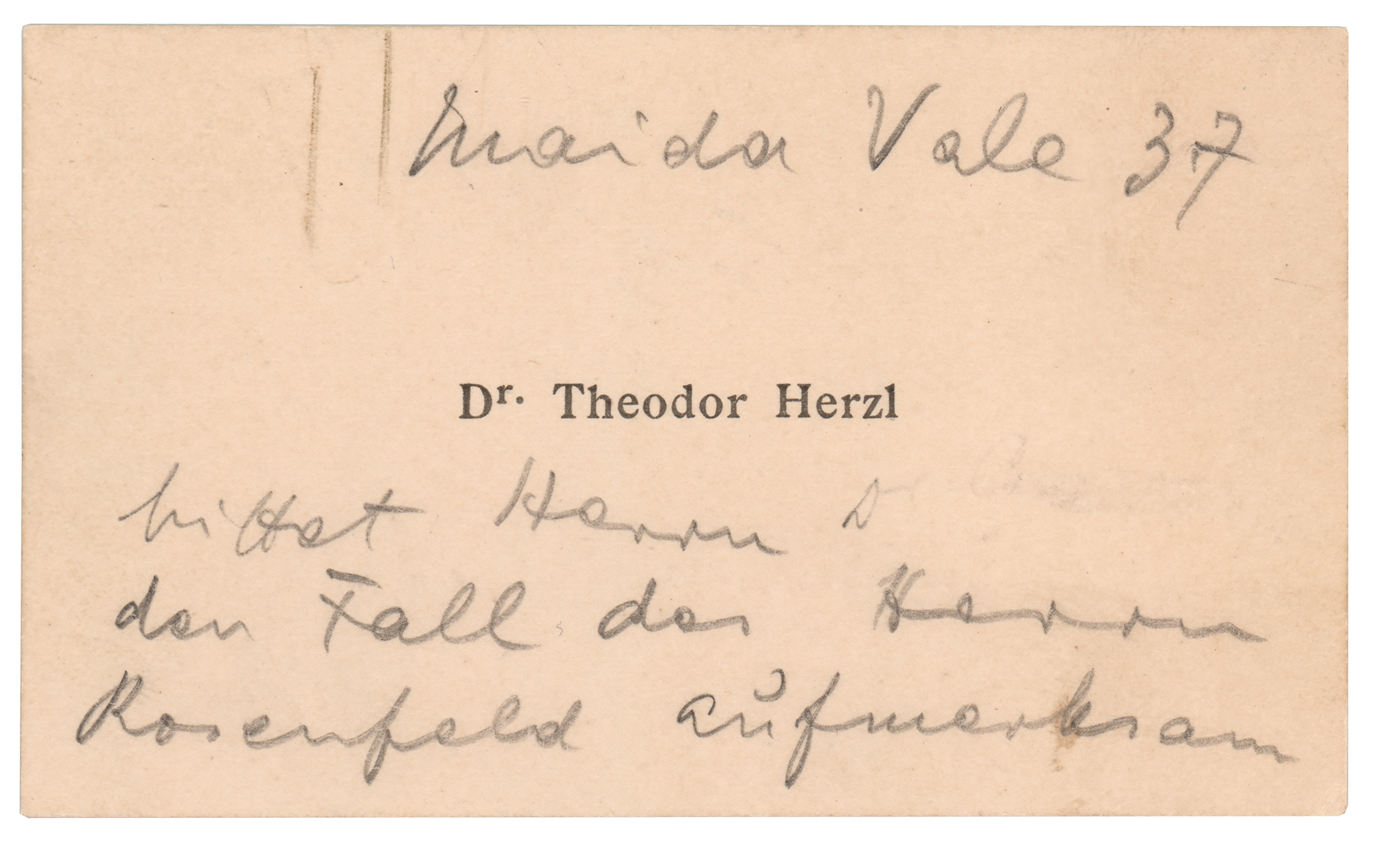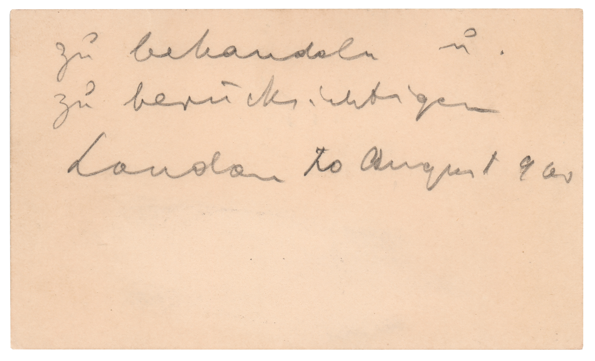 Hungarian-born Austrian founder of Zionism (1860–1904). Handwritten note in German on both sides of an off-white 3.75 x 2.25 visiting card, imprinted with his name "Dr. Theodor Herzl." Herzl writes a brief untranslated note in pencil, dated at London, August 20, 1900. In fine condition, with a light paperclip impression.