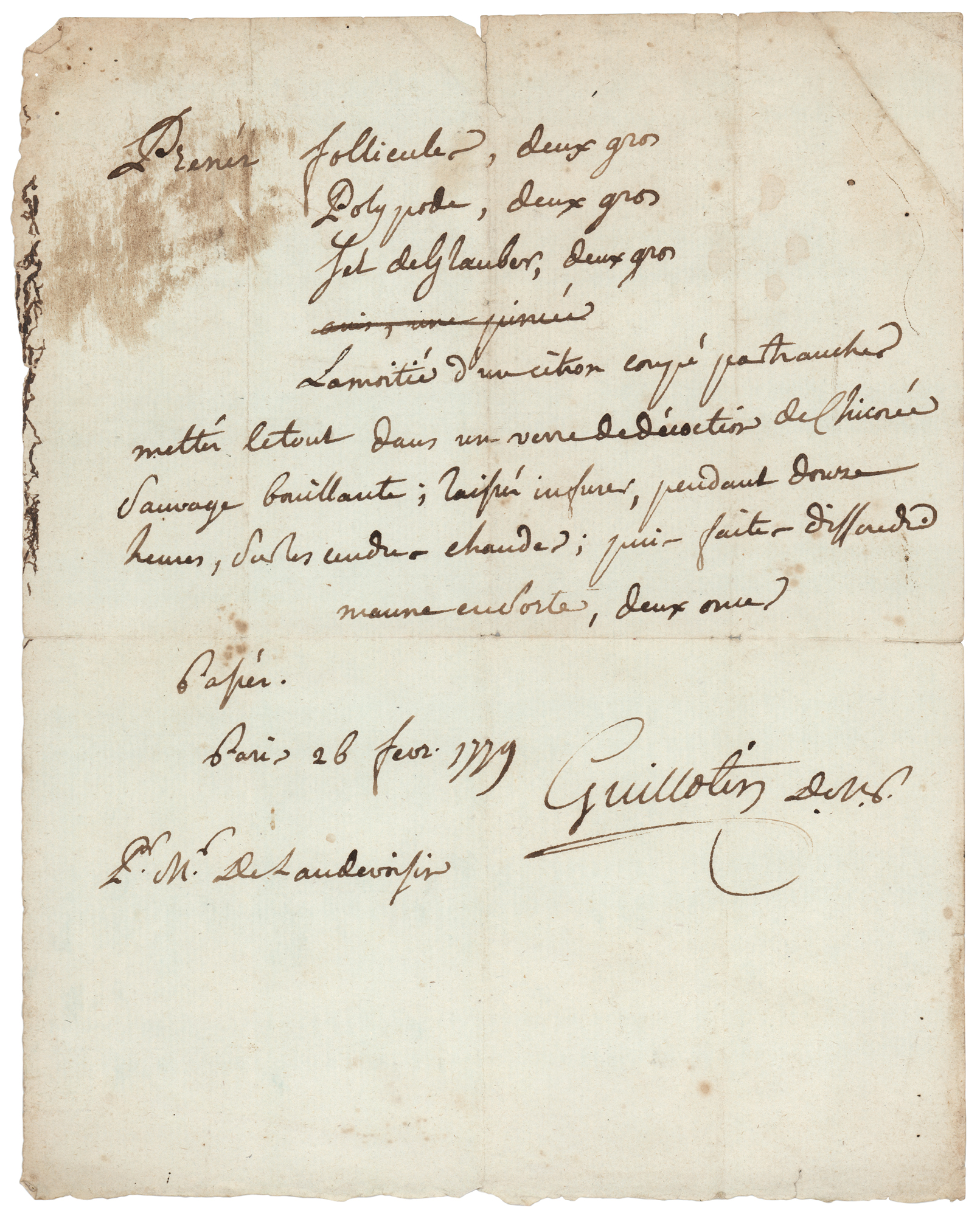 French physician and politician (1738-1814) whose name became synonymous with the 'humane' instrument of execution whose use he proposed to the government during the French Revolution. Scarce ALS in French, signed “Guillotin,” one page, 6.75 x 8.5, February 26, 1779. Untranslated handwritten letter by Joseph Guillotin, containing medical advice. In very good to fine condition, with scattered staining, light creasing, and some short edge tears.
