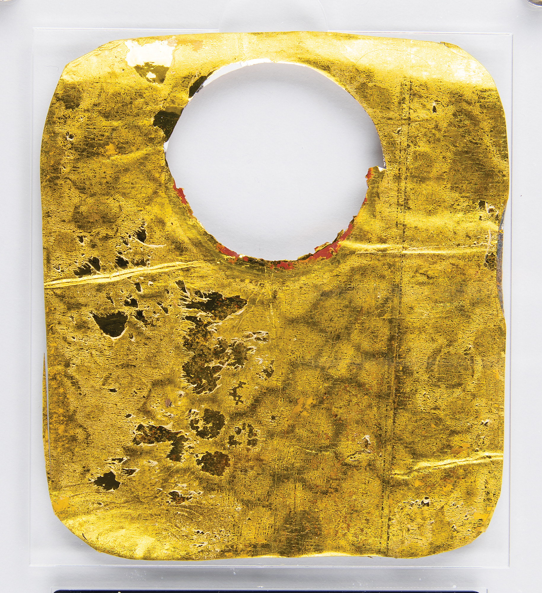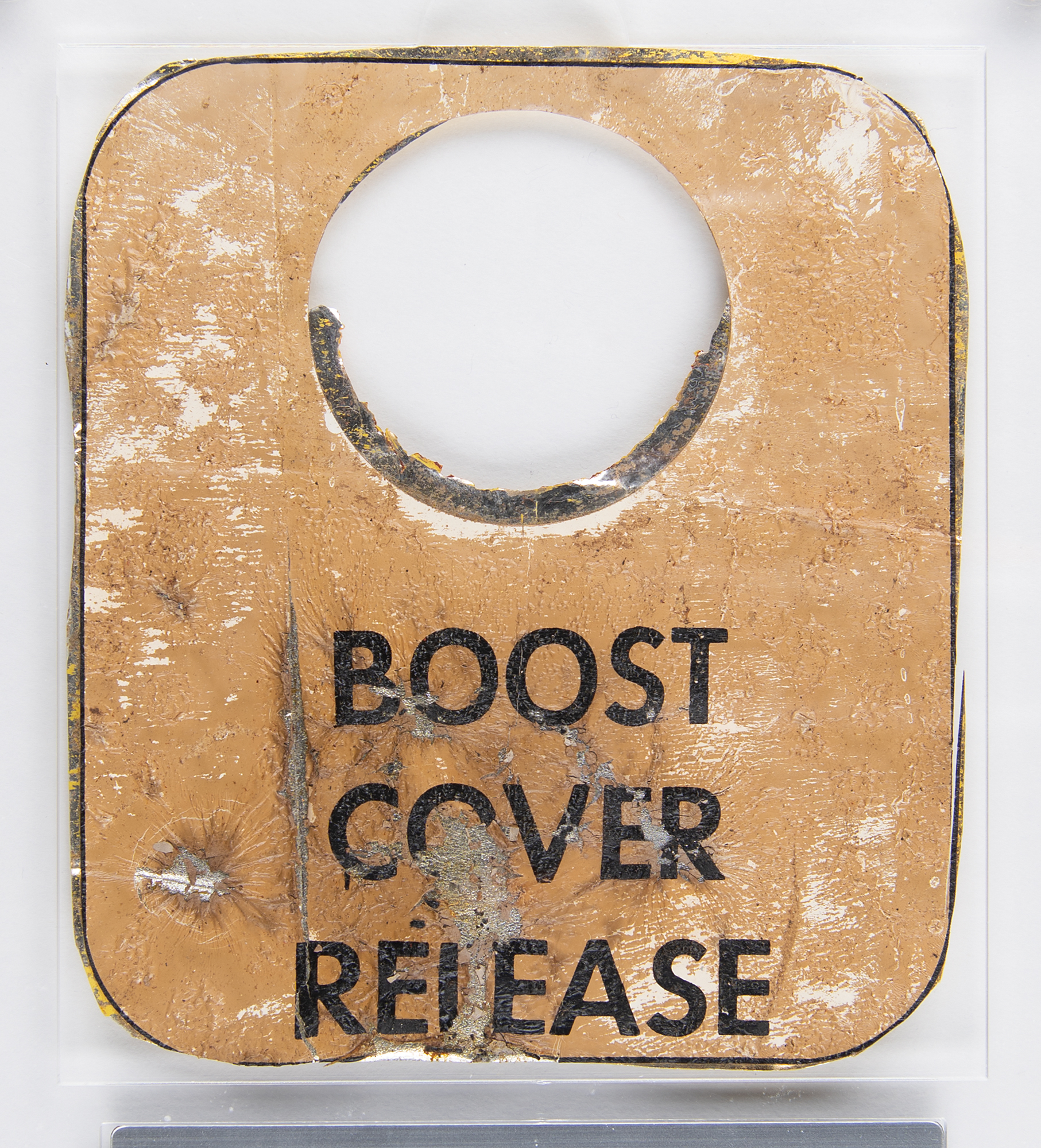 Entry-burned ‘Boost Cover Release’ label from the Apollo 12 CM Yankee Clipper by a North American Aviation recovery team leader