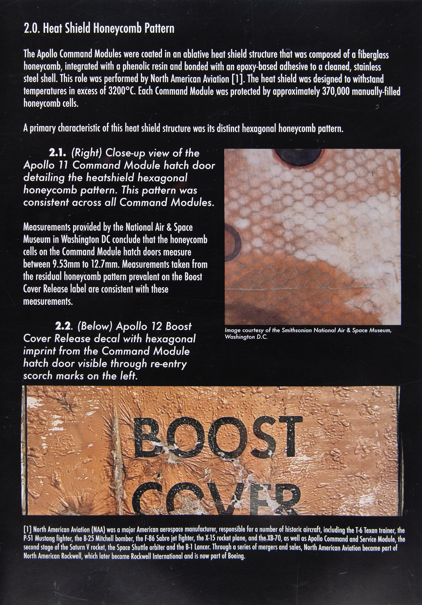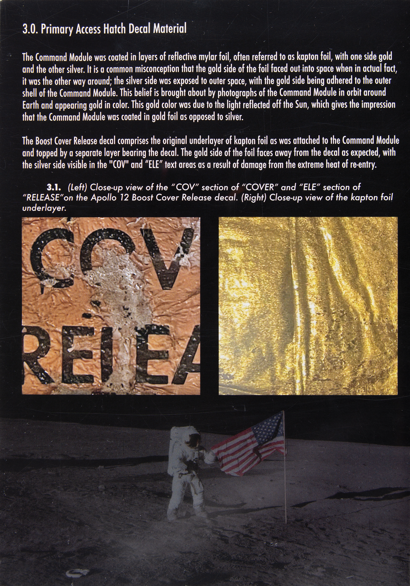 The ‘Boost Cover Release’ decal was used to indicate to the NASA ground crew where to insert their tools to release the boost cover on the primary access hatch in the event of an emergency on the pad. This system would allow the crew to escape the vehicle as soon as possible, a safety precaution designed and built into all command modules after the tragic deaths of the Apollo 1 crew.