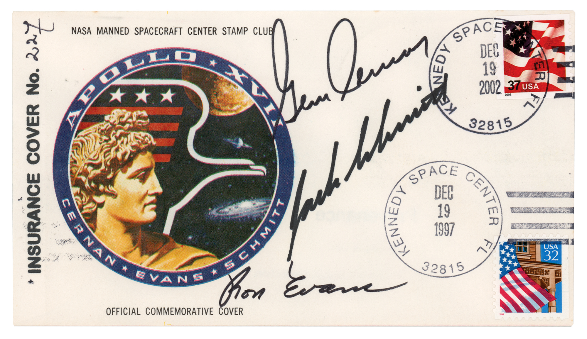 Apollo 17 anniversary cover with a cachet of the mission insignia and text to top and bottom, "NASA Manned Spacecraft Center Stamp Club, Official Commemorative Cover," 6.5 x 3.5, signed in black felt tip by the entire crew: "Gene Cernan," "Jack Schmitt," and "Ron Evans." A stamp on the front identifies the cover as "Insurance Cover No. 227," the reverse bears a provenance stamp from "The Eugene A. Cernan Space Collection," and both sides feature postmarks dated December 19th in the years 1997, 2002, and 2007. In very fine condition.