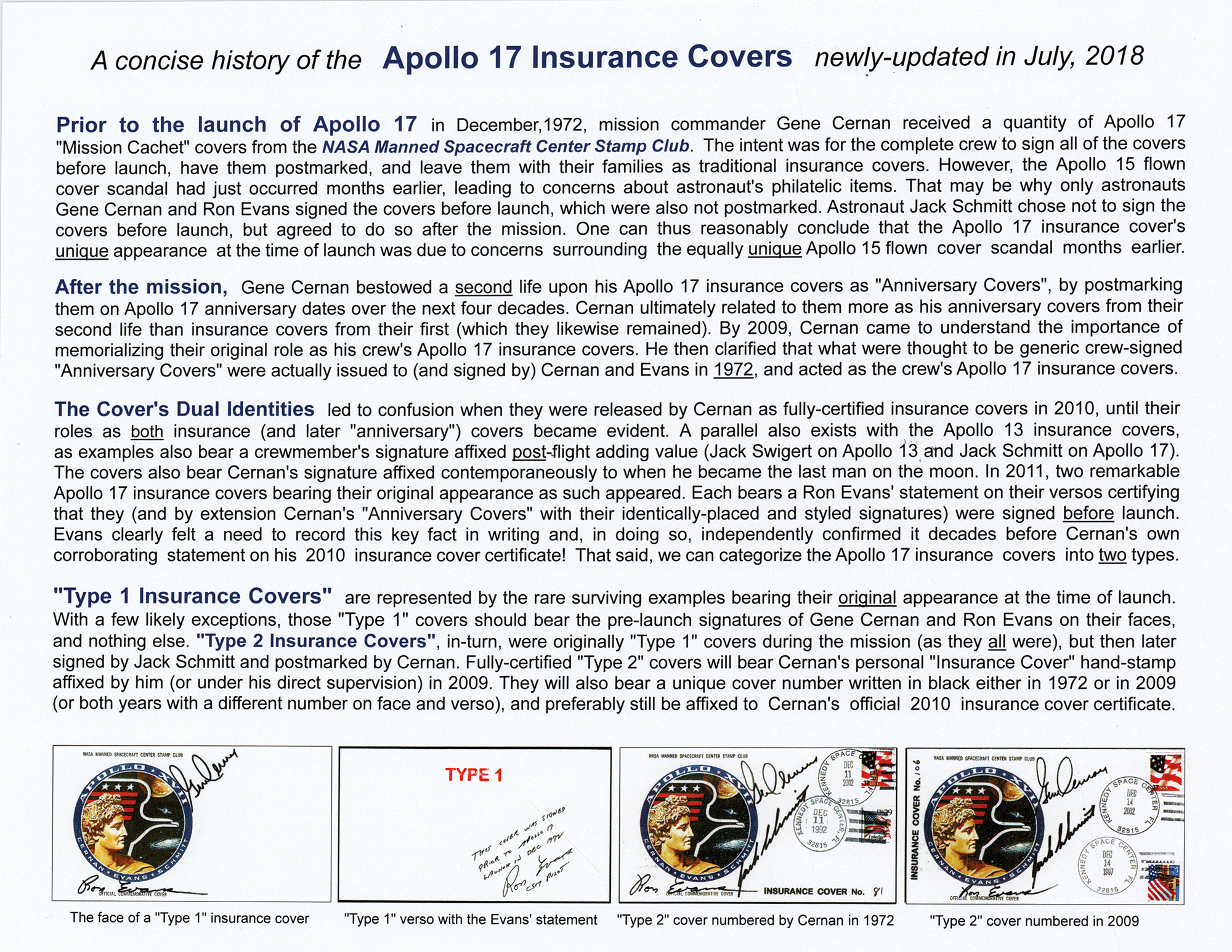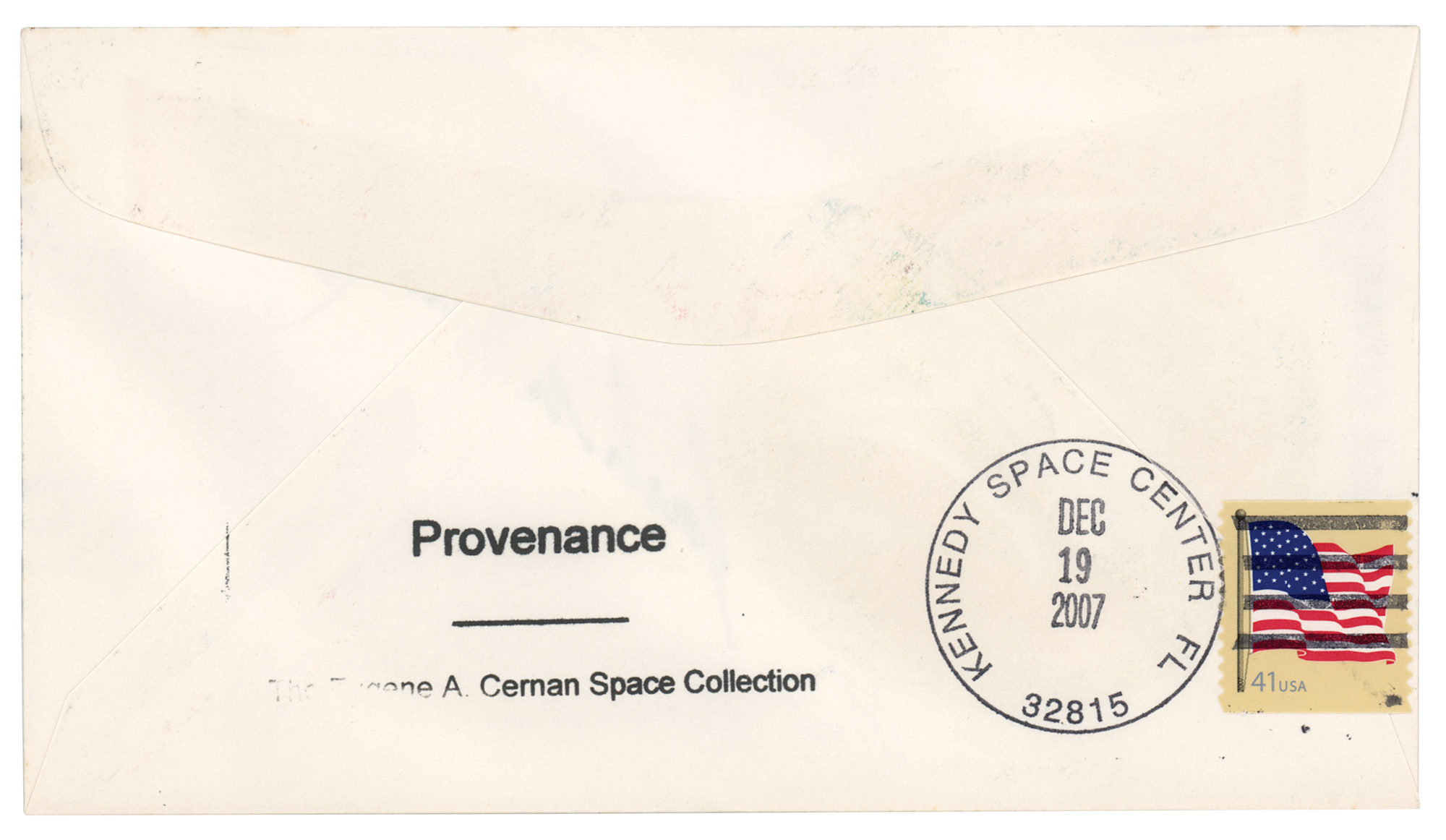 Accompanied by a notarized certificate of authenticity, serial numbered "227" and signed in black ink by Cernan, which features an image of him posing with four stacks of the insurance covers, and reads: "After the mission, I chose not to release my crew's Insurance Covers to collectors as the other Apollo crews had done with theirs. Instead, I kept most of the covers intact in order to postmark them on significant Apollo 17 anniversaries over the decades. I eventually chose to release the covers in 2009, at which time an 'Insurance Cover' hand-stamp was affixed to officially memorialize them as the Apollo 17 Insurance Covers." After this presentation was released, Gene Cernan issued a clarification indicating he did not consider them to be official 'insurance covers.' As the signatures are undoubtedly authentic and originated from Cernan's collection, we are offering this as an 'insurance-like cover.'