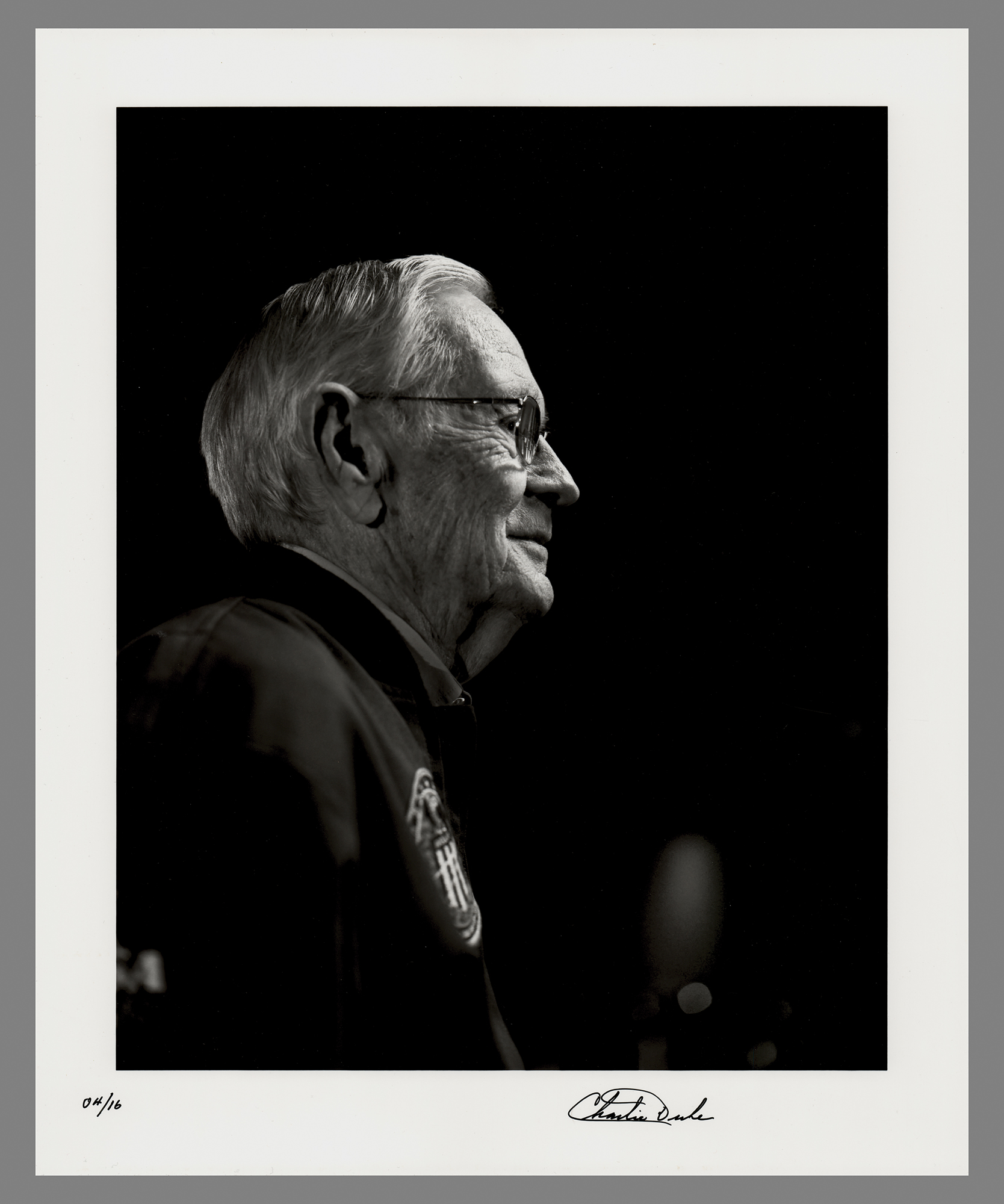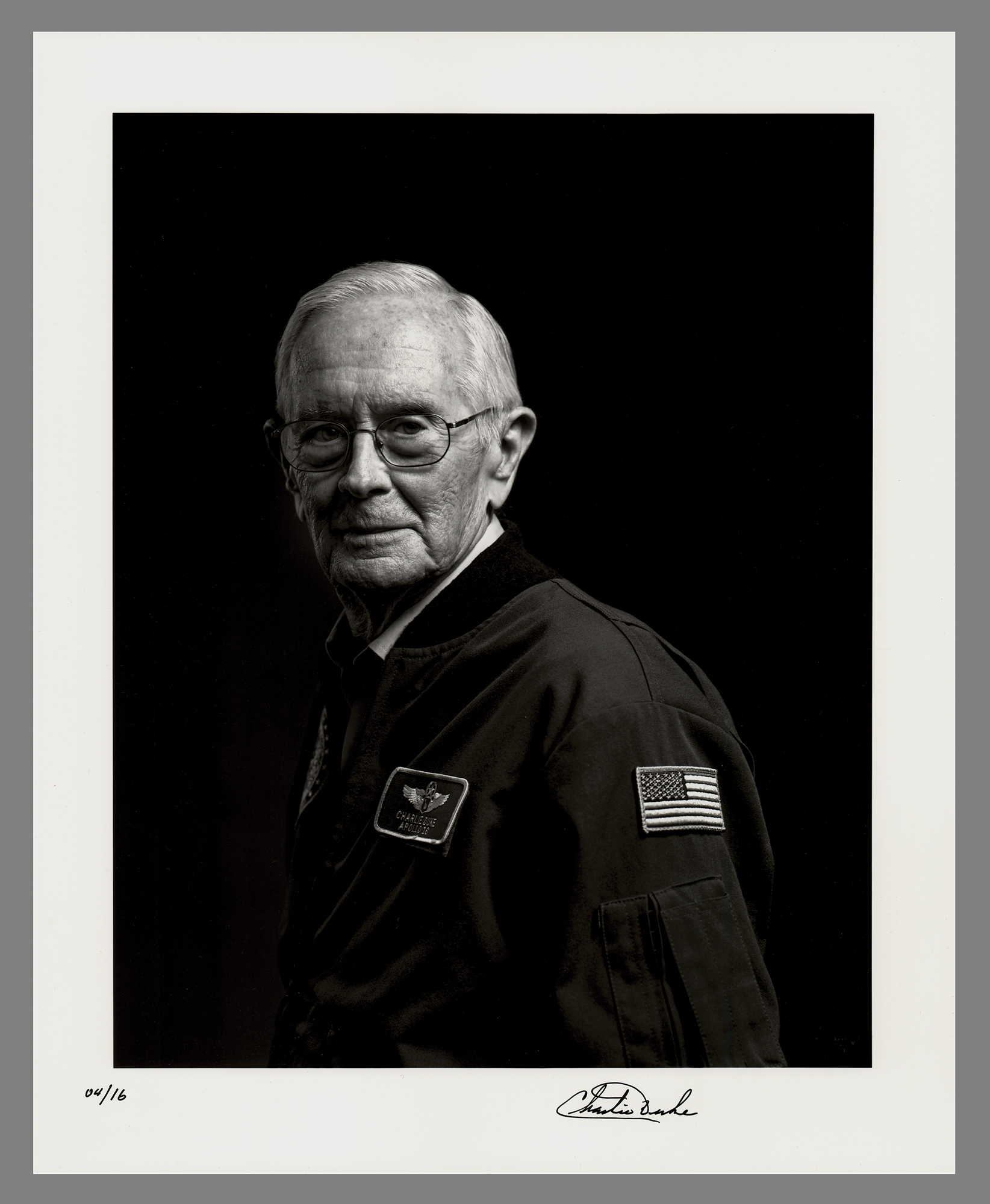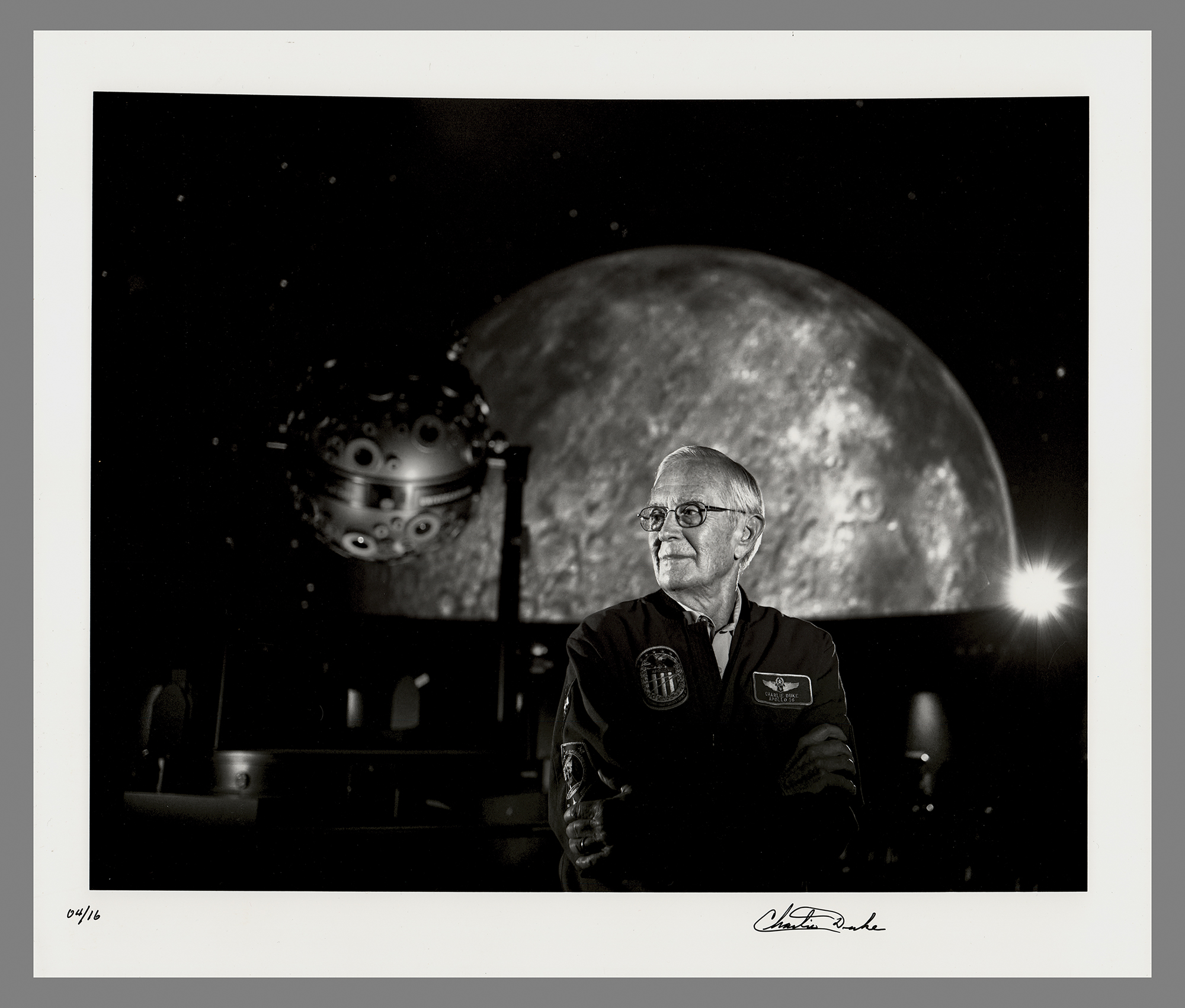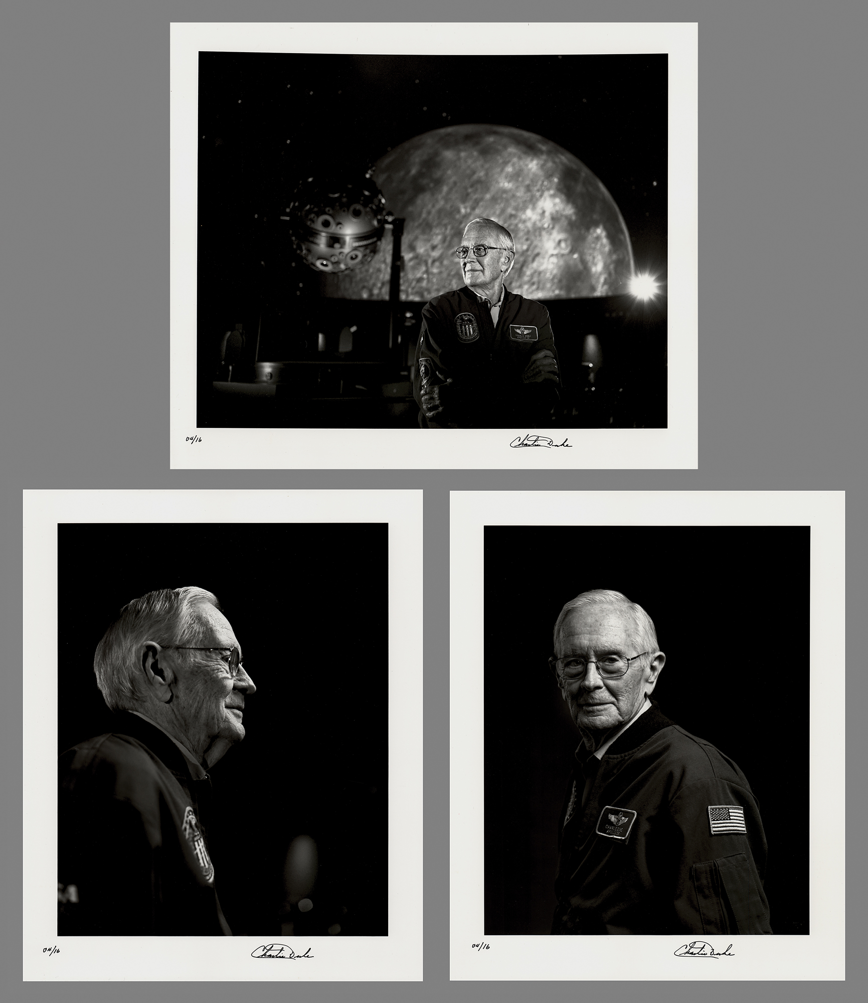 Limited edition set of three glossy silver gelatin photographic prints of Apollo 16 moonwalker Charlie Duke by Berlin-based photographer Klaus Mellenthin, each numbered 4/16 and signed in the lower border in black felt tip by Duke. The reverse of each photo is signed in pencil by the photographer. Printed on high-end Baryta paper, the photos range in size from 13.5 x 16.75 to 20 x 17. In overall very fine condition. Accompanied by a certificate of authenticity from Florian Noller of Been in Space, which contains an image of Duke at the time of signing.