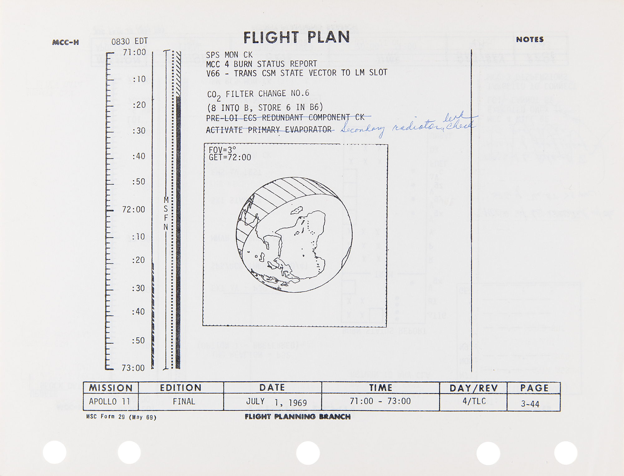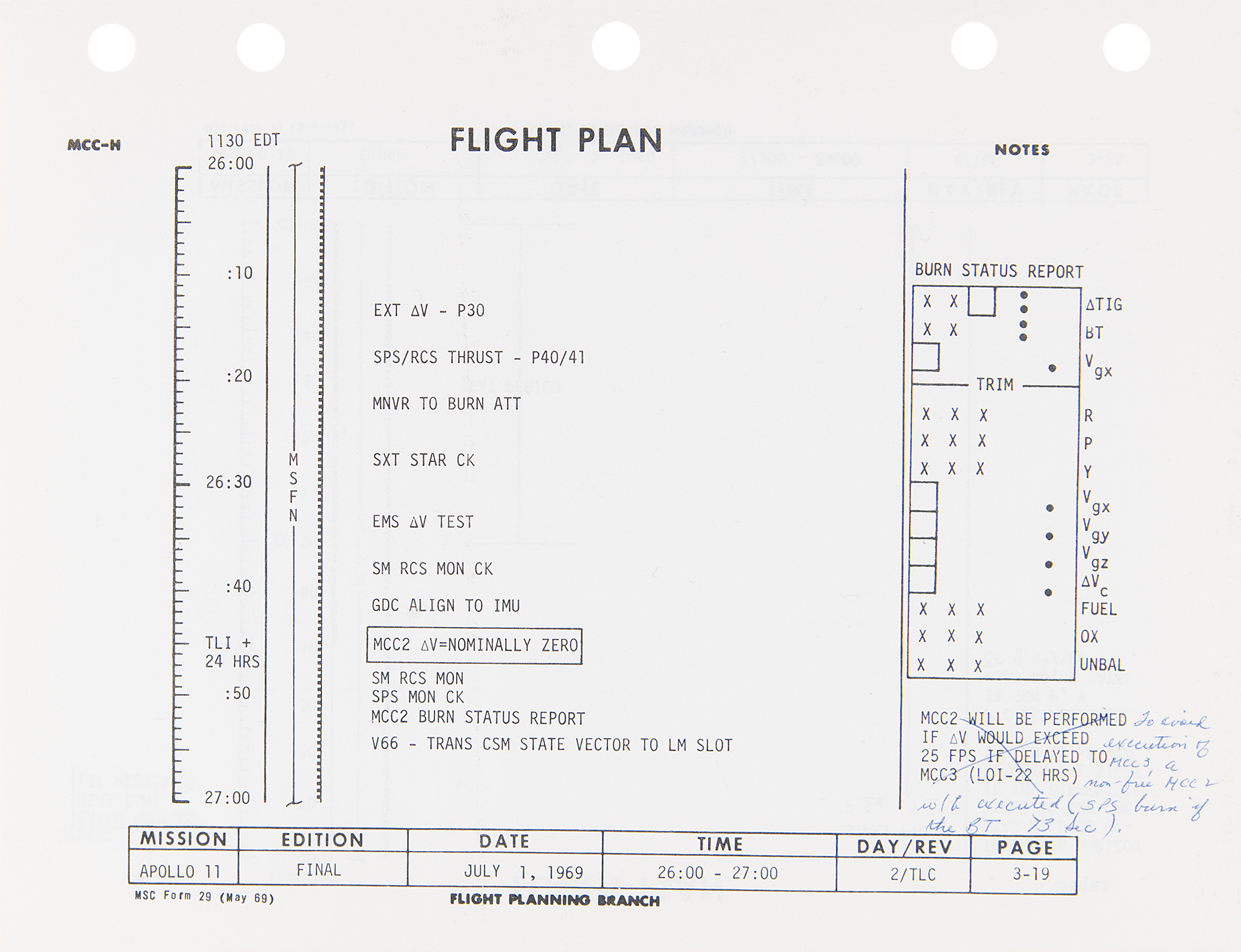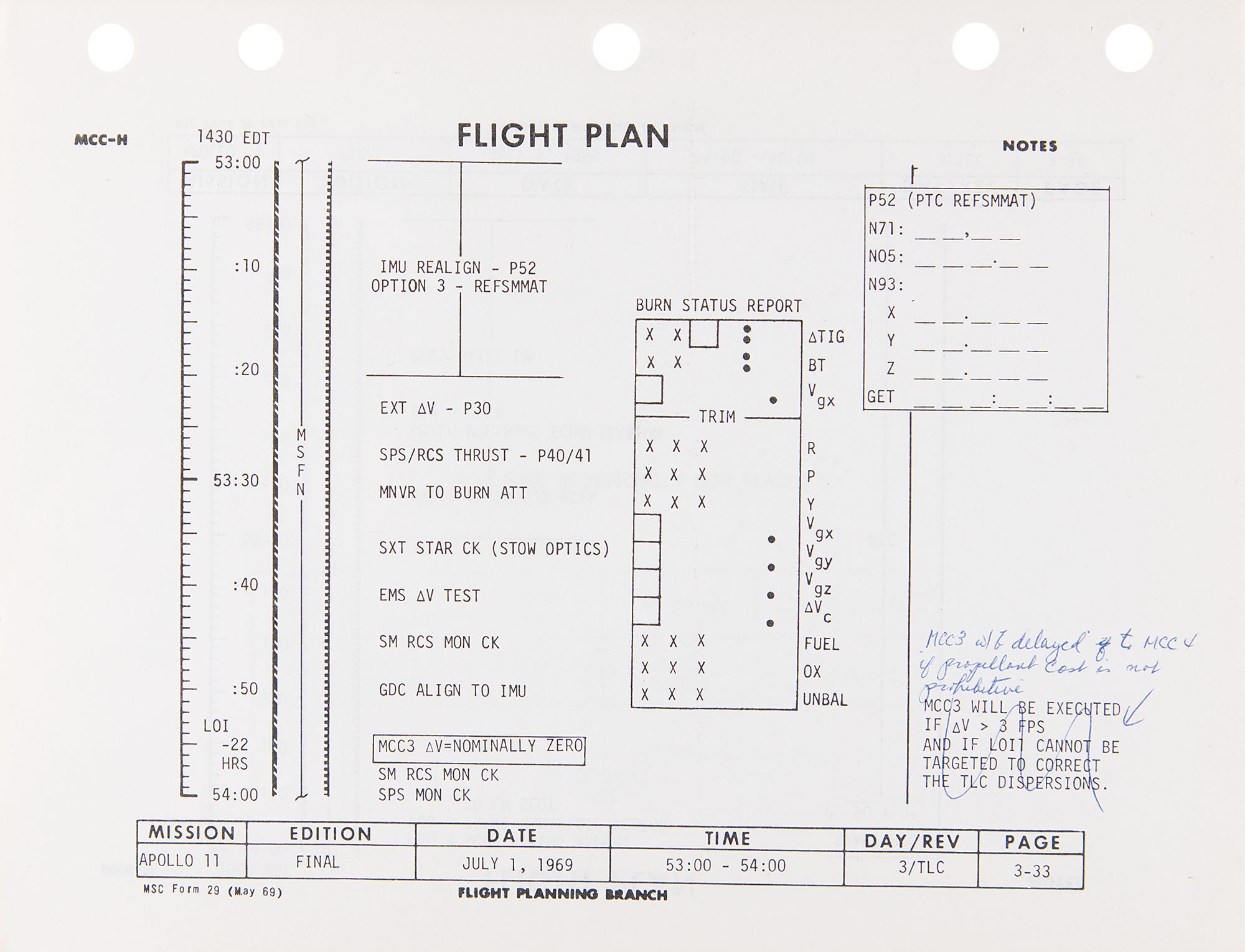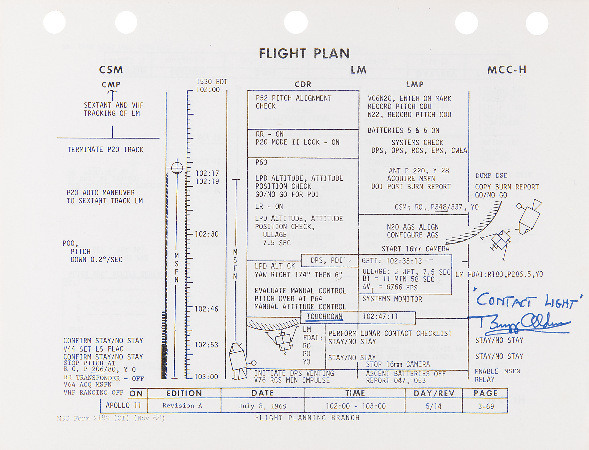 Mission Control-used Apollo 11 flight plan, signed twice by Aldrin, who makes note of the LM's touchdown and his first lunar words, “Contact Light”