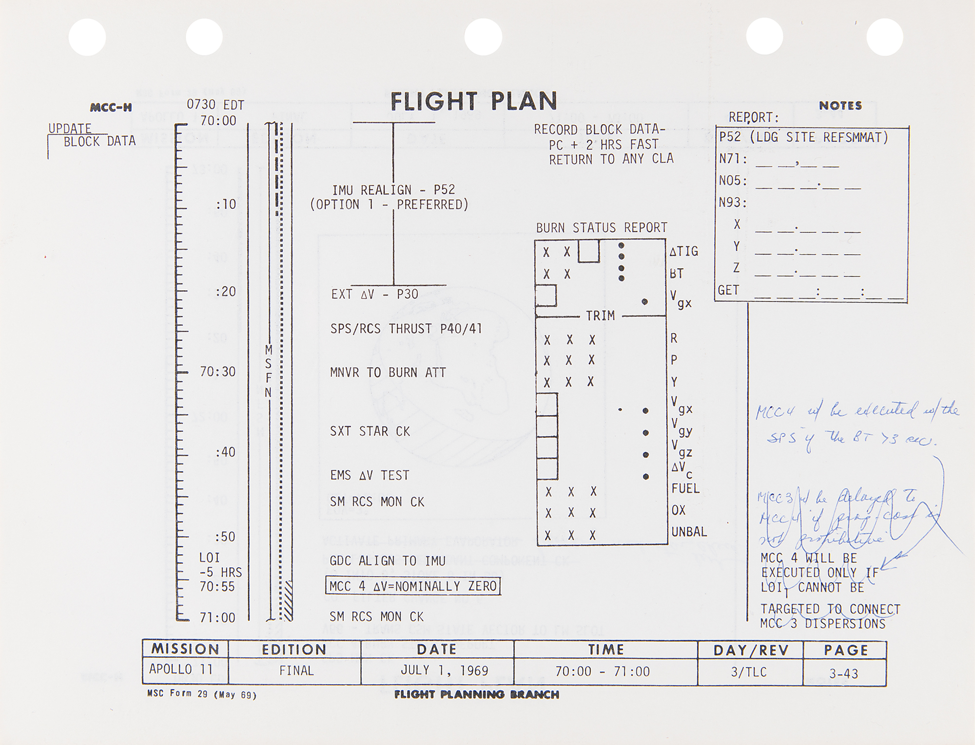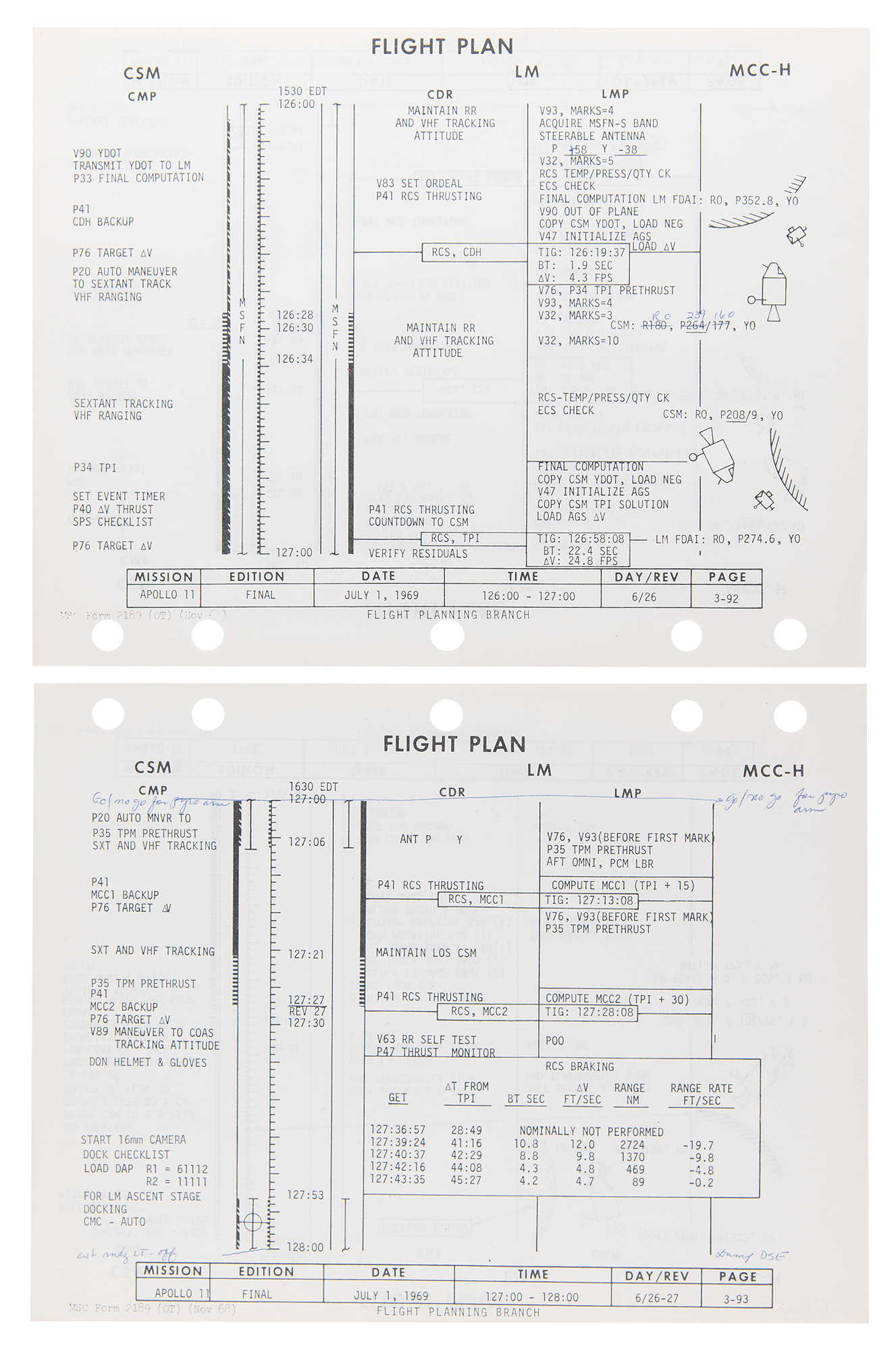 Historic unbound Mission Control-used “Final Apollo 11 Flight Plan” NASA manual (AS-506/CSM-107/LM-5), approximately 300 pages, 8 x 10.5, dated July 1, 1969, signed on the front cover in blue felt tip, “Buzz Aldrin, Apollo XI LMP,” who also signs inside on the lunar touchdown page (3-69), “'Contact Light,' Buzz Aldrin.” The manual is comprised of six sections: general summaries and schedules, update forms, detailed timeline, detailed test objectives, consumables, and flight plan summary. This particular manual contains 11 pages that feature manuscript notations made in real-time by a Houston flight controller during the historic mission; the controller's ownership signature is present to front cover. In fine condition, with wear to left edge of front cover, and the back cover missing. As mankind's first lunar landing mission, the flight plan for Apollo 11 was among the most important of all documents prepared by NASA. A significant, detailed piece documenting the minute-by-minute plan for the historic first journey to the surface of the moon, signed twice by the second man on the moon.
