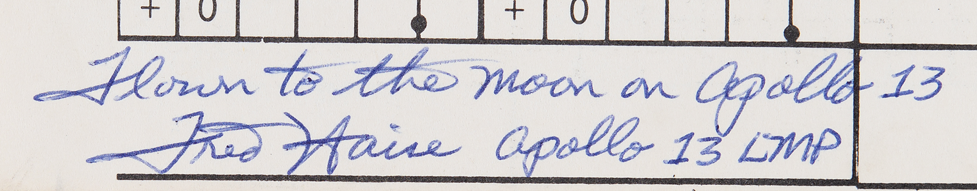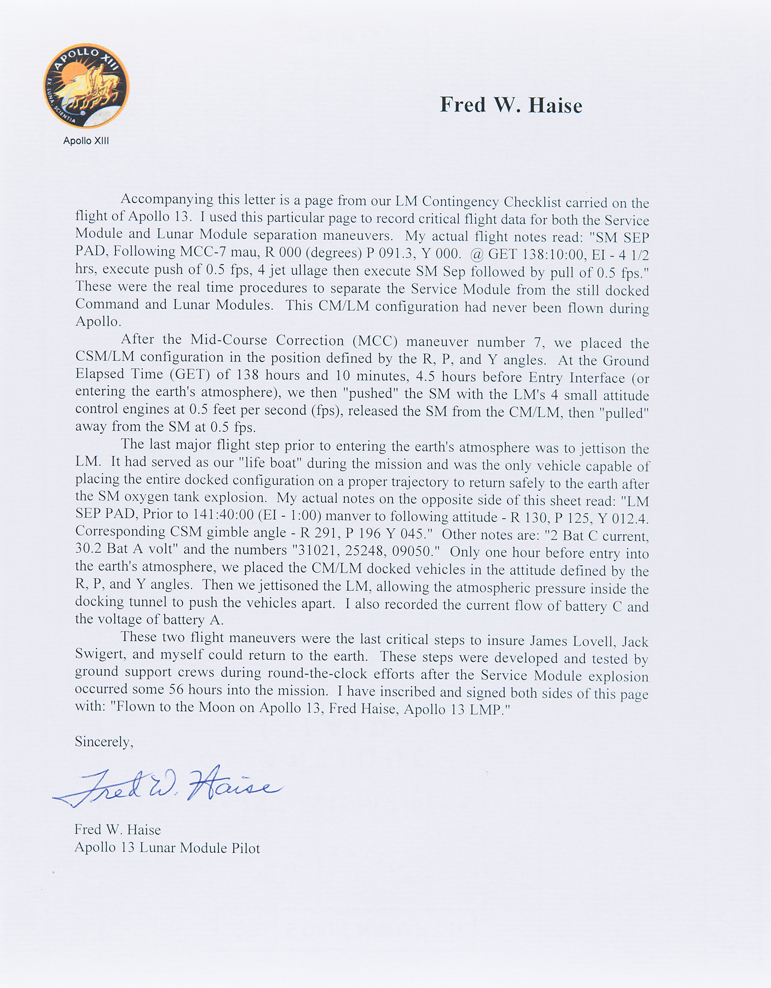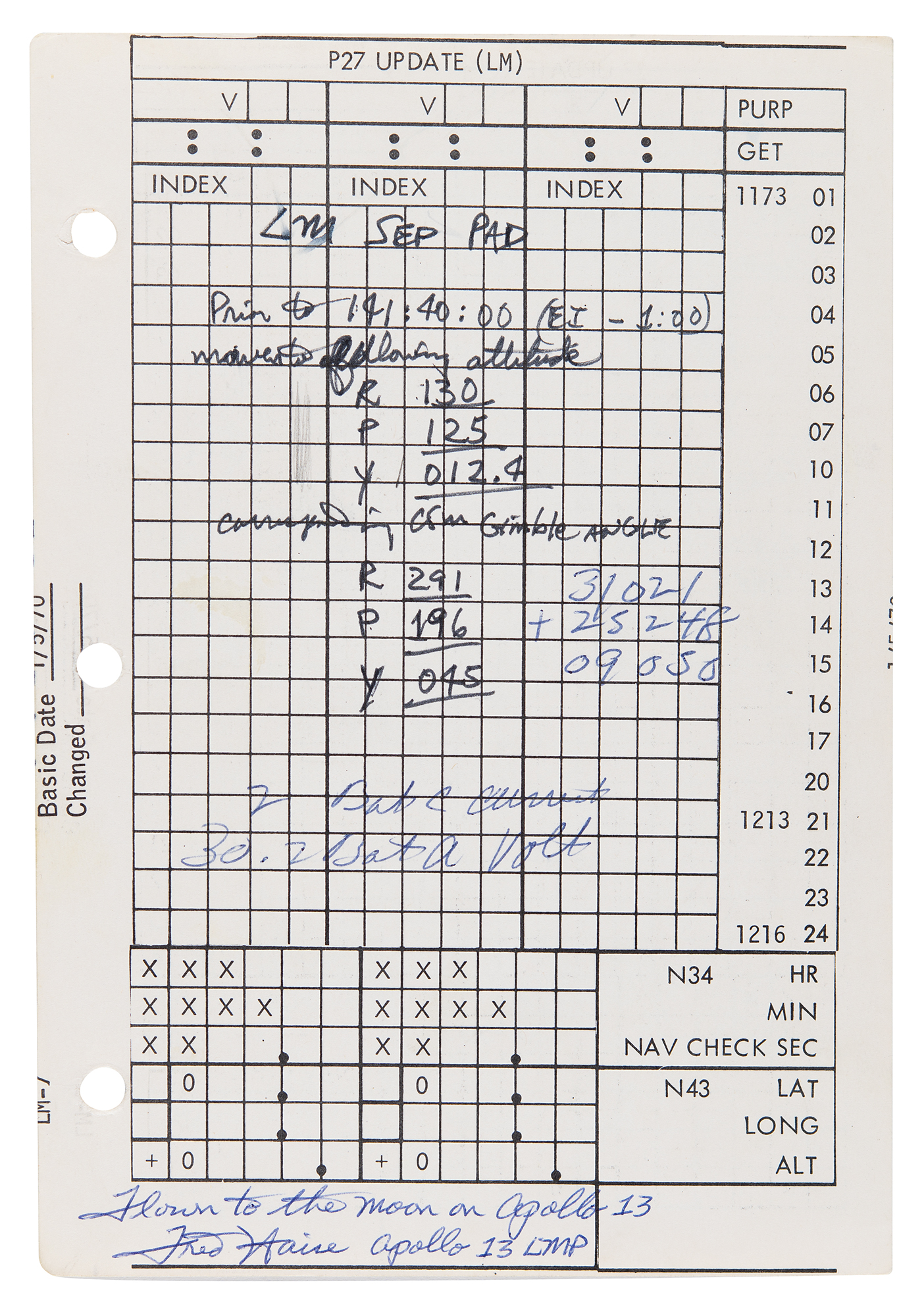 Flown double-sided ‘LM Contingency Checklist’ page carried into lunar orbit during the Apollo 13 mission, 5.5 x 8, signed and flight-certified in blue ballpoint, “Flown to the moon on Apollo 13, Fred Haise, Apollo 13 LMP," who signs again in the same manner on the opposite side. Both checklist pages are identified as “LM-7” and “P27 Update (LM),” and contain handwritten in-flight notations made in ballpoint and felt tip by Haise; these annotations proved vital to the safe rescue of the Apollo 13 astronauts as they relate to the essential jettisoning of both the damaged Service Module and the crew’s ‘lifeboat,’ the Lunar Module Aquarius. In fine condition.